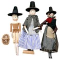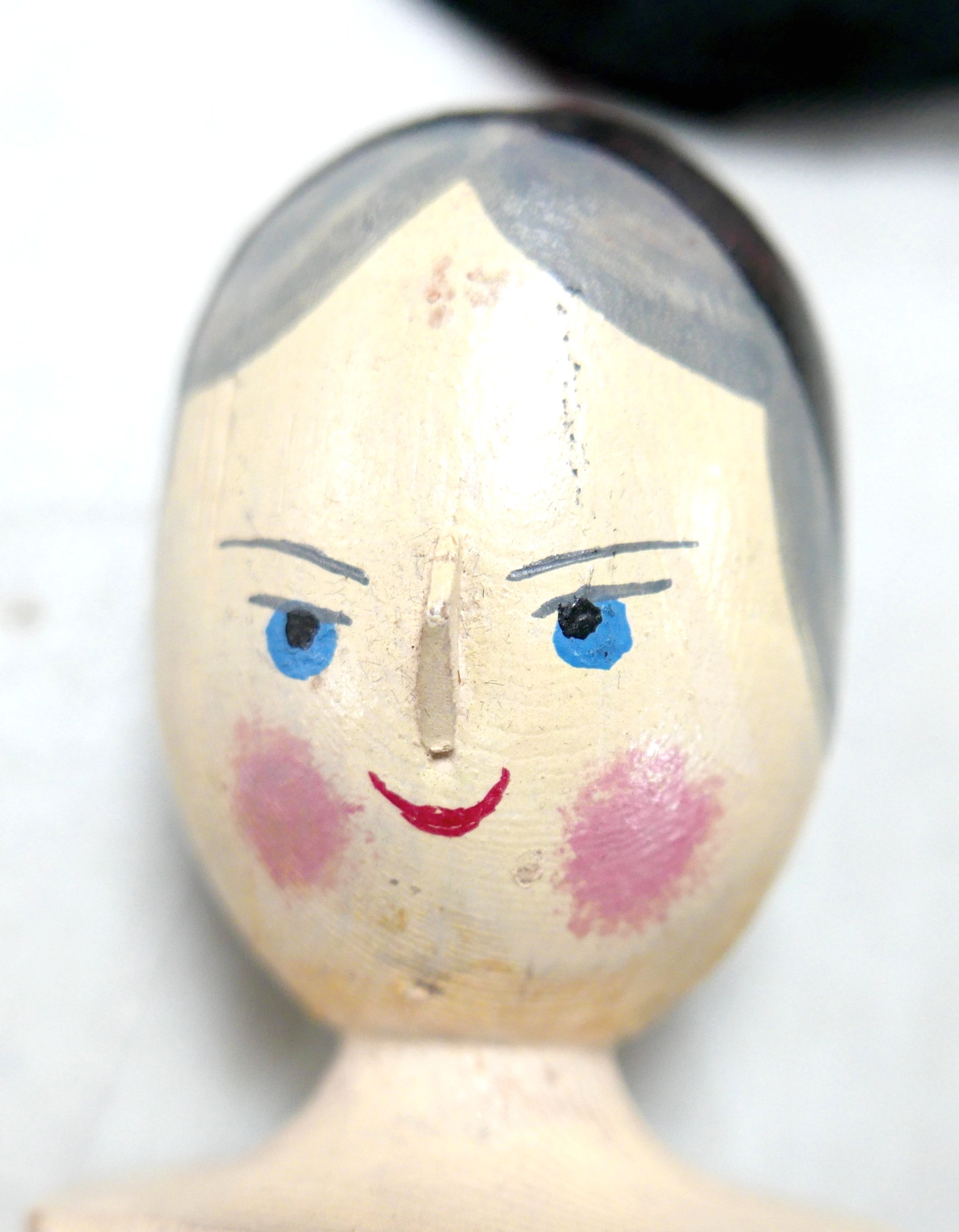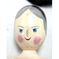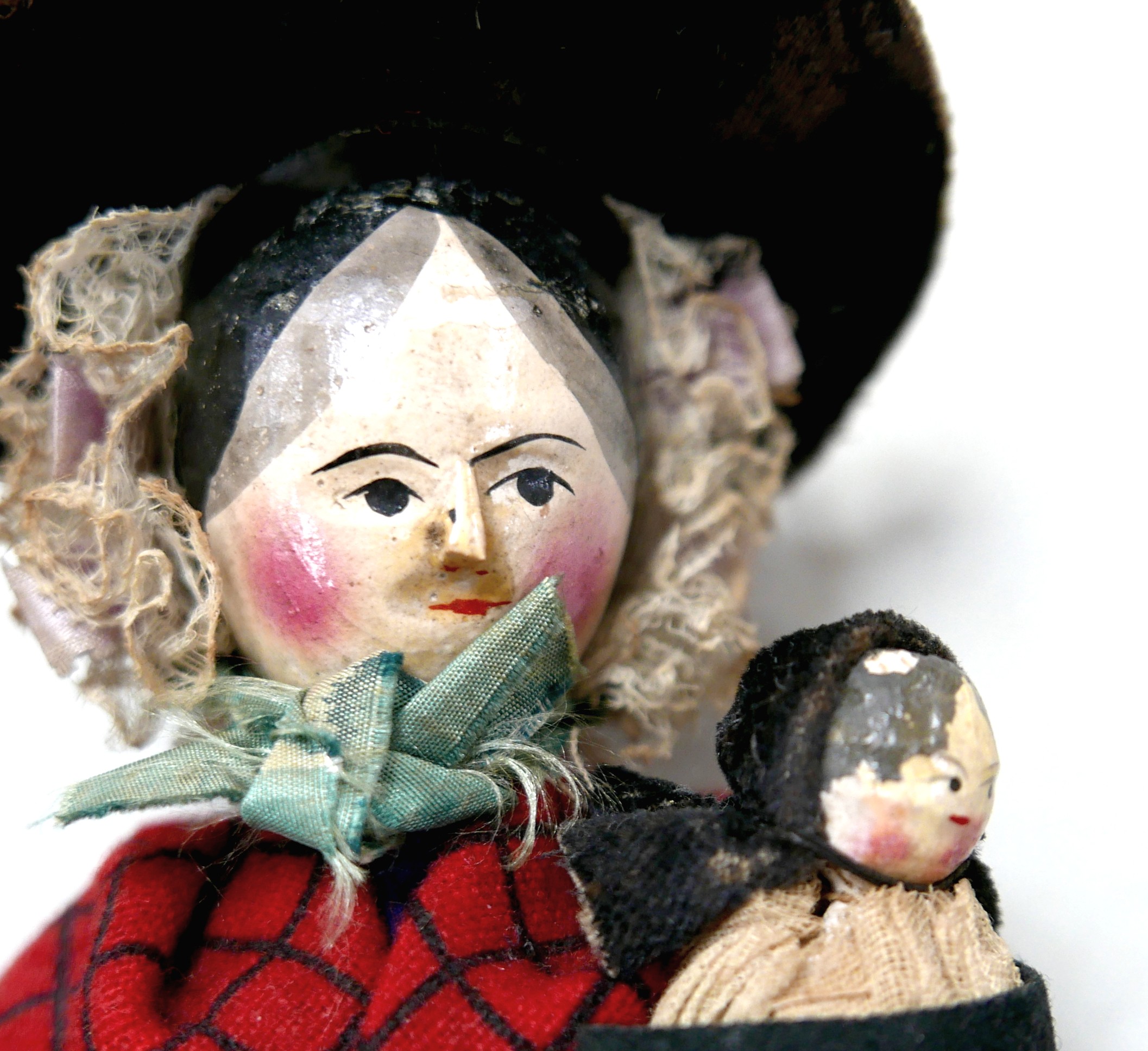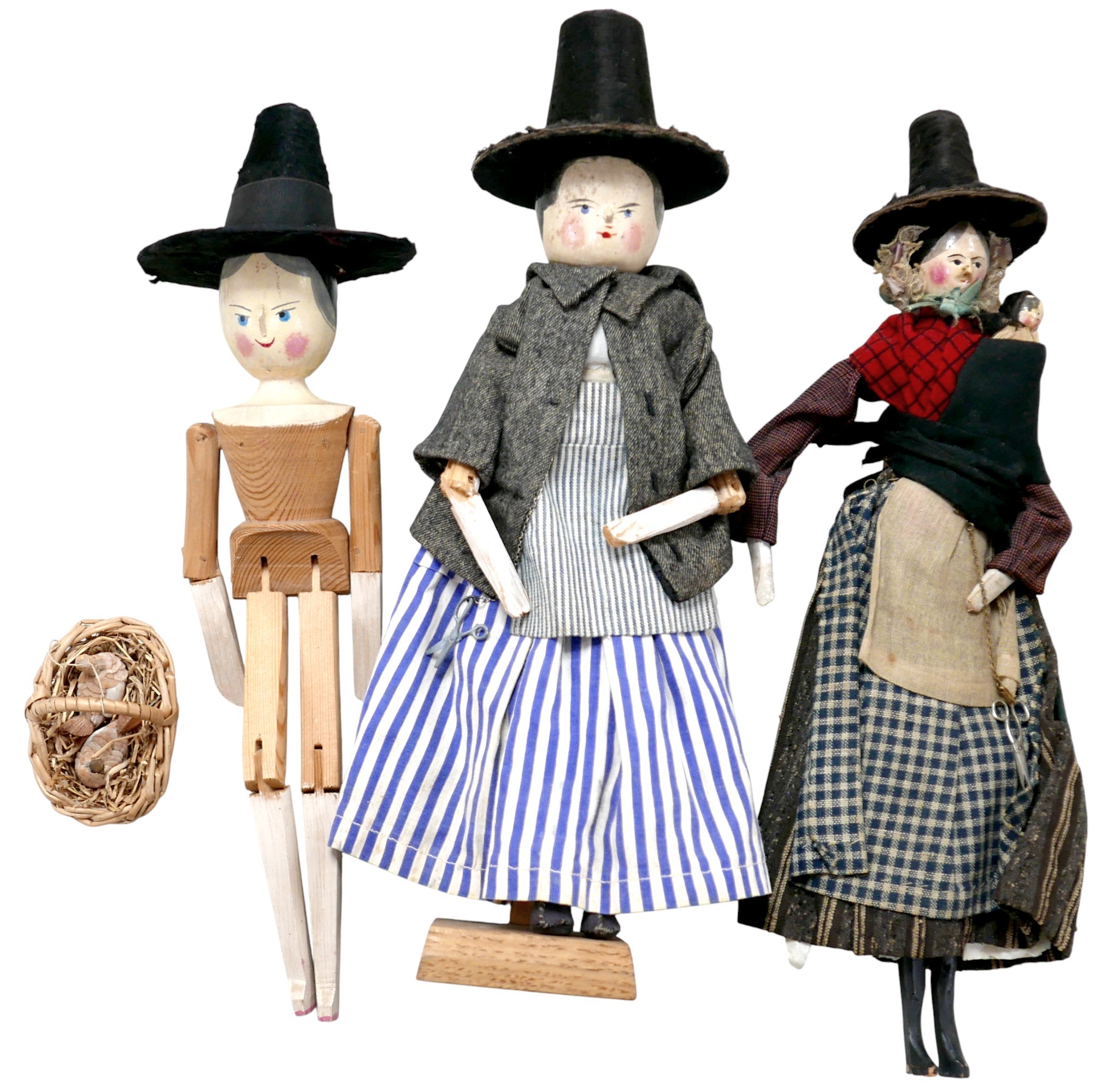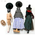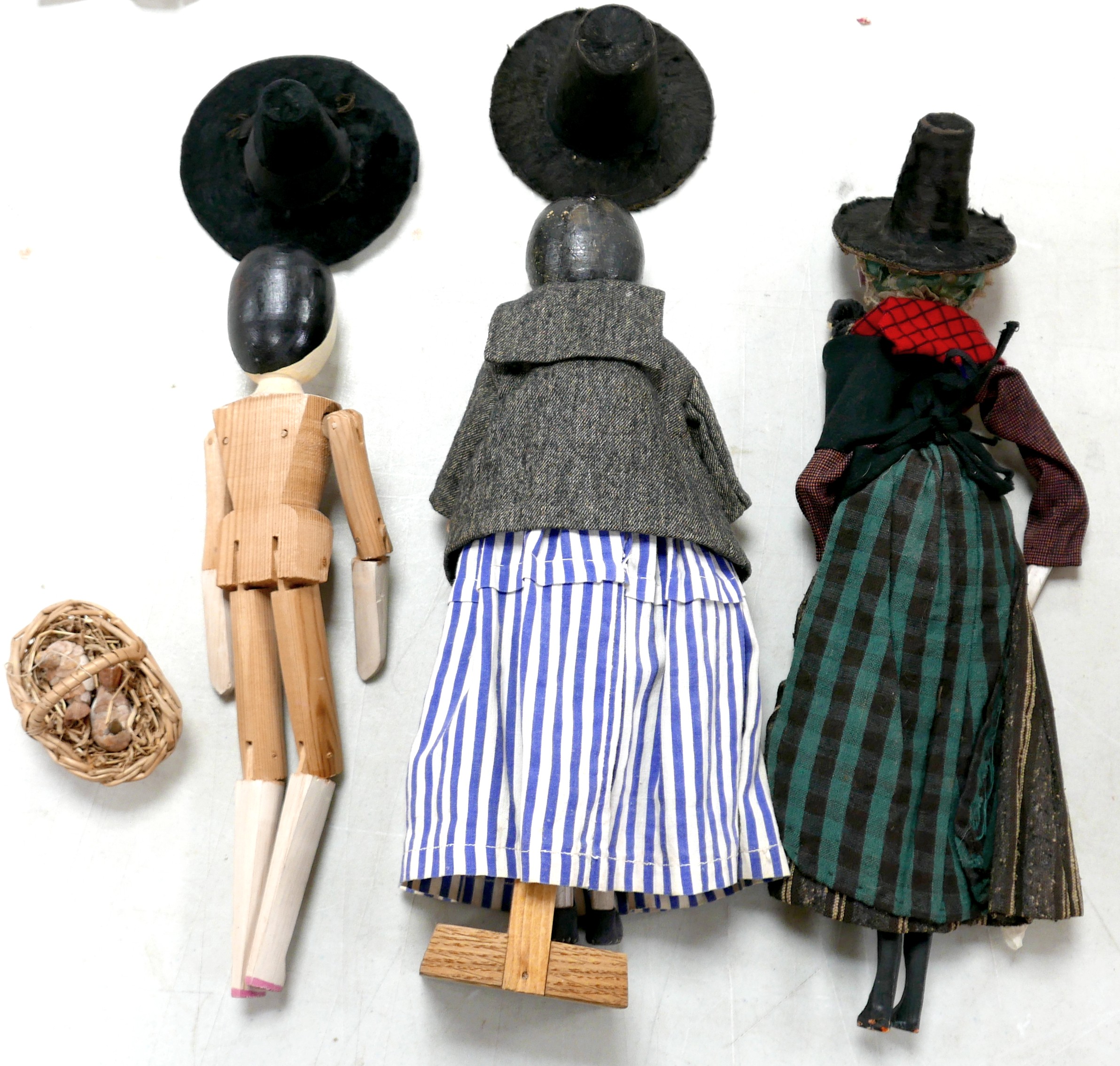 Three early 20th century peg dolls, including two in traditional Welsh dress, tallest 32cm, as well as other accessories. (1 box)