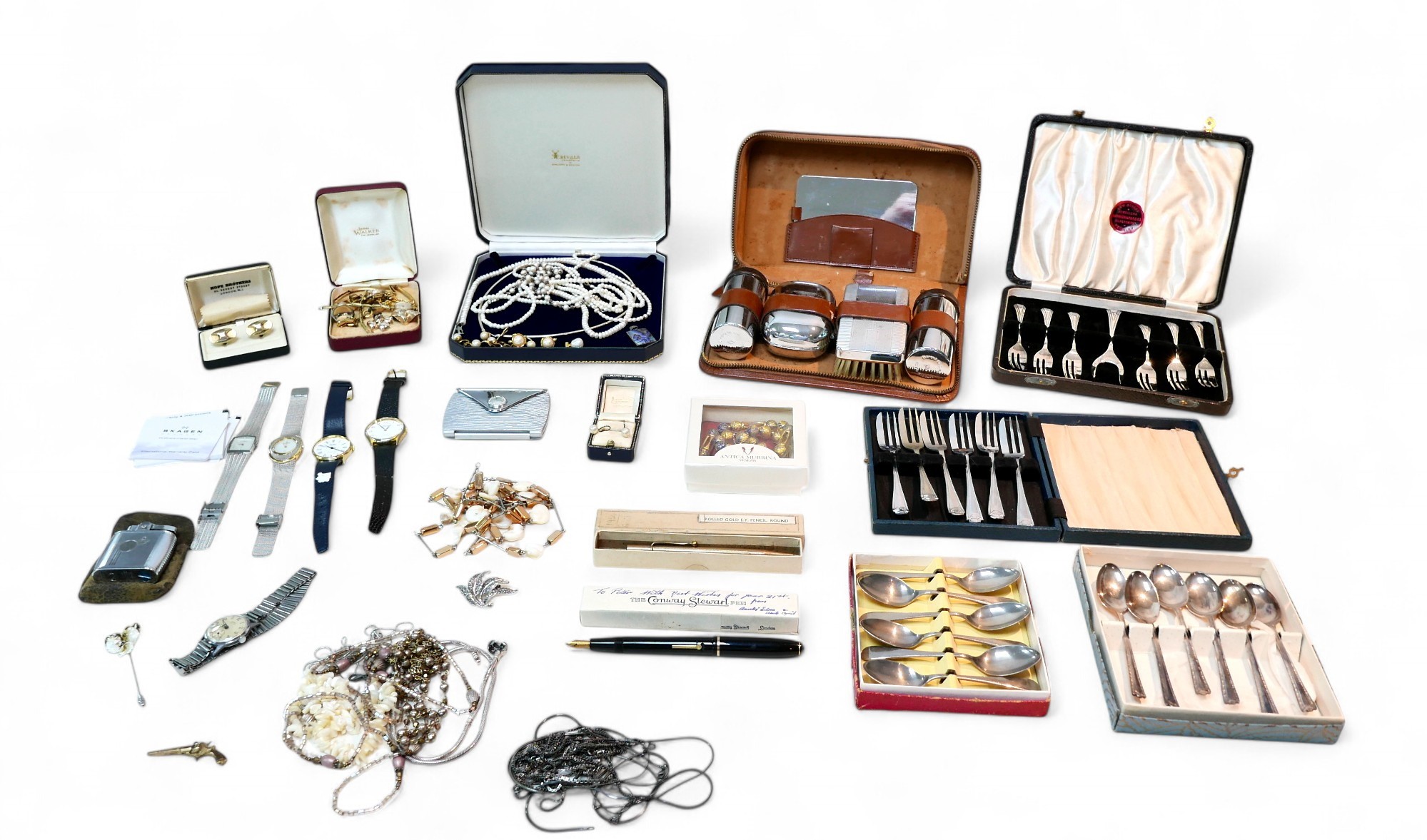 A collection of costume jewellery and other items, including some silver necklaces, 1.5toz overall, together with a 14ct gold nibbed fountain pen, as well as two Skagen wristwatches. (qty)