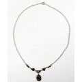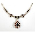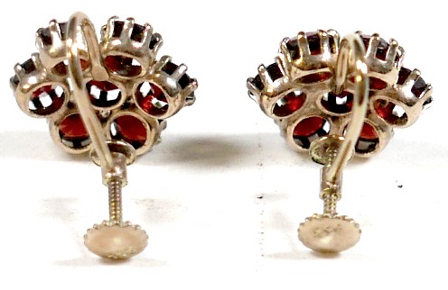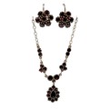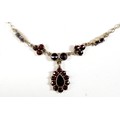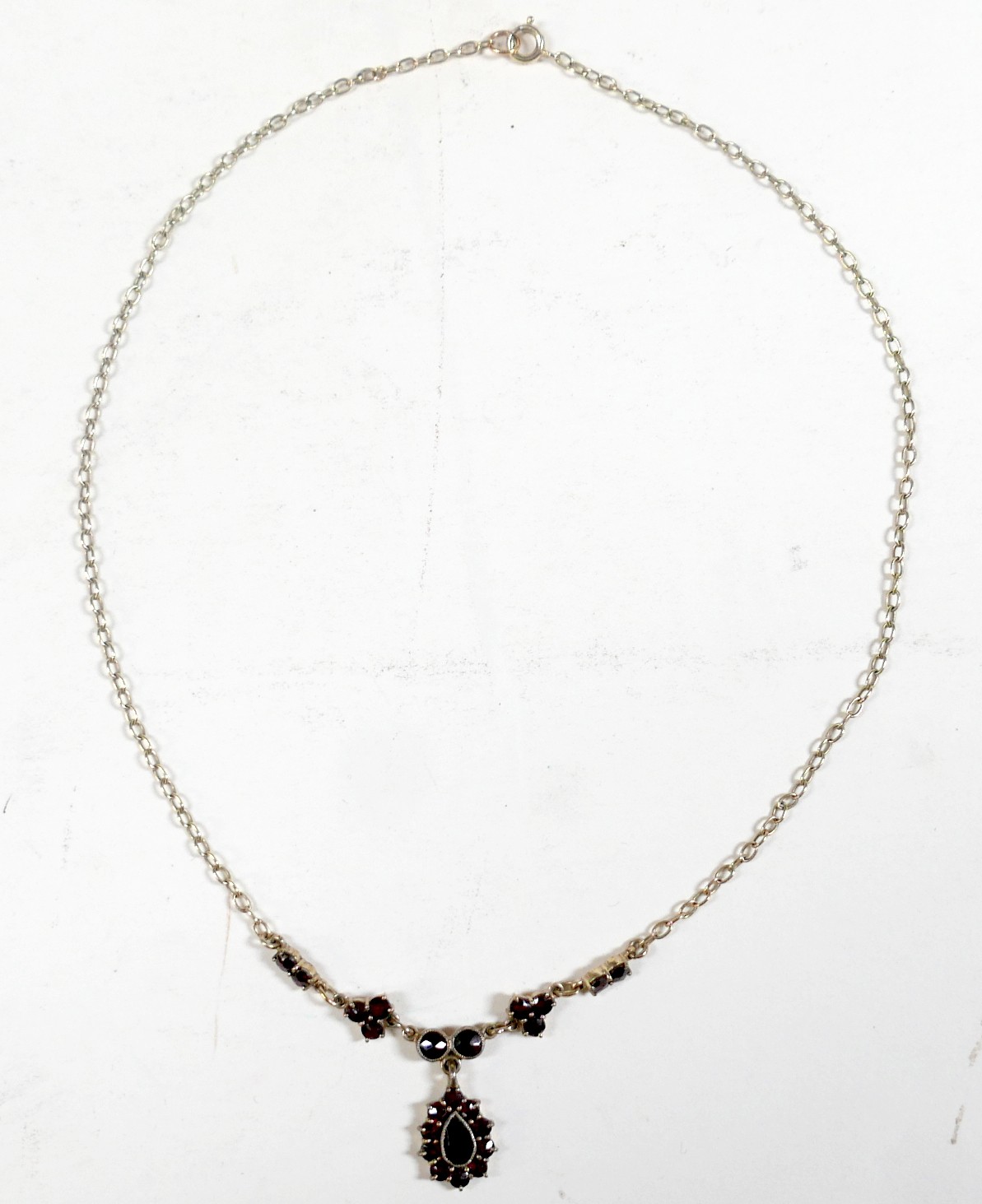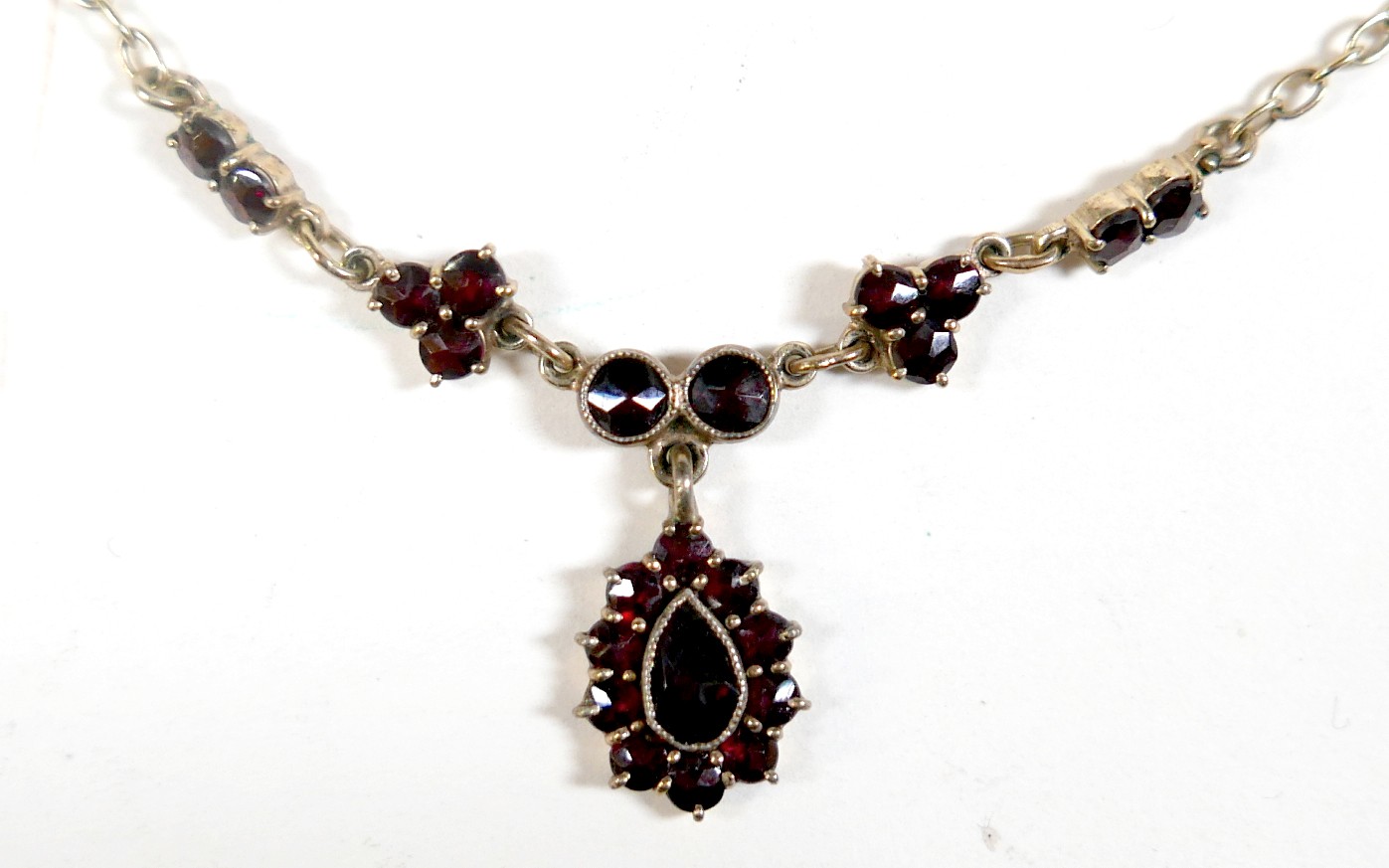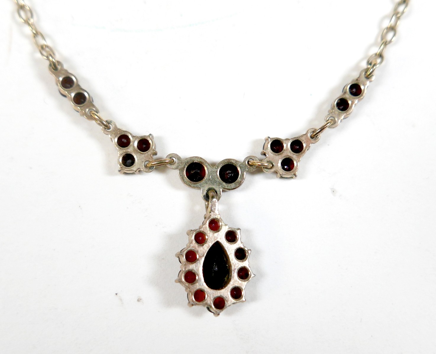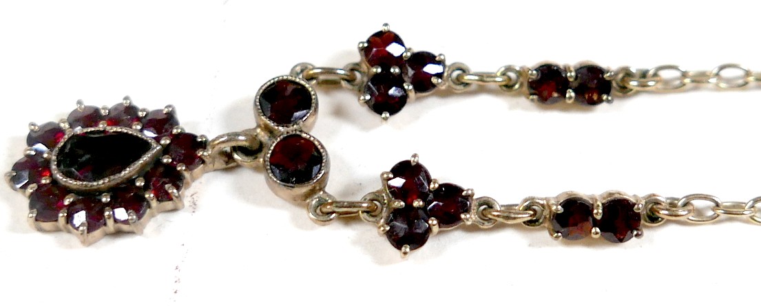 A 9ct yellow gold garnet necklace and a pair of 9ct yellow gold screw back garnet earrings, necklace 42cm long, earrings 14mm diameter, total weight 8.8g.