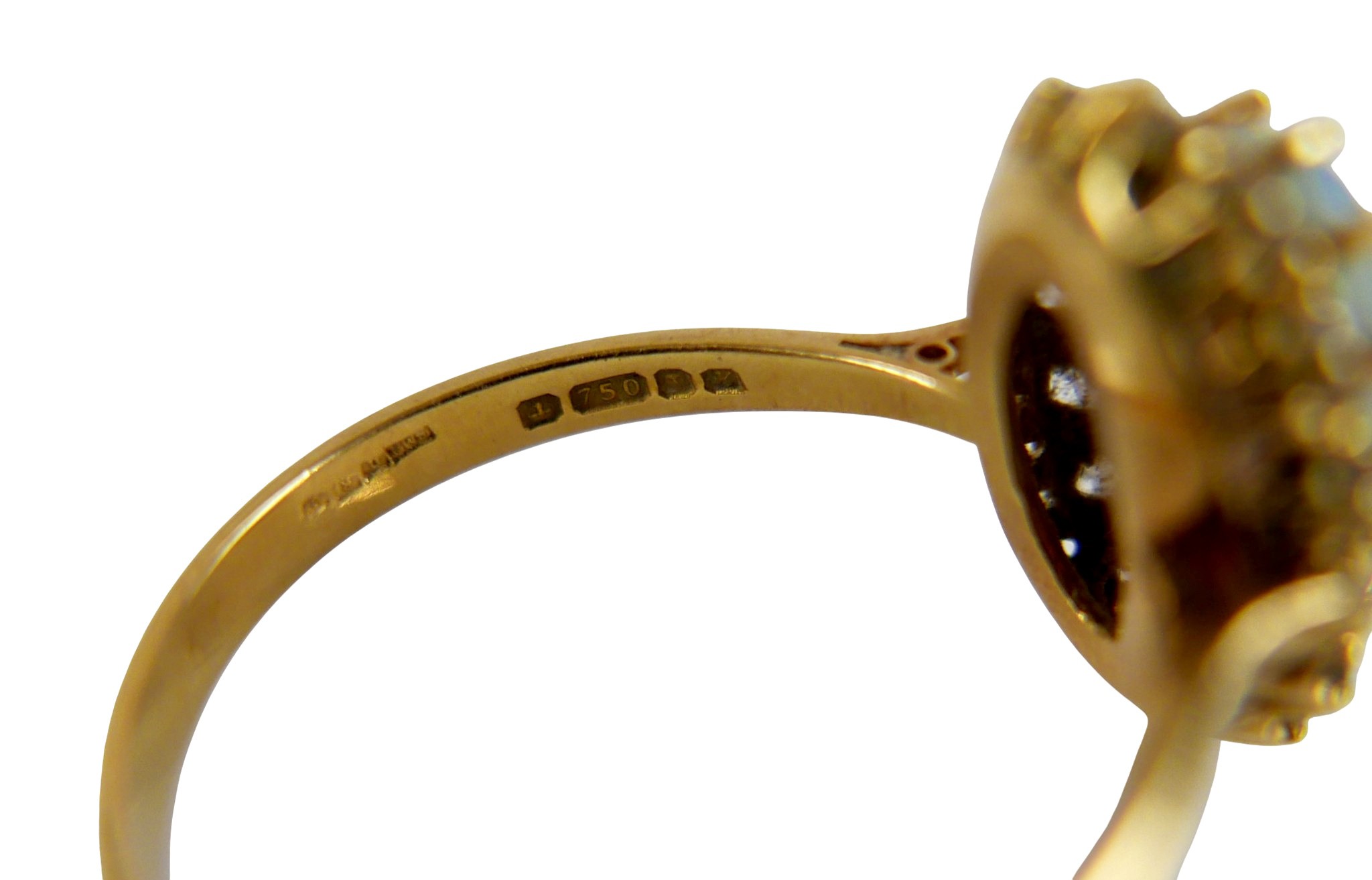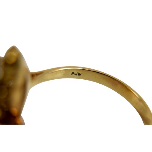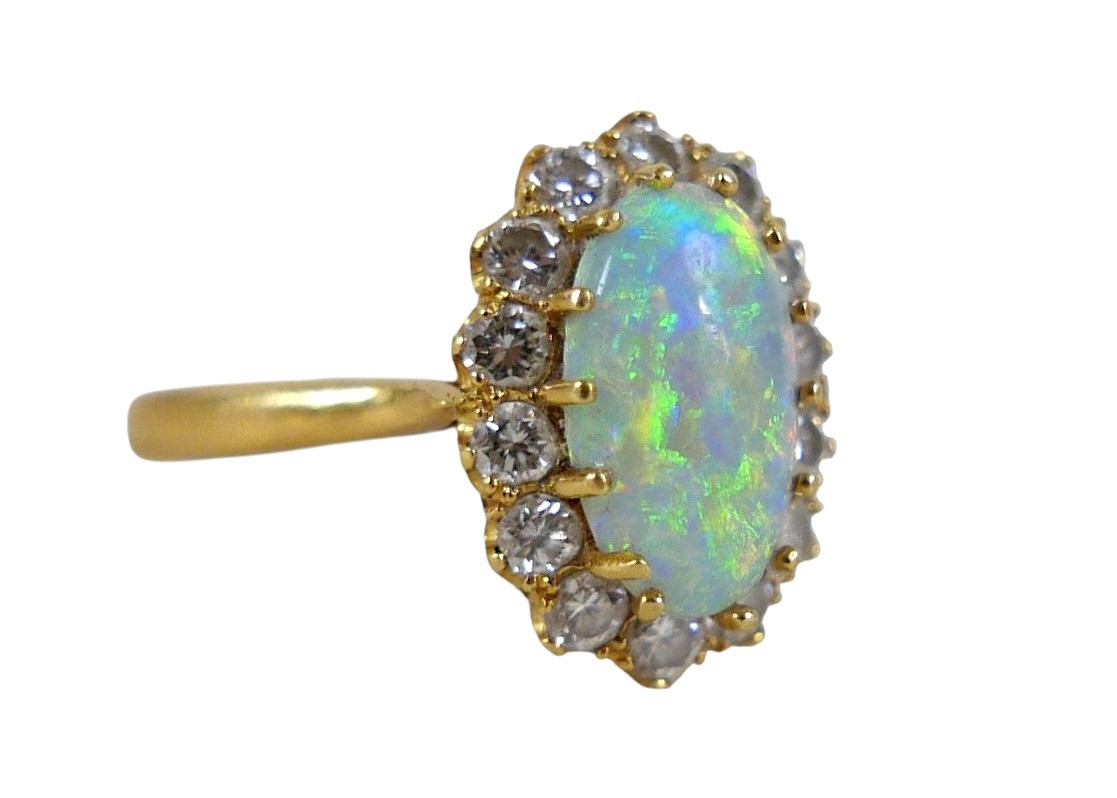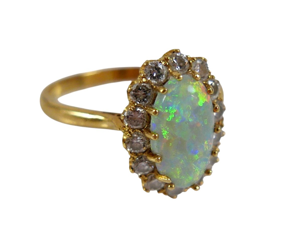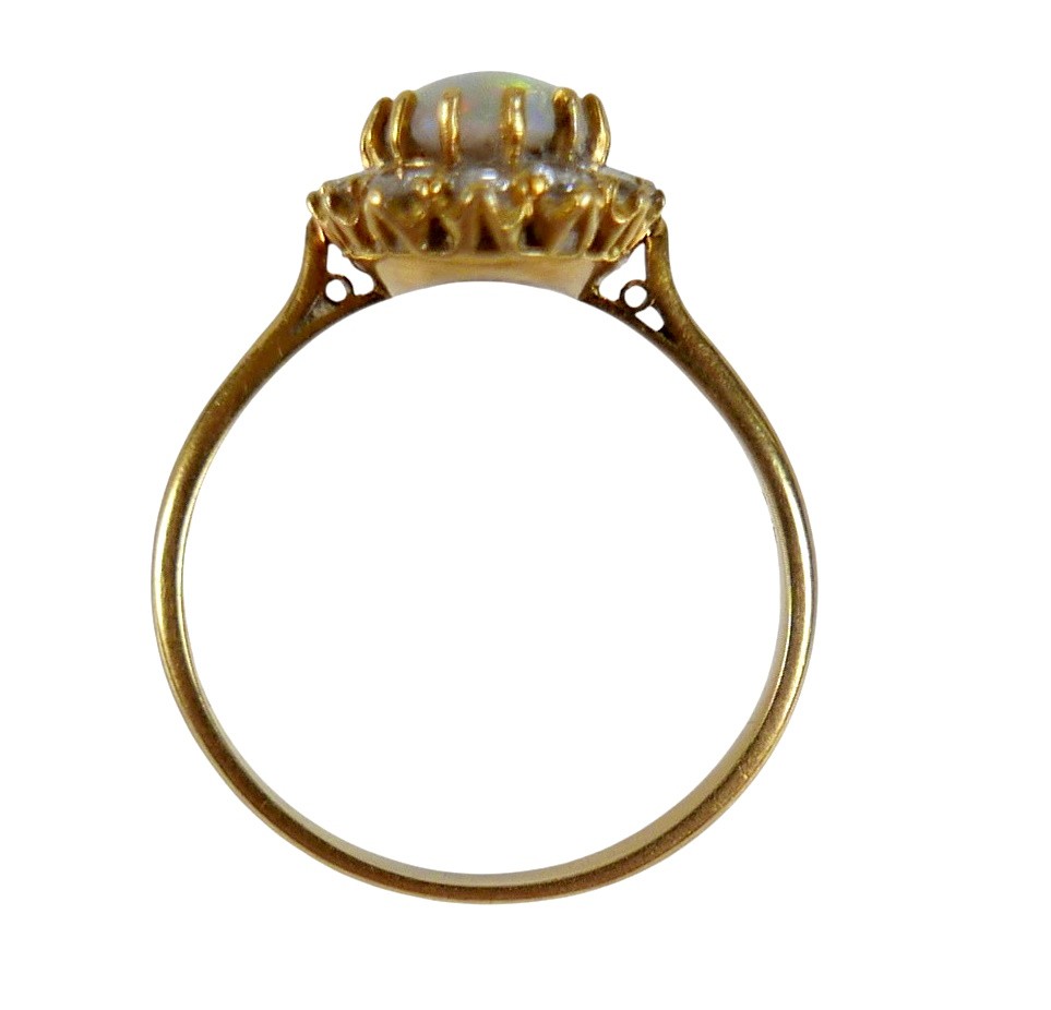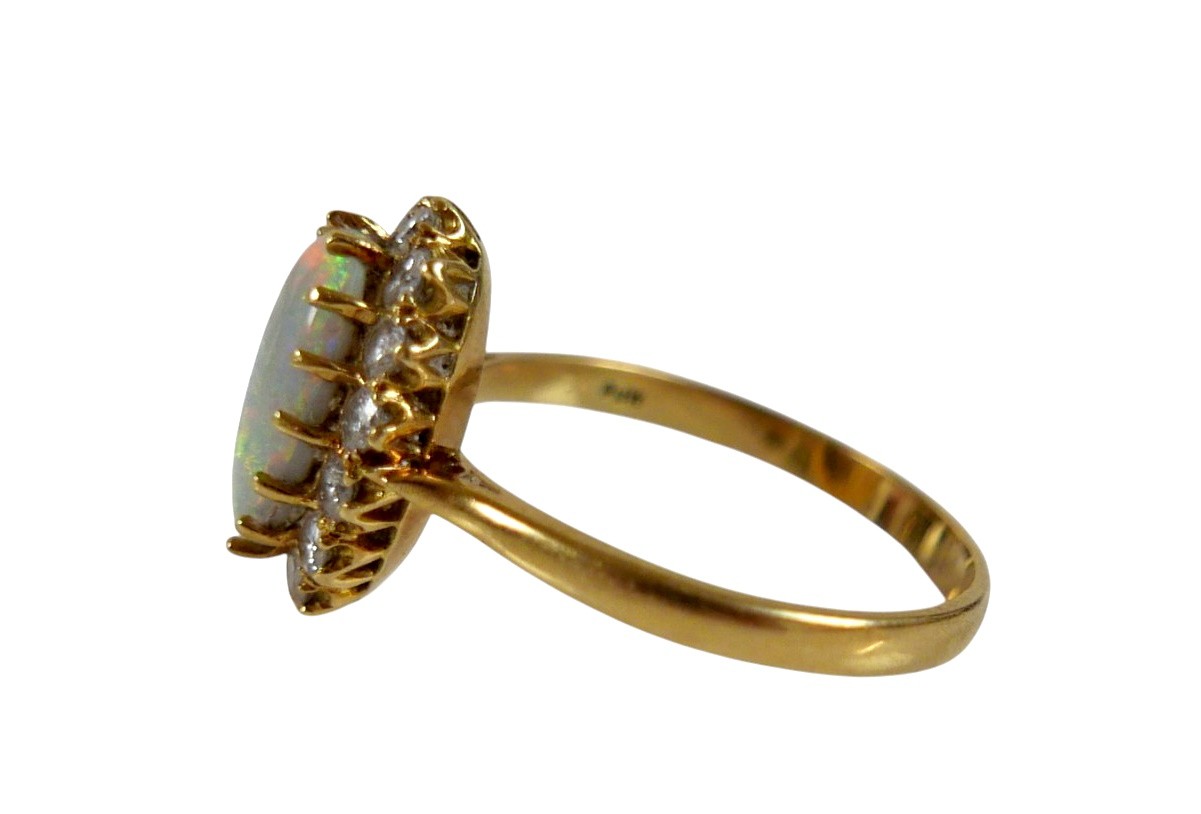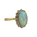 An 18ct yellow gold opal and diamond ring head size 14 by 11...