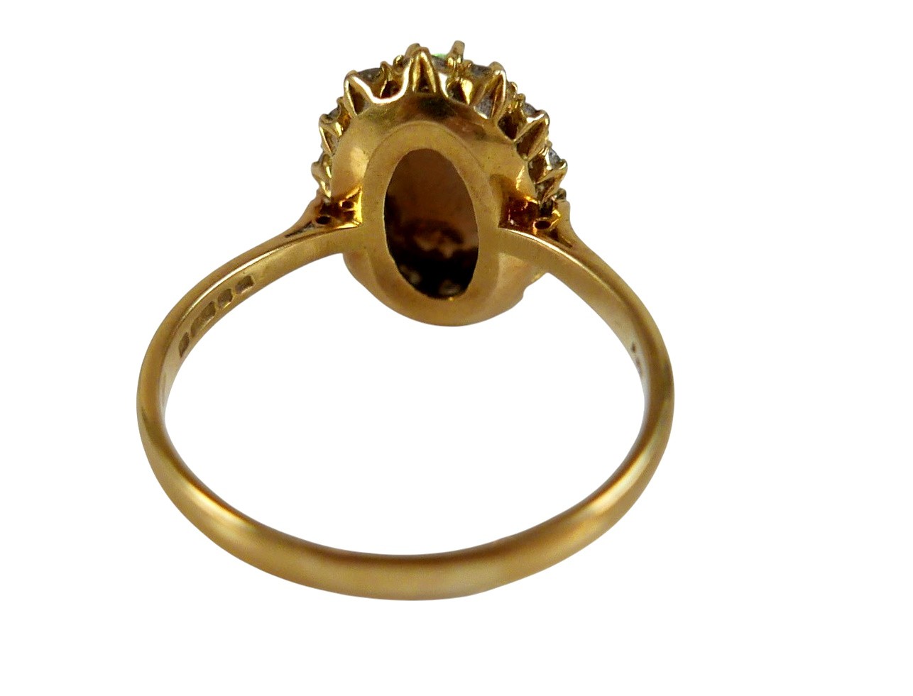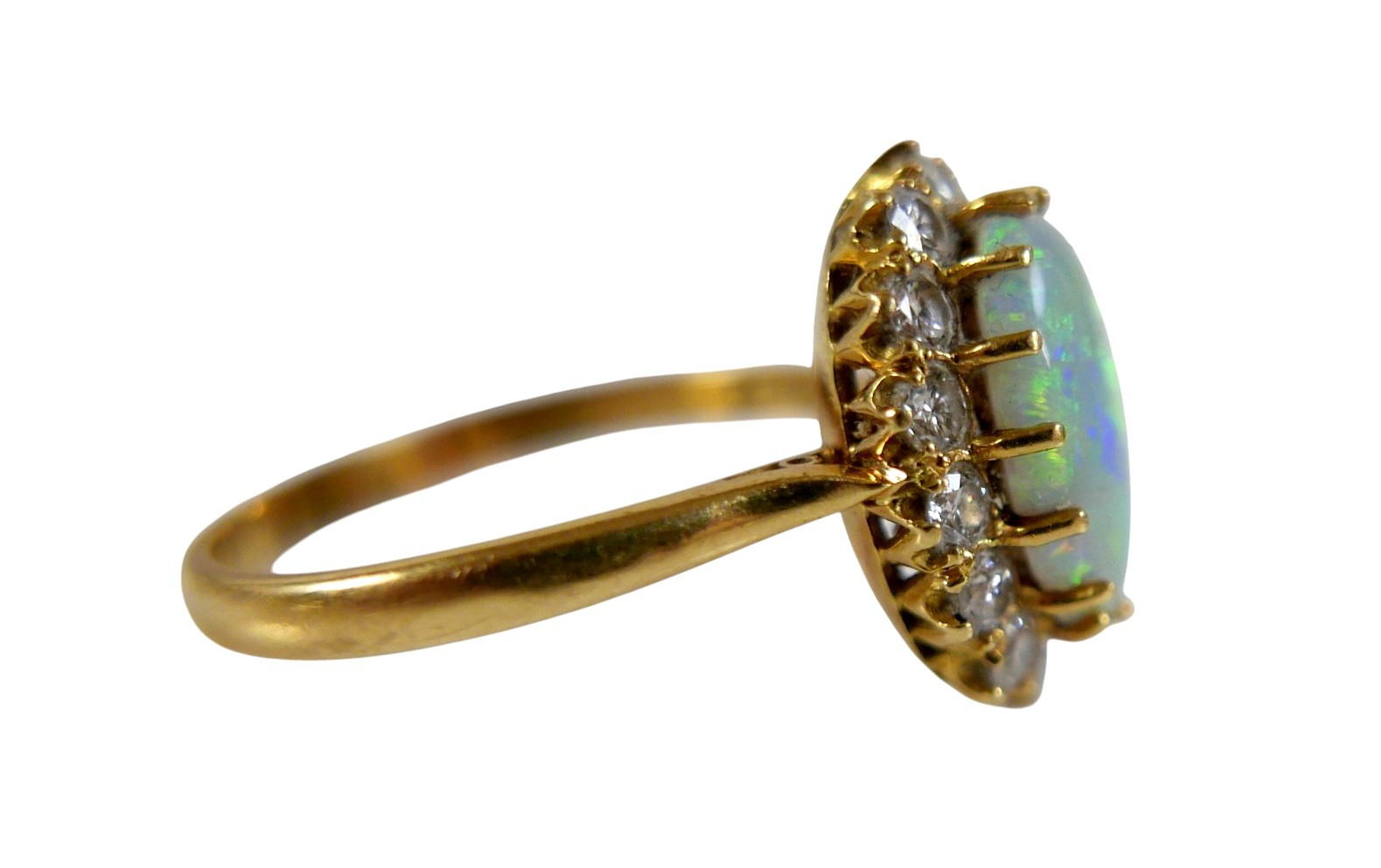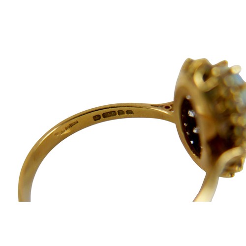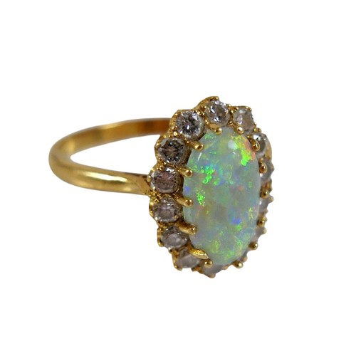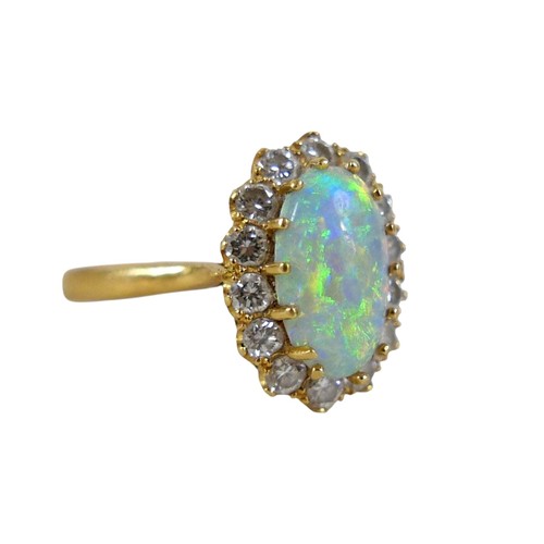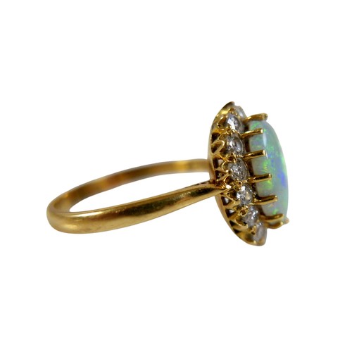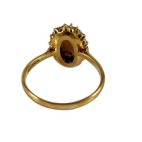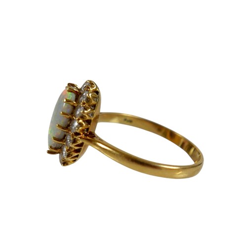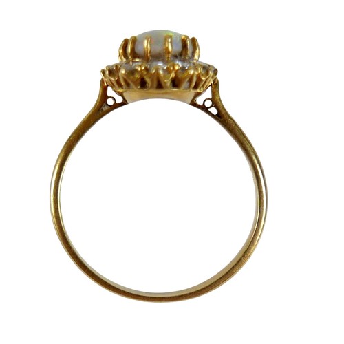 An 18ct yellow gold opal and diamond ring head size 14 by 11mm set with fourteen small diamonds, ring size Q, 3.8g.