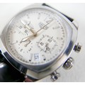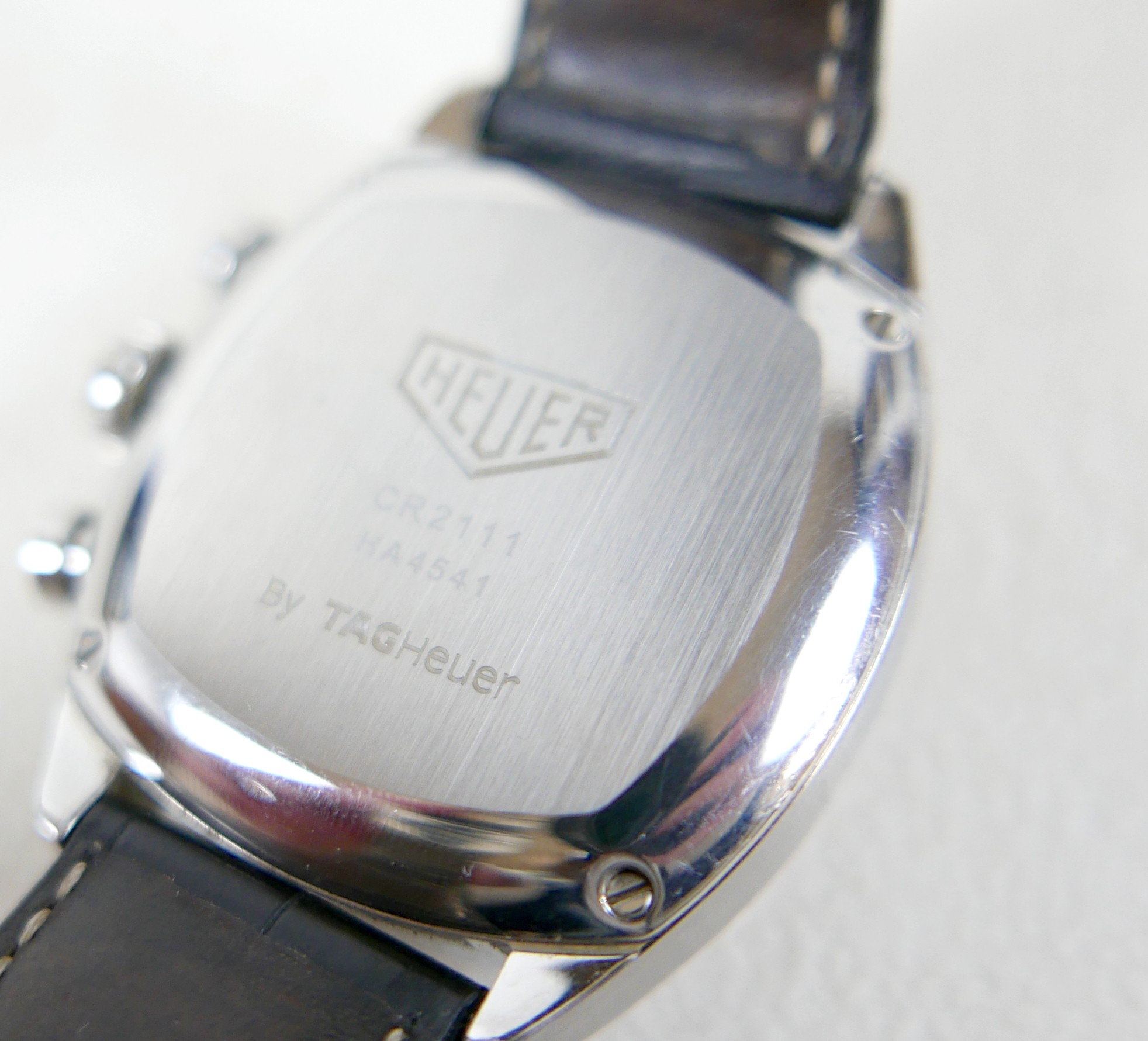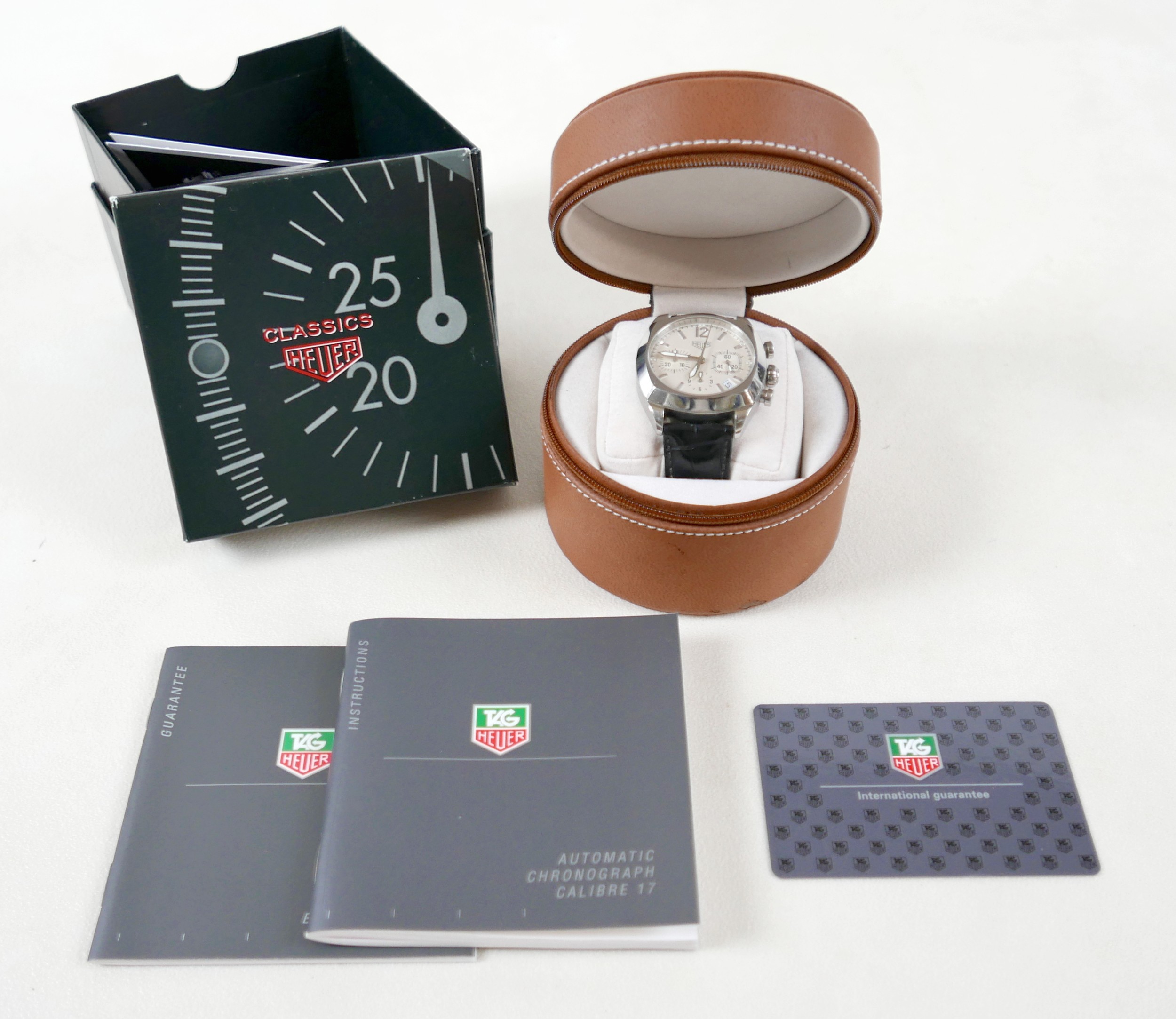 A Heuer Classics stainless steel gentleman's chronograph wristwatch, model CR2111 / HA4541, with circular cream dial, three subsidiary dials, date aperture, luminous hands, oversized Arabic '12' and baton numerals, self winding automatic movement, cal. 17, on a black leather strap with deployment clasp, case 37mm, 94.1g gross, purchased 4/9/03, with brown leather presentation case, outer card box and sleeve, International guarantee card, and instruction booklets.