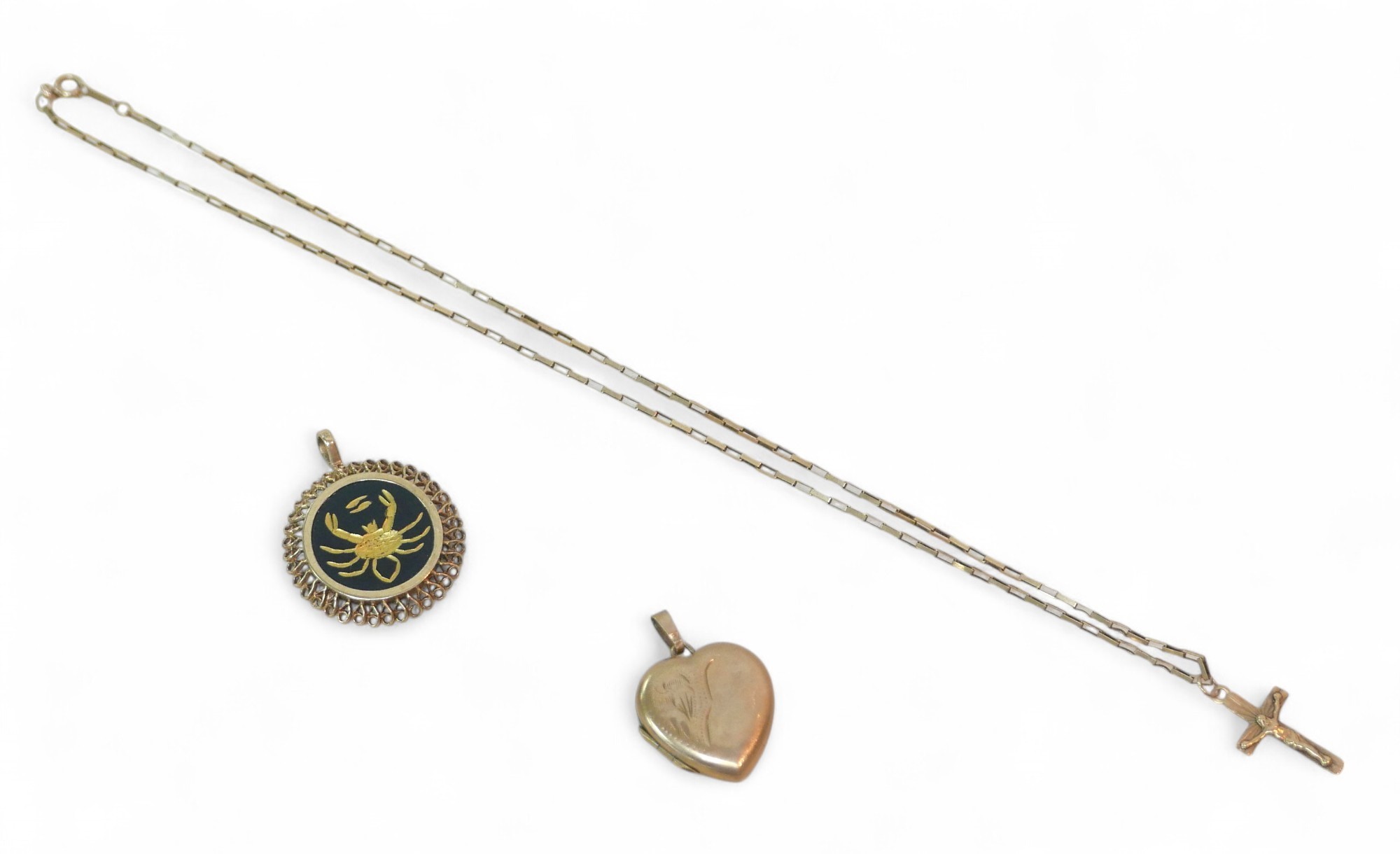 A collection of 9ct gold jewellery, comprising a hardstone and god mounted pendant with a crab insignia, a heart shaped locket, necklace with cross pendant, 6.0g of weighable gold. (1 bag)