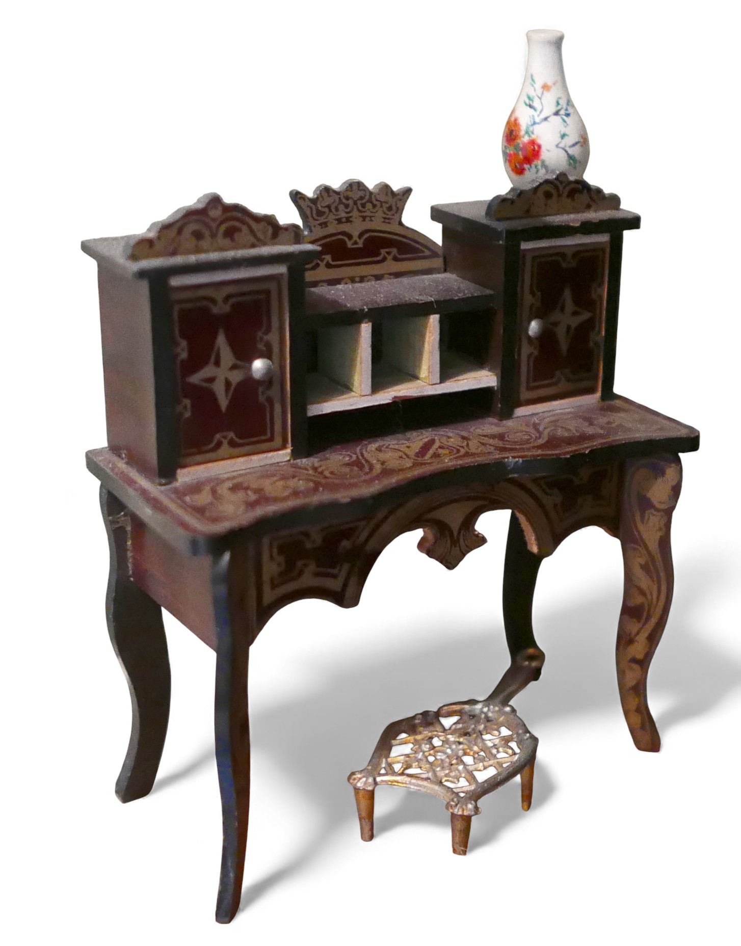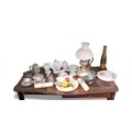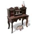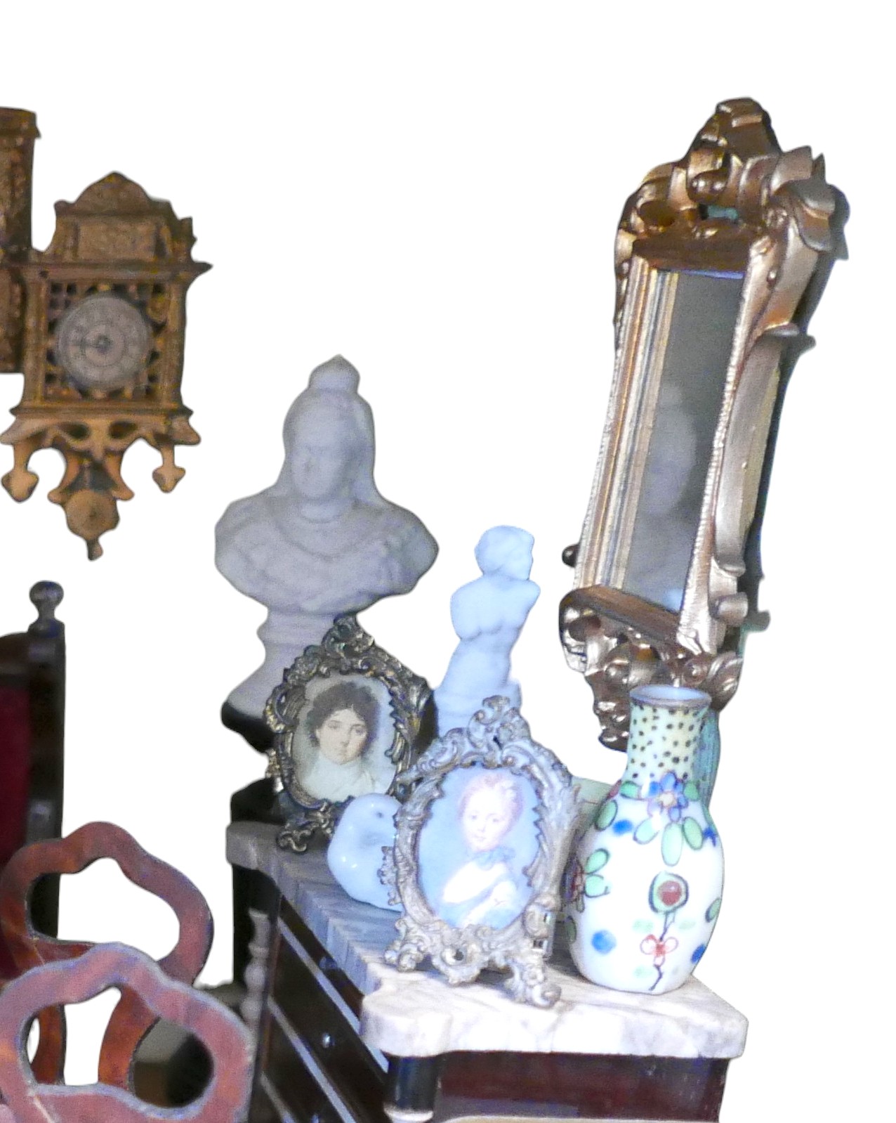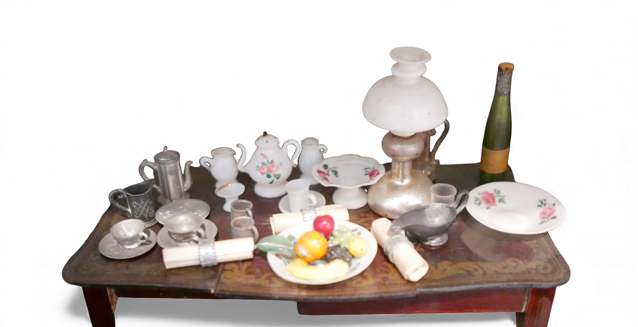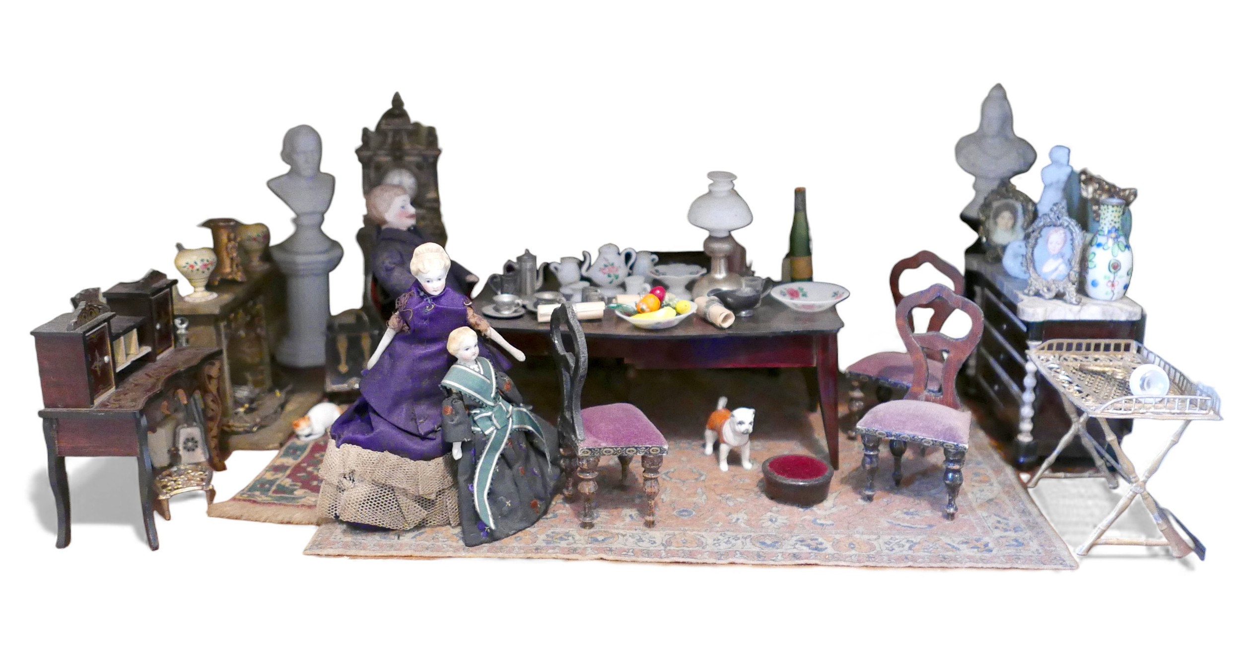 A group of doll's house furniture and accessories, including a dining table with food, three figures, and a bust of Queen Victoria. (1 box)