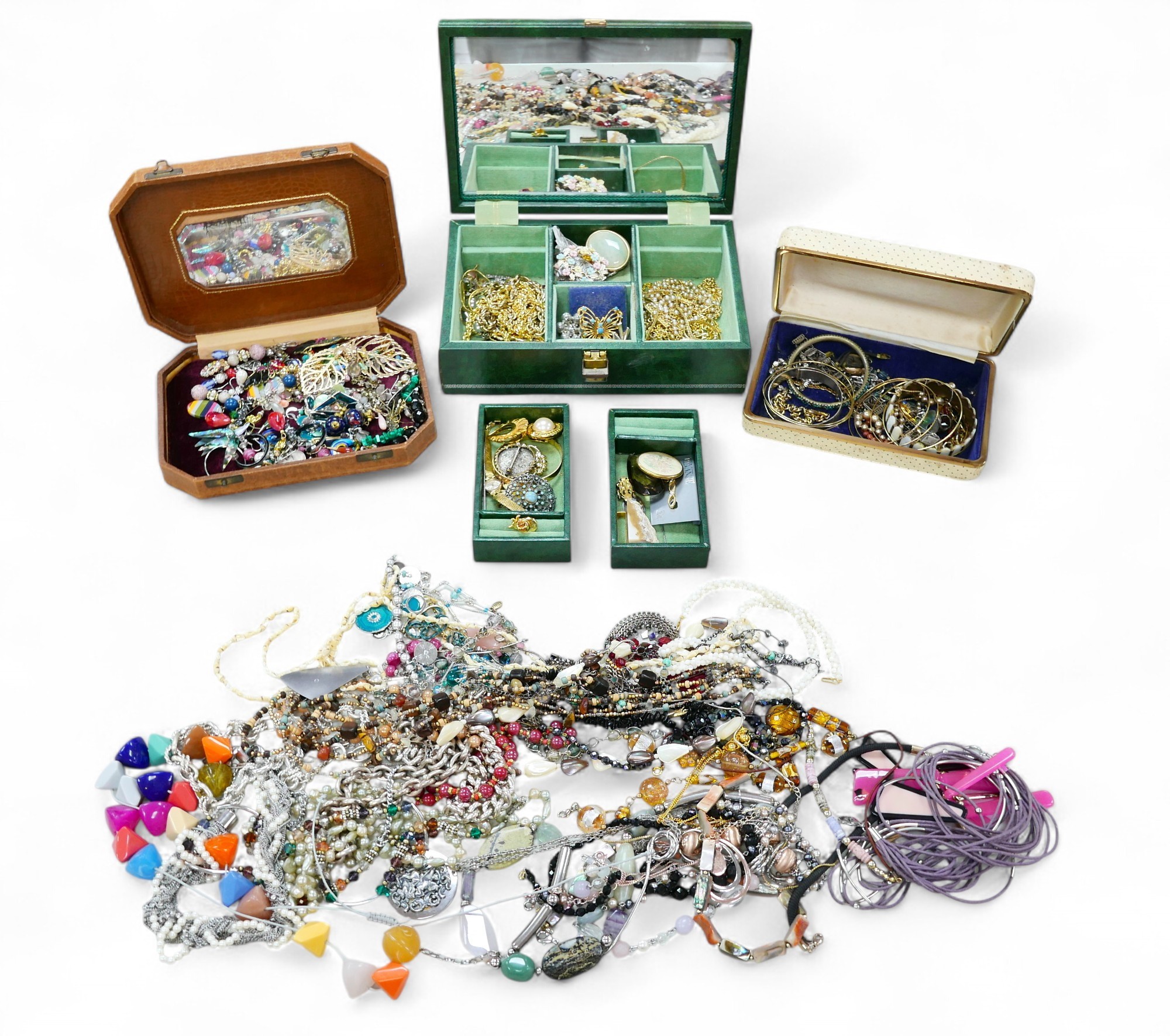 A large collection of costume jewellery, including gilt meta...