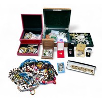 A large collection of costume jewellery, including gilt metal necklaces, and some jewellery boxes. (2 bags)