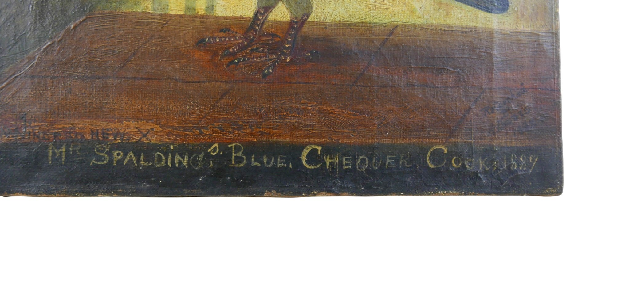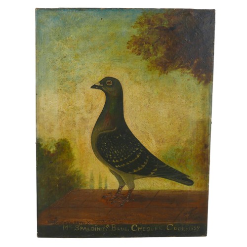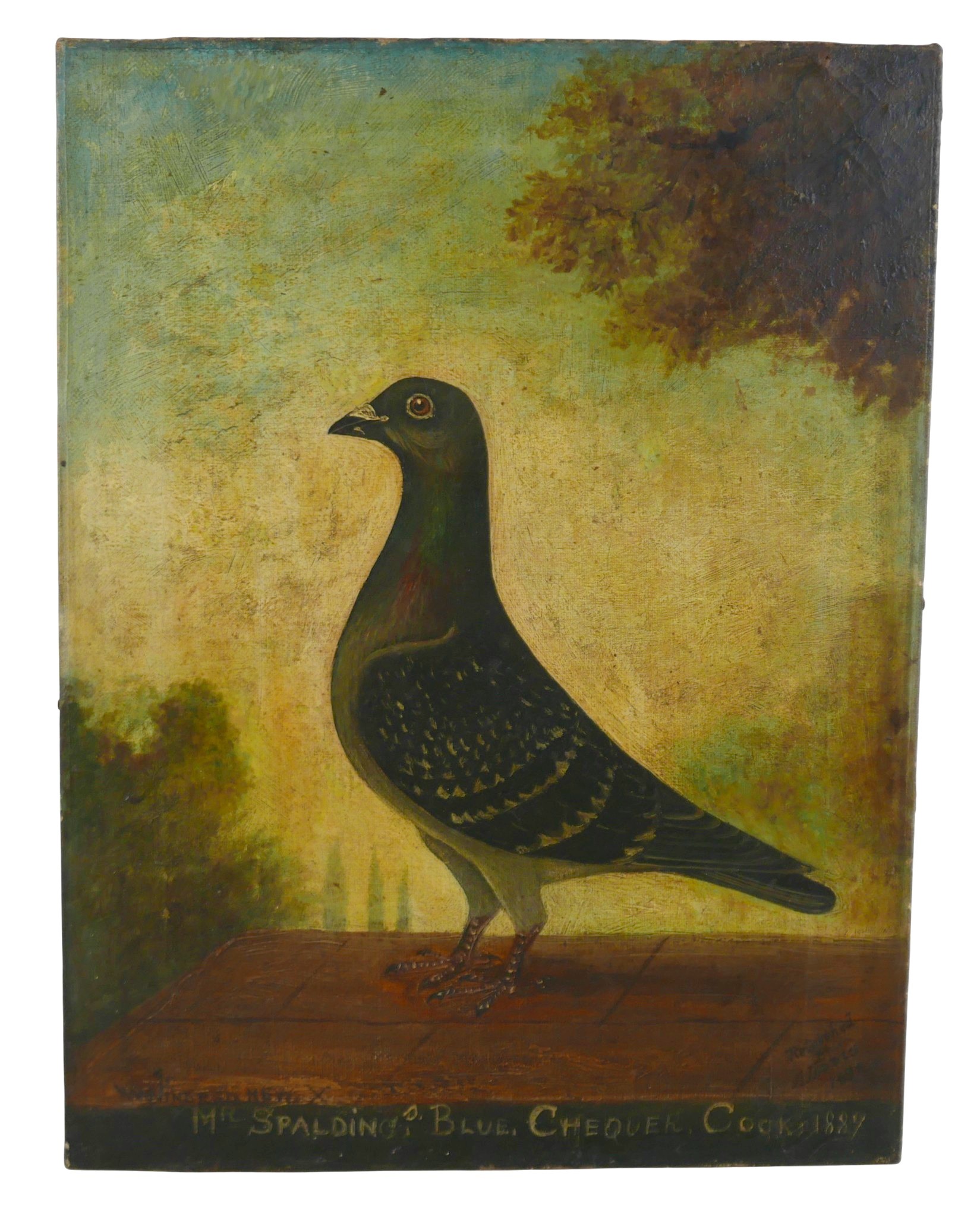 A 19th century oil on canvas of Mr Spaldings Blue Chequer Cock Pigeon, dated 1889 and signed 'WINDRED NEW X, possibly Edward Henry Windred (1875-1953) retouched by Davis 1892, unframed 43 by 33 by 2cm.
