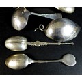 A group of George III, comprising a teaspoon, Thomas Wallis II, London 1798, 13.5cm long, a tea caddy spoon with bright cut decoration, with 'EMJ' monogram, London 1793, 8cm long, a leaf form caddy spoon, John Lias, London, 1796, 7.5cm long, an early 20th century mustard pot with blue glass liner, rubbed military inscription and hallmarks, 9.8 by 4.5 by 7cm high, and three Edward VII and later silver spoons: an ornate teaspoon with twisted handle and profuse engraved decorations, Levi & Salaman, Birmingham 1901; one with a dog portrait to its finial, J A Restall & Co, Birmingham 1932, 9.1cm long, and another teaspoon, James Dixon & Sons Ltd. Sheffield 1920, 11.8cm long, 5toz of weighable silver. (1 bag)