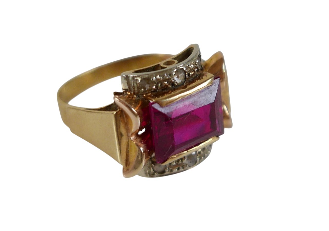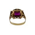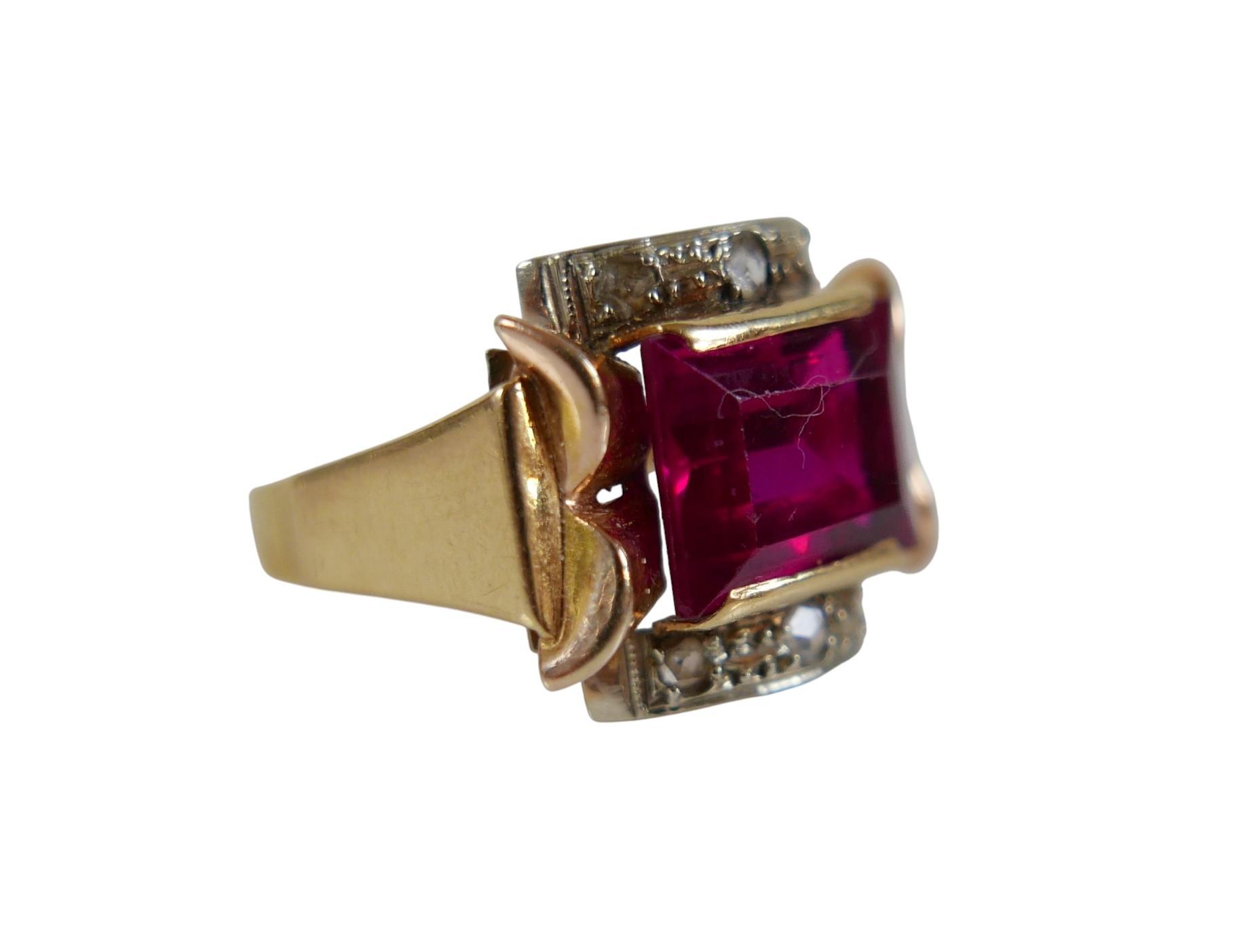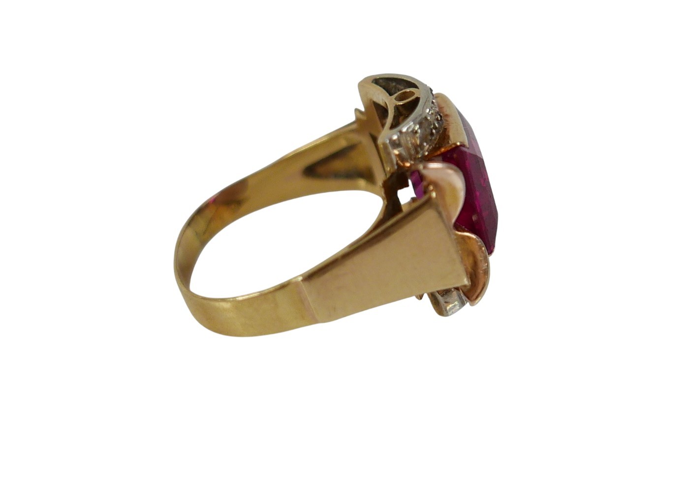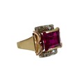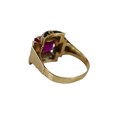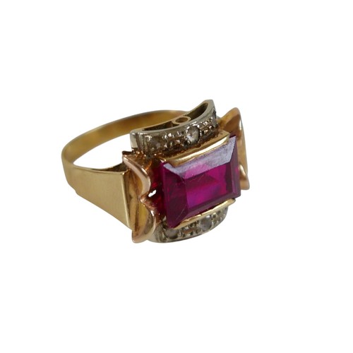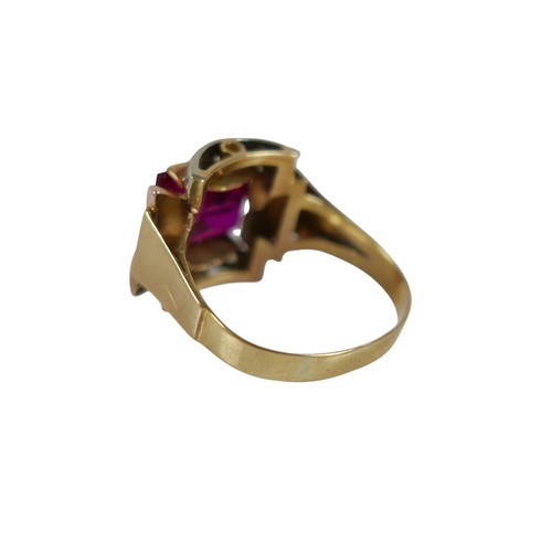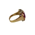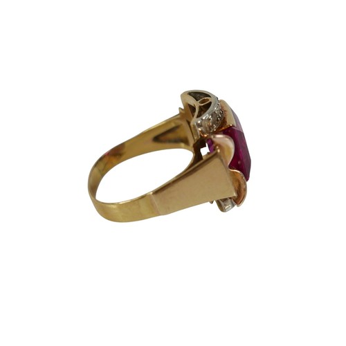 A yellow gold ruby and diamond ring the central ruby approxi...