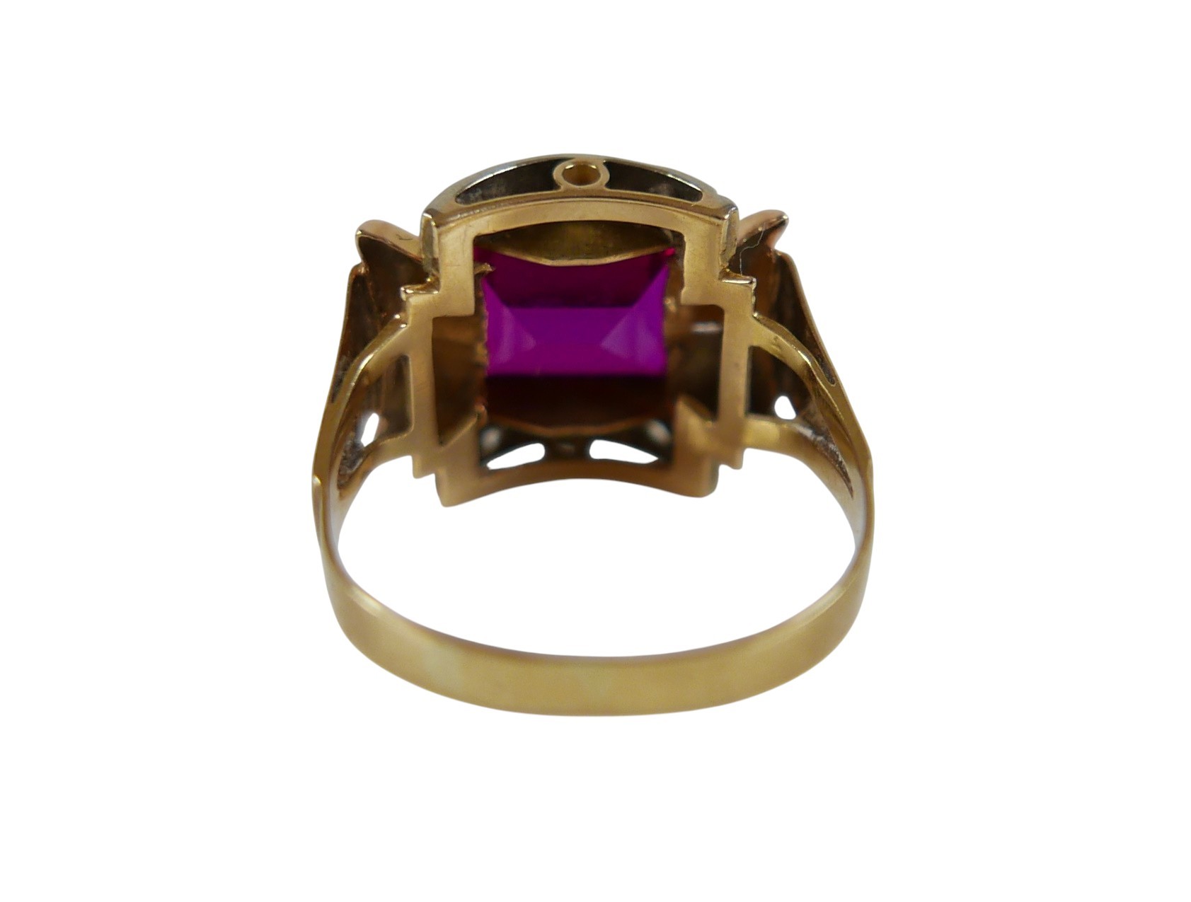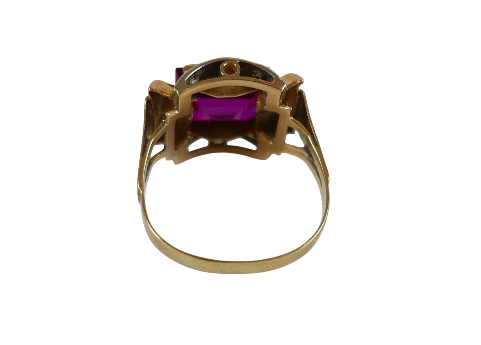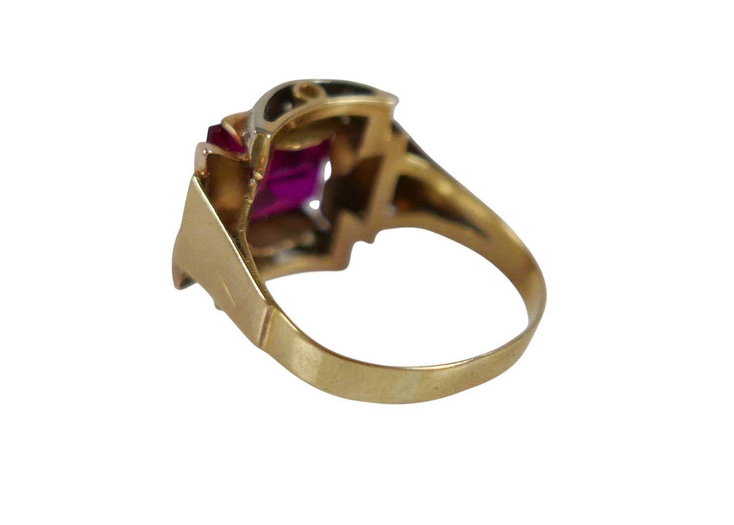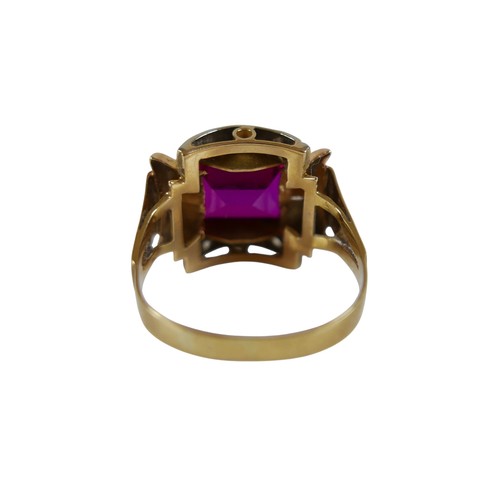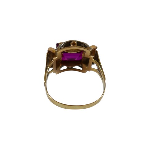 A yellow gold ruby and diamond ring the central ruby approxi...