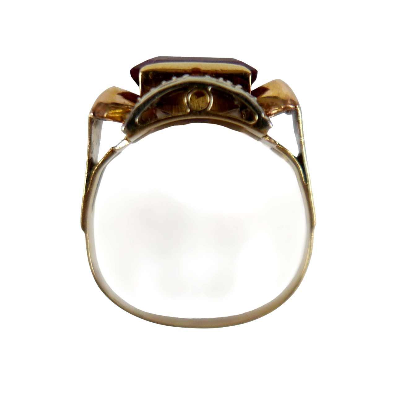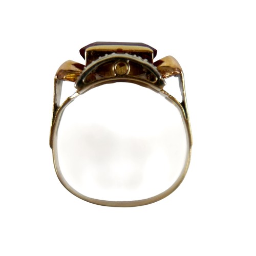 A yellow gold ruby and diamond ring the central ruby approximately 3.0ct with diamonds in a half hoop setting, surface tests to approximately 18ct, head size 18 by 14mm, ring size O, 4.4g.