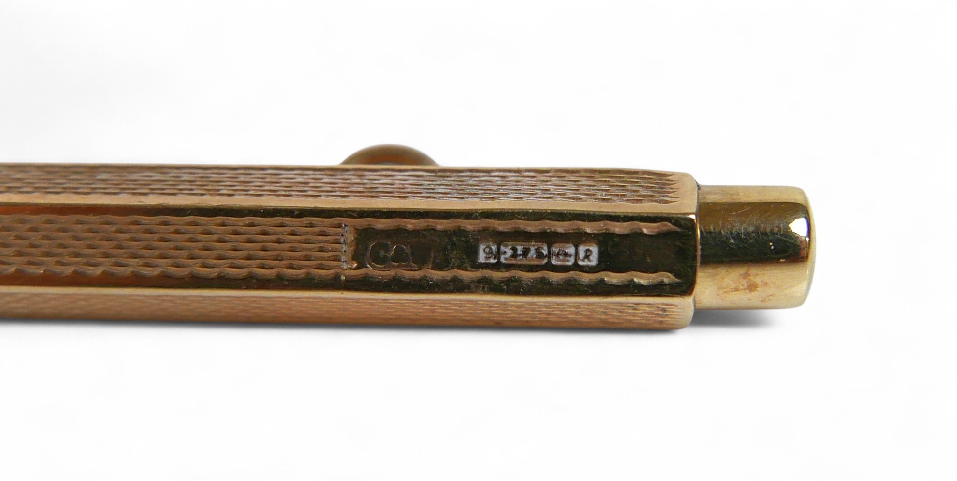 A 9ct yellow gold toothpick, with sprung release, loop attachment, and engine turned decoration, C&S, Birmingham 1966, 6cm long, 8cm long extended, gross weight 5.8g.