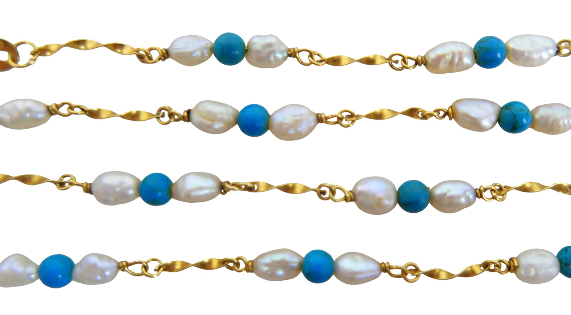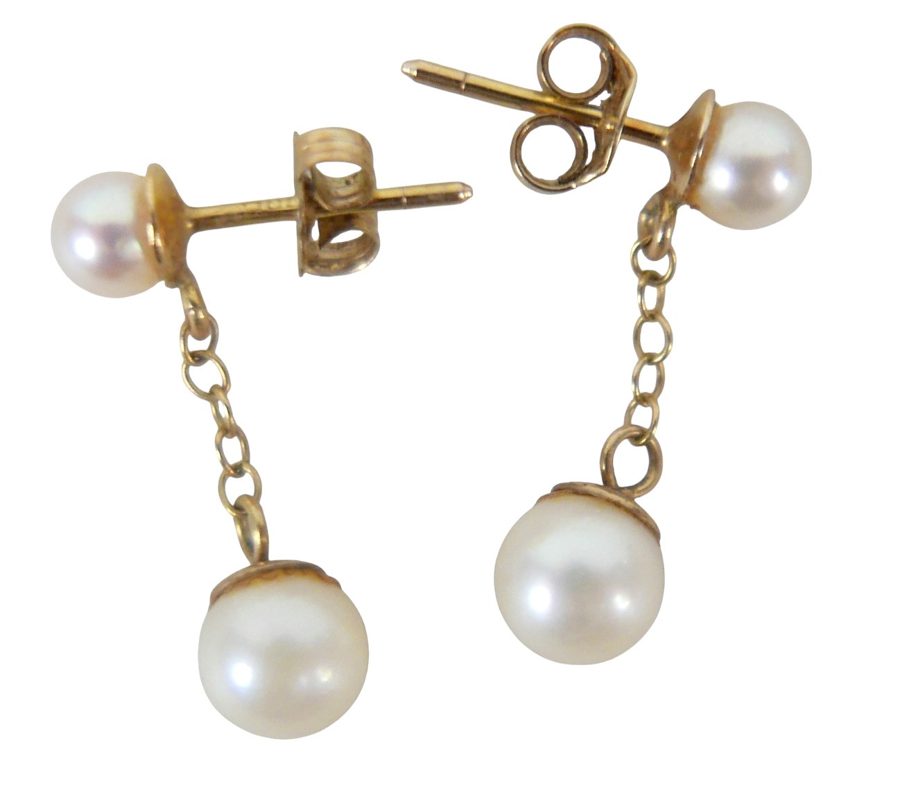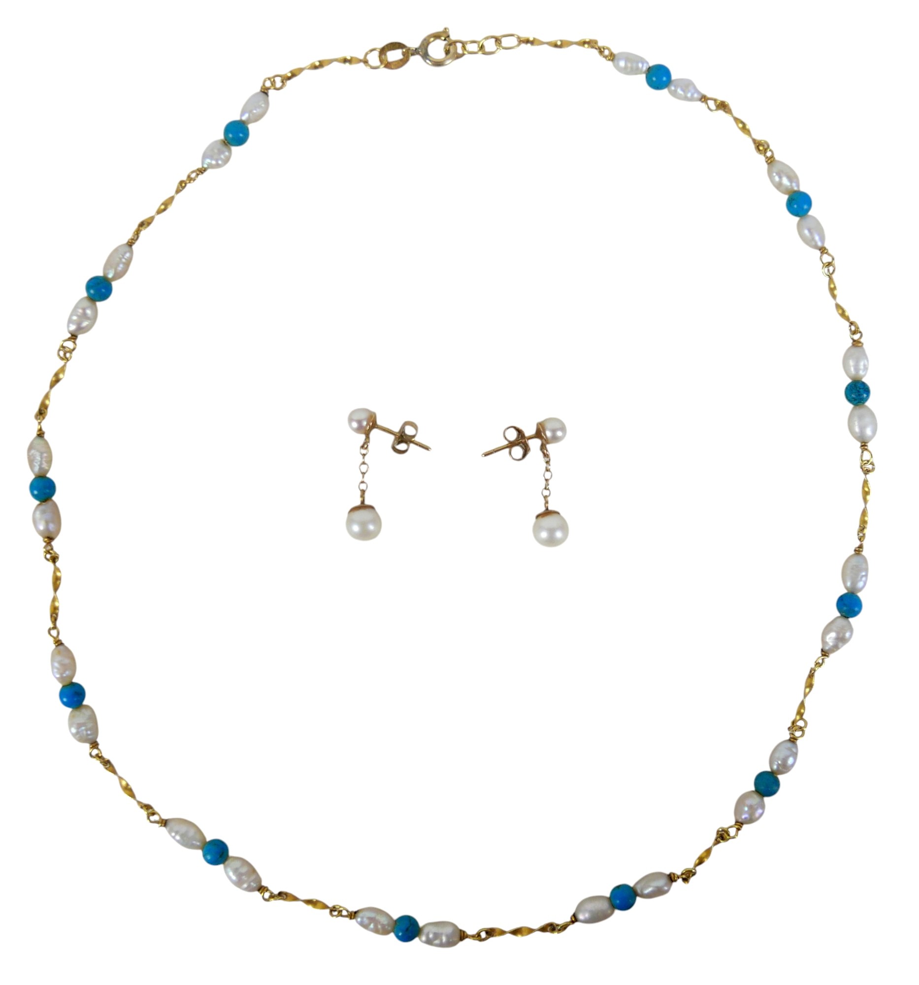 An 18ct gold, pearl and turquoise necklace, 7g, plus pair of pearl stud earring pendant drops on good mounts.