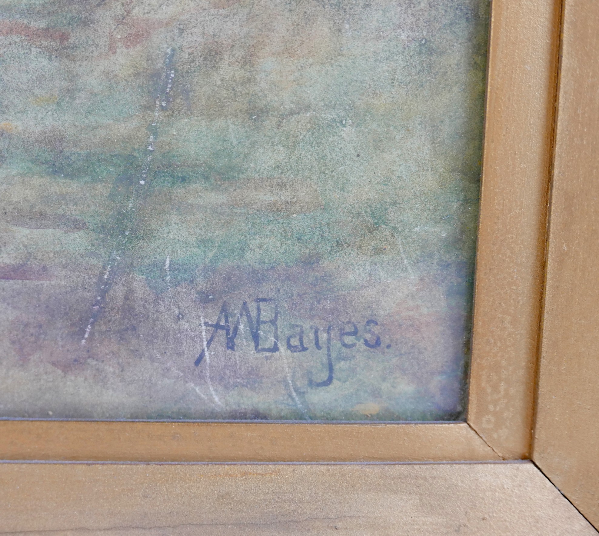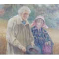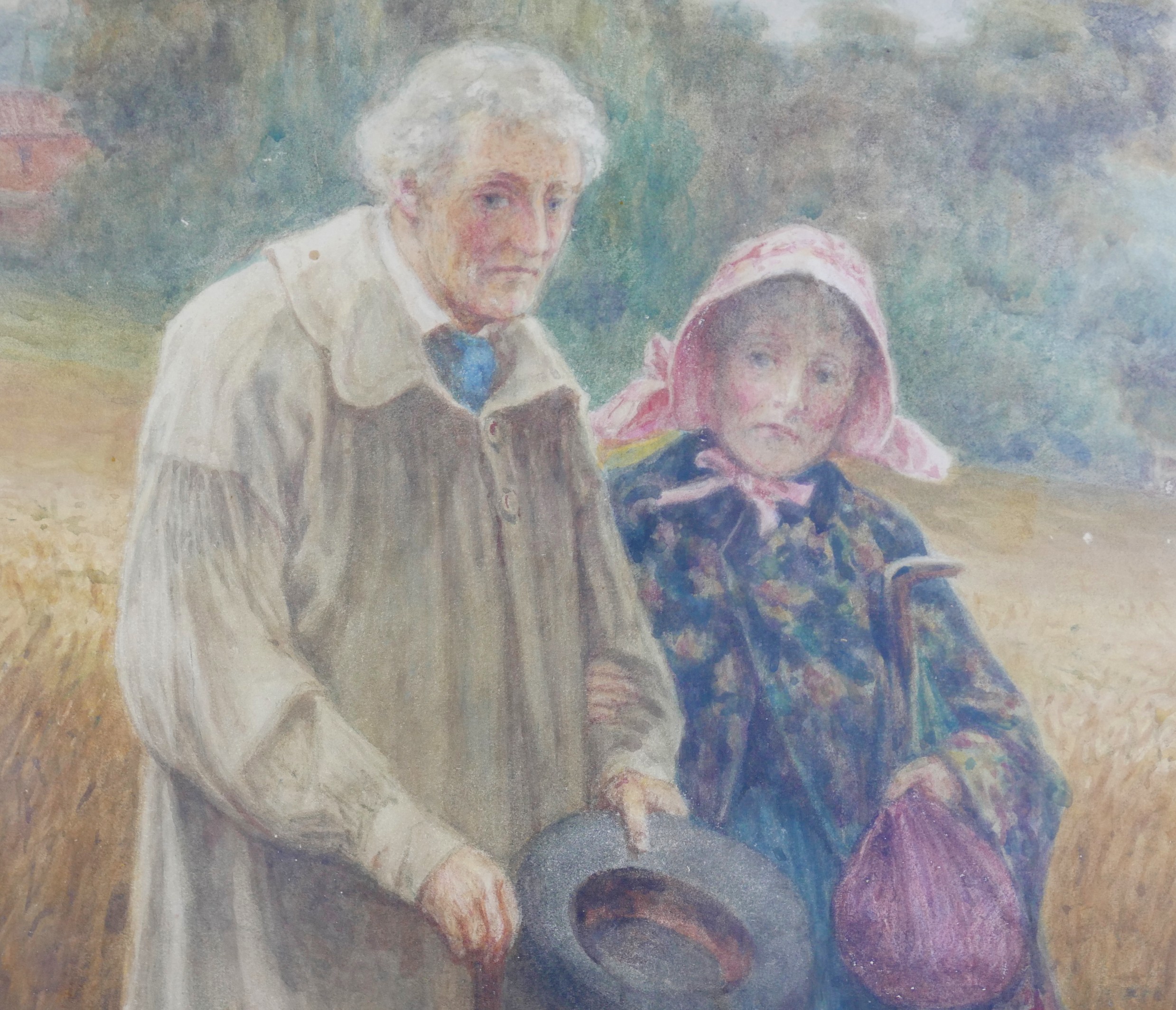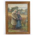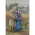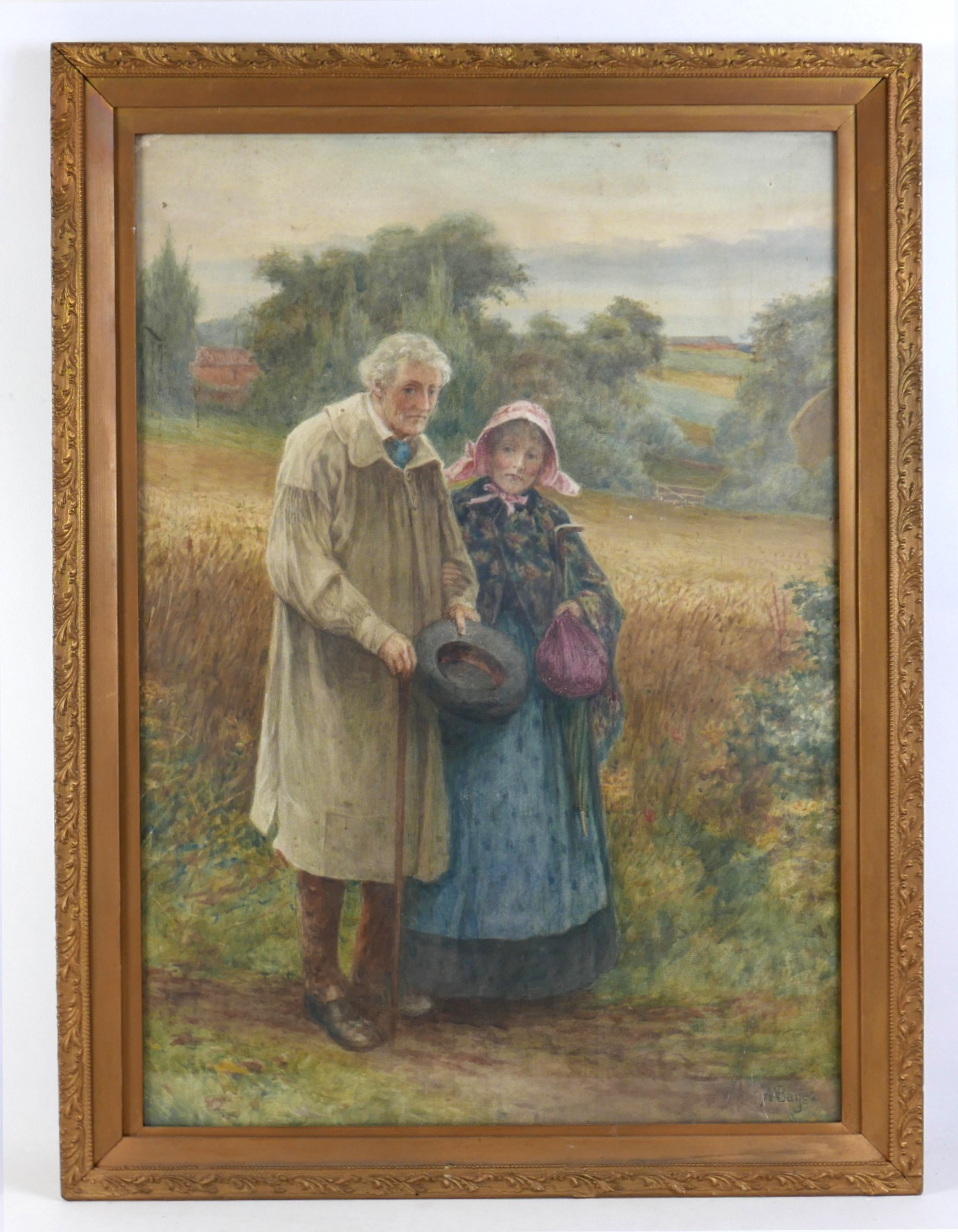 Alfred Walter Bayes (British, 1832-1909): a Victorian couple, standing at the edge corn field, signed lower right, watercolour, 74 by 52cm, glazed and gilt framed, 86 by 64cm.
