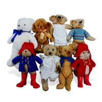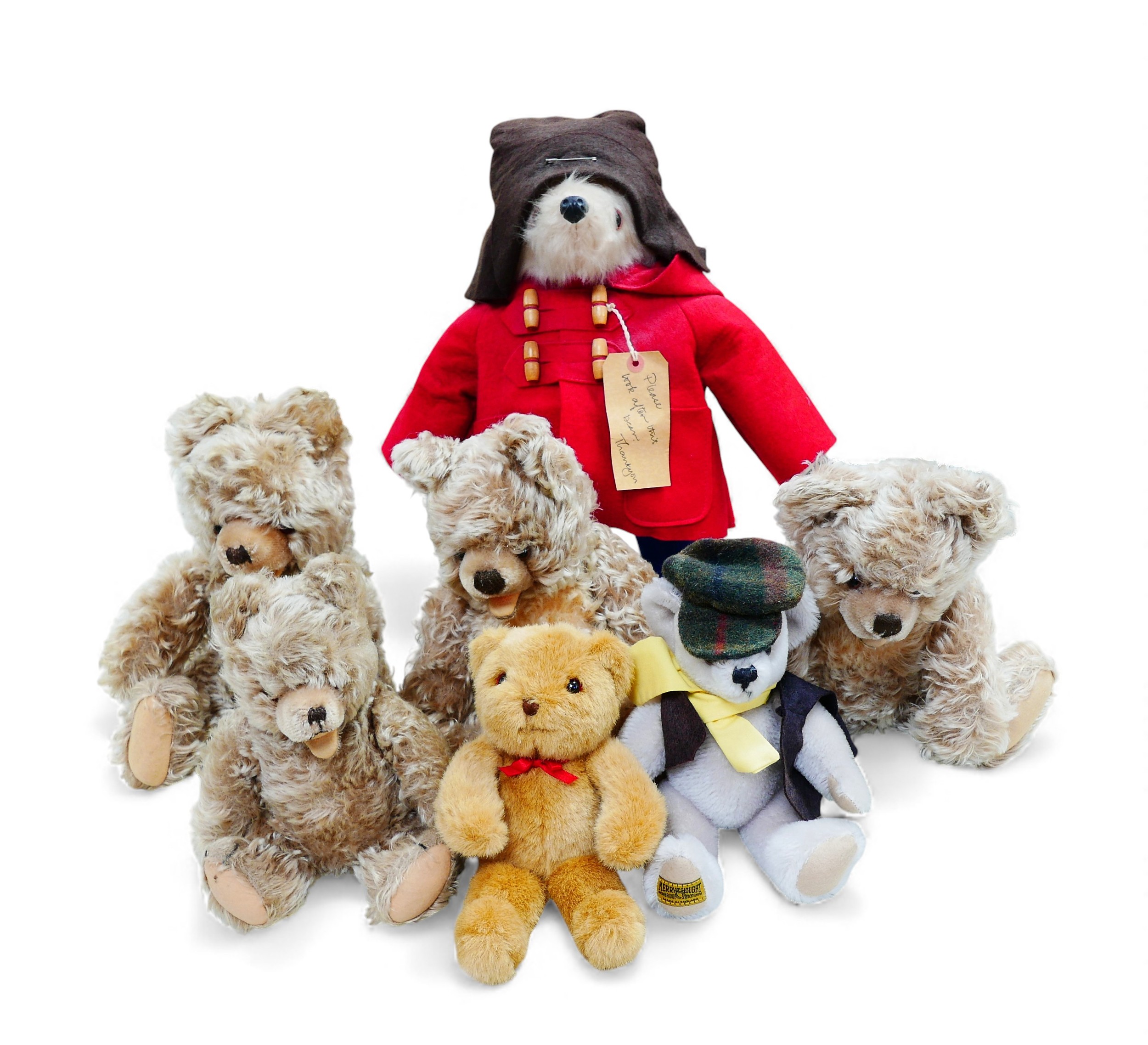 A Gabrielle Designs Paddington bear, with Dunlop boots and name tag, 46cm high, together with six other teddy bears, including a small Merrythought bear dressed in a flat cap and waistcoat, 26cm high. (1 box)