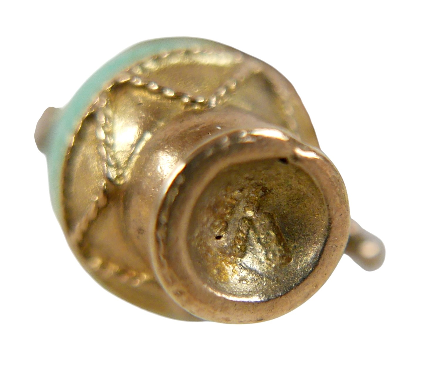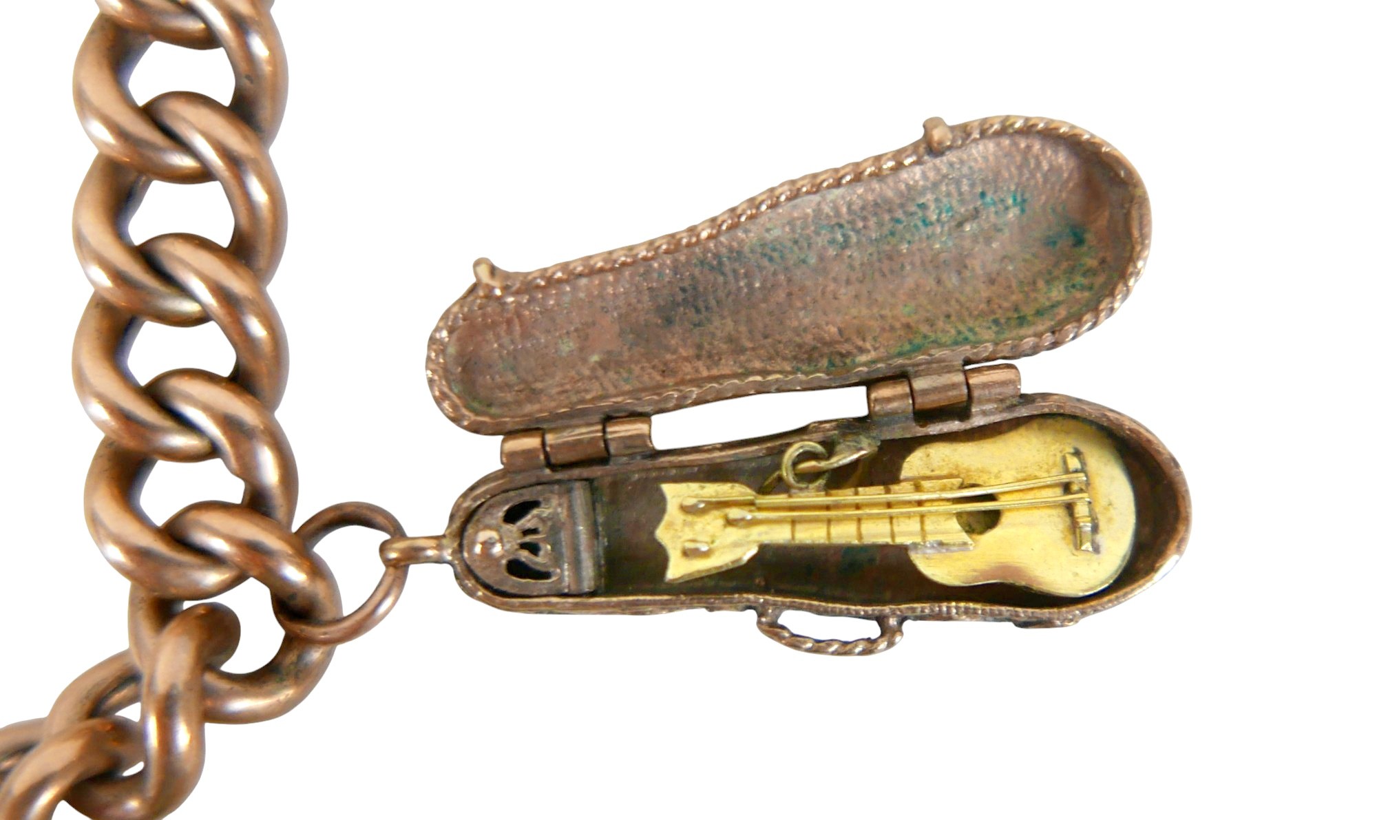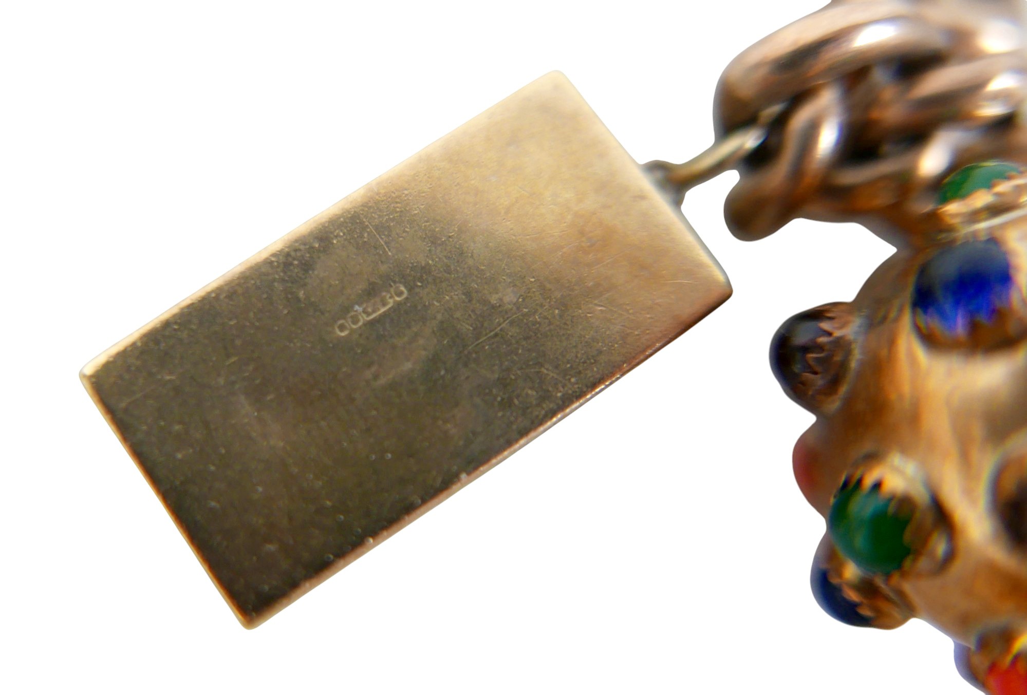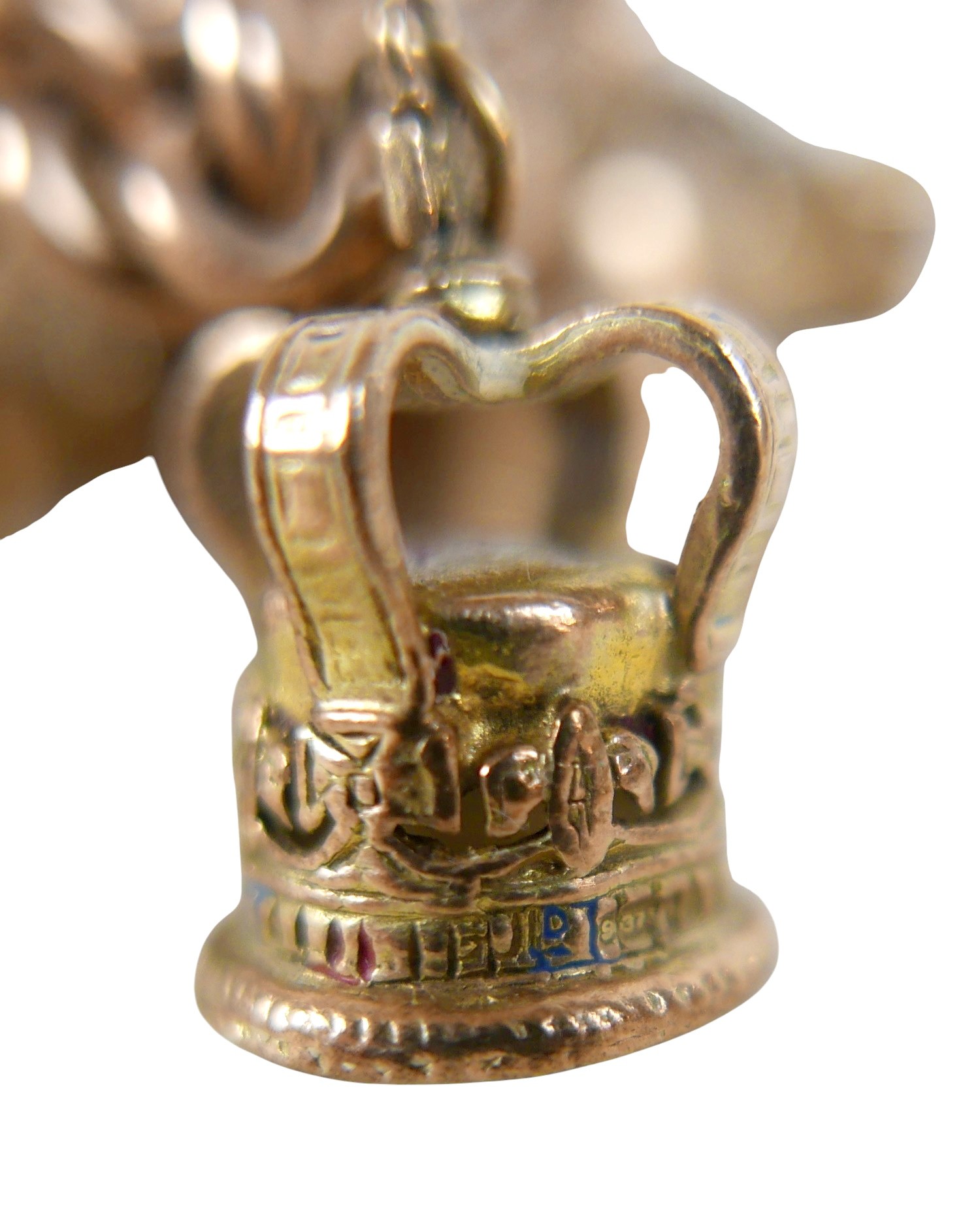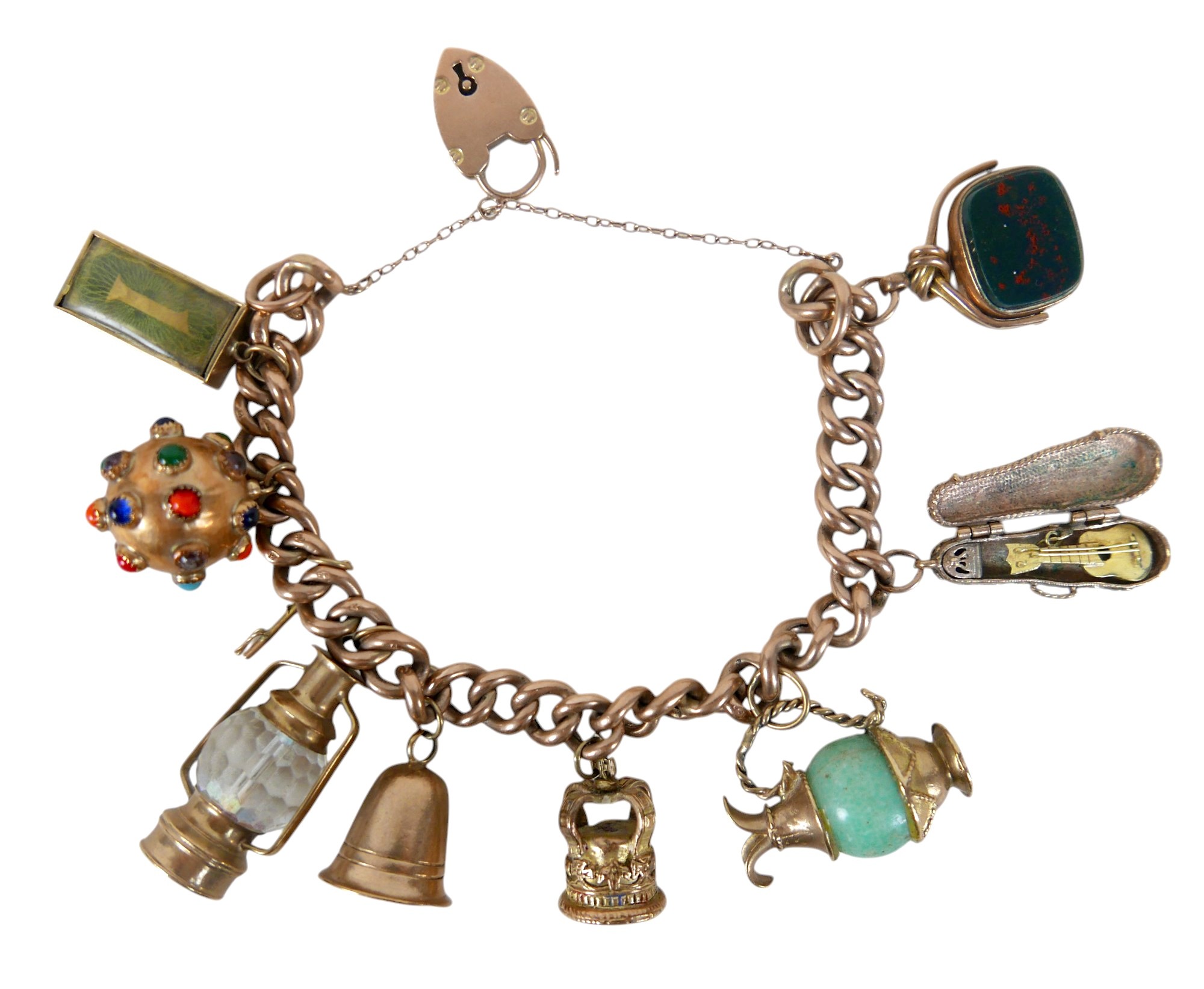 A 9ct gold charm bracelet with assorted 9ct gold charms, including violin in case, double sided 19th century hardstone fob, pre-decimal £1 note, crown, bell, cabochon hardstone inlaid ball etc, total weight 68.6g.