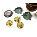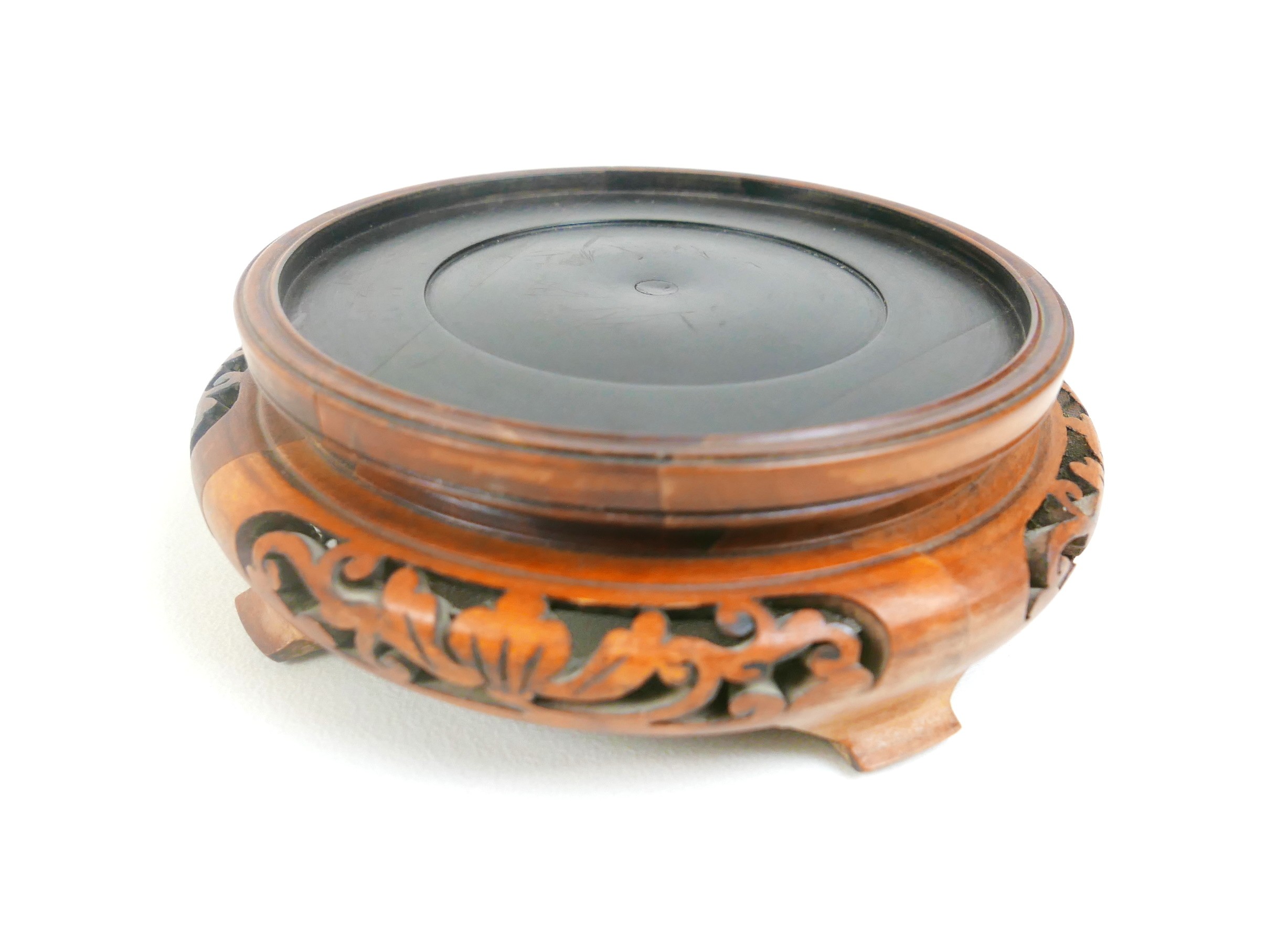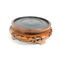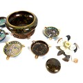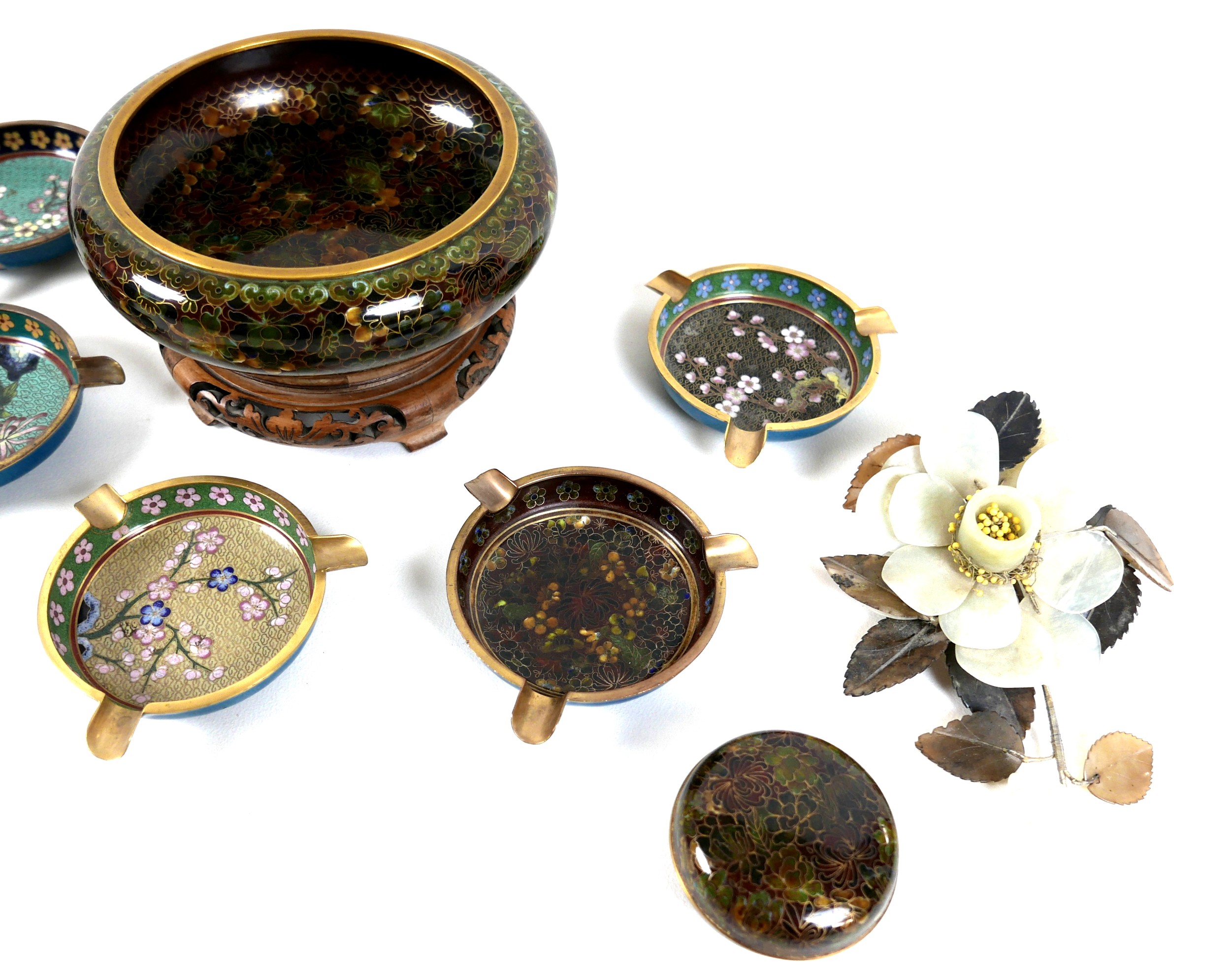 A modern Chinese cloisonne enamel bowl, 20.5 by 7cm high, on a carved wooden stand, together with five Chinese cloisonne enamel ashtrays, lidded box, three papier mache boxes and bowl, and a hardstone 'flower'. (12)