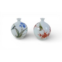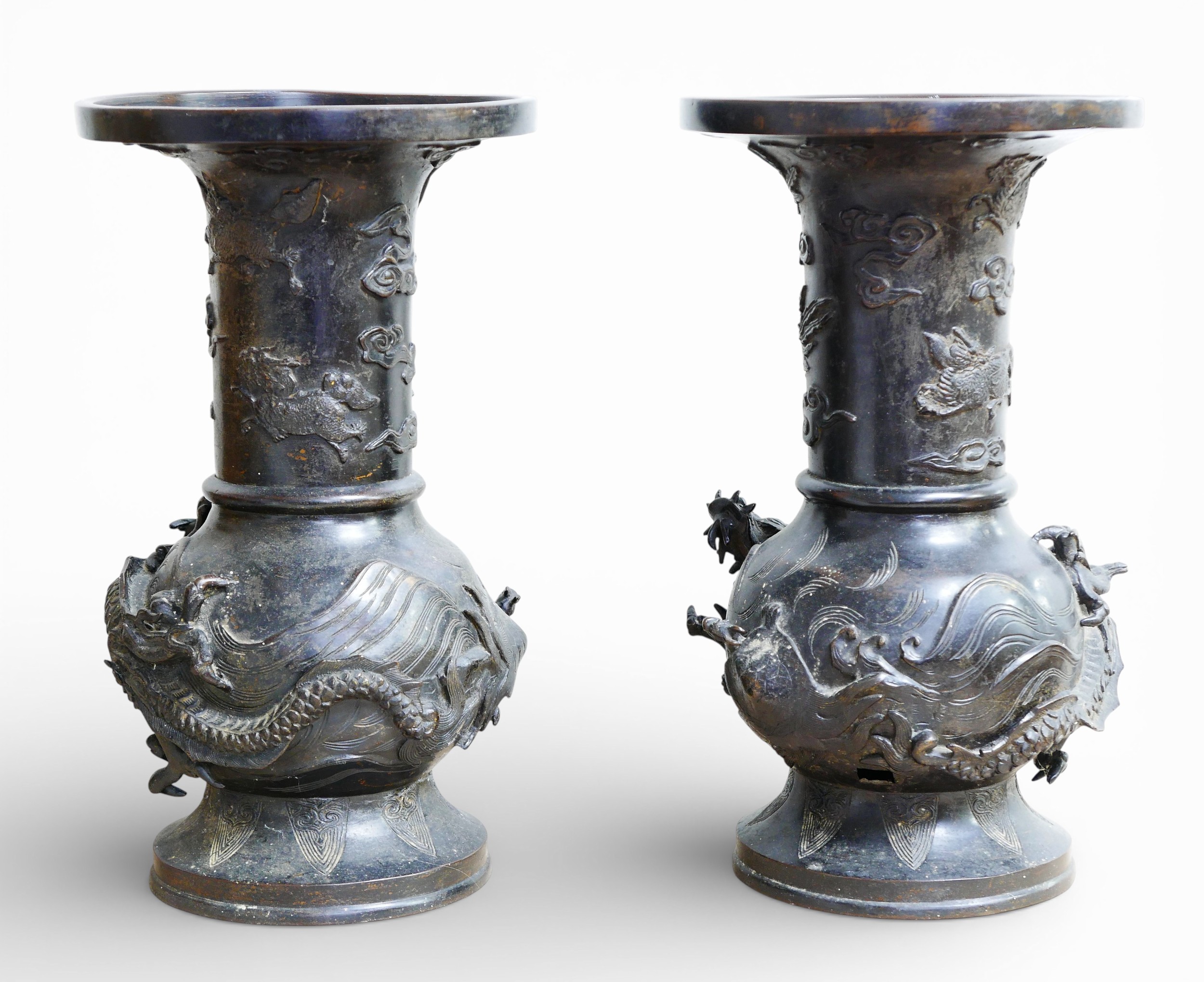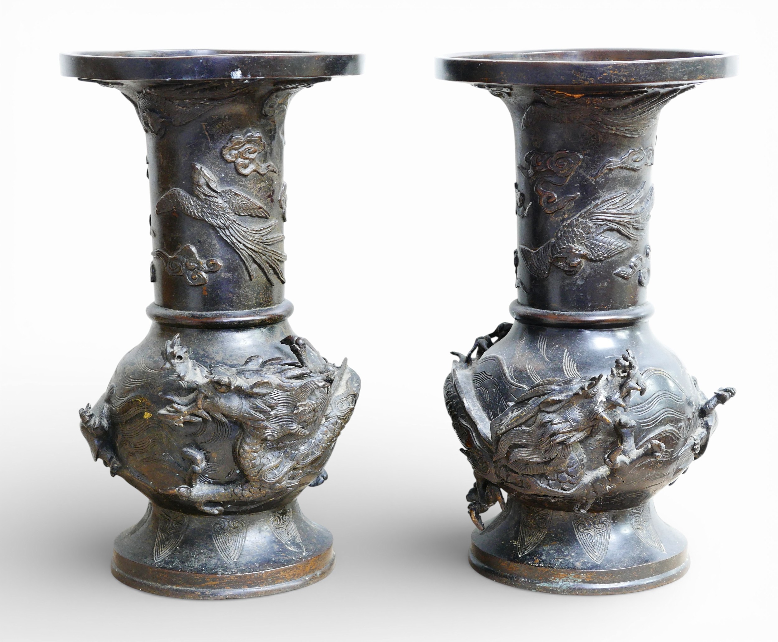 A pair of Oriental bronze dragon urns, each decorated in high relief with a dragon chasing a flaming pearl and birds to the neck, both 26.5 by 46cm high. (2)