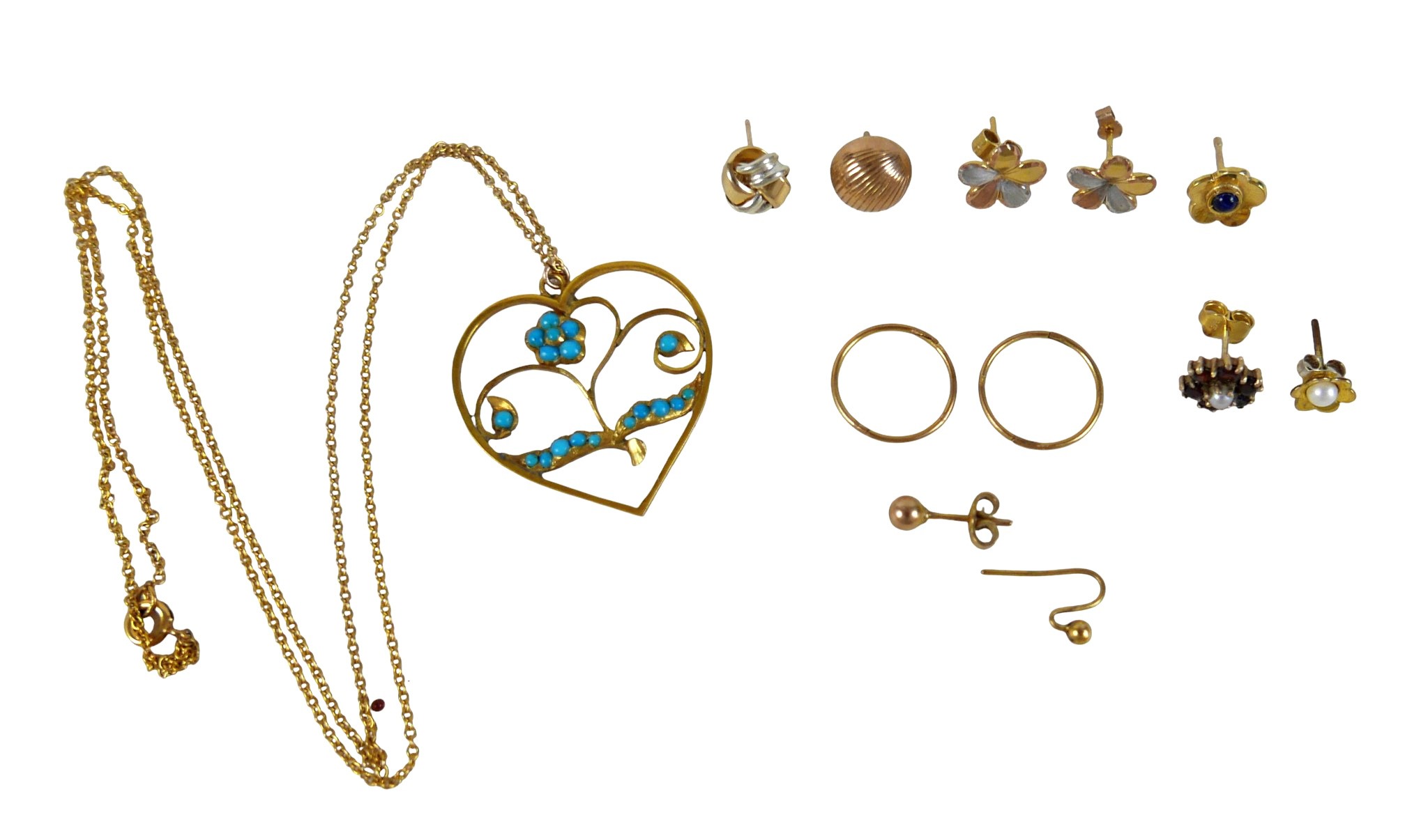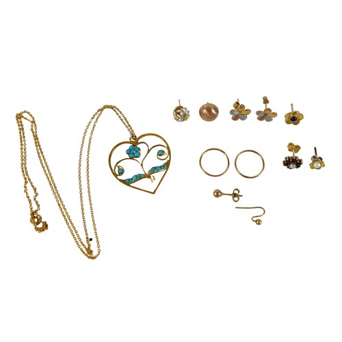 A collection of 9ct yellow gold and yellow metal earrings and a pendant on chain, total weight 9.9g.(1 bag)