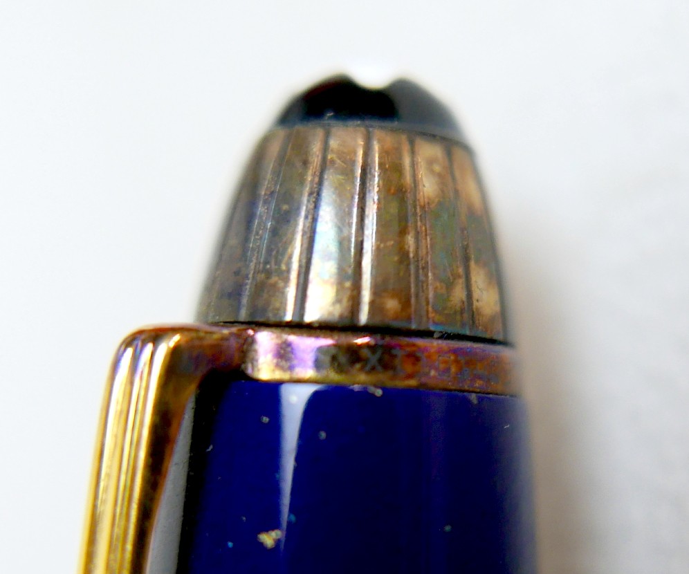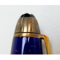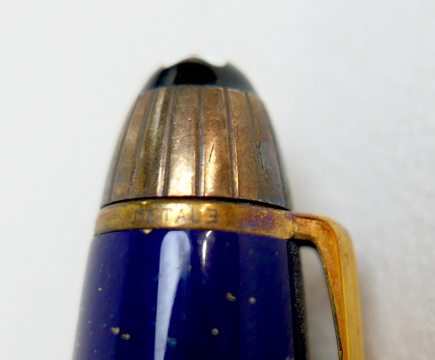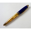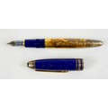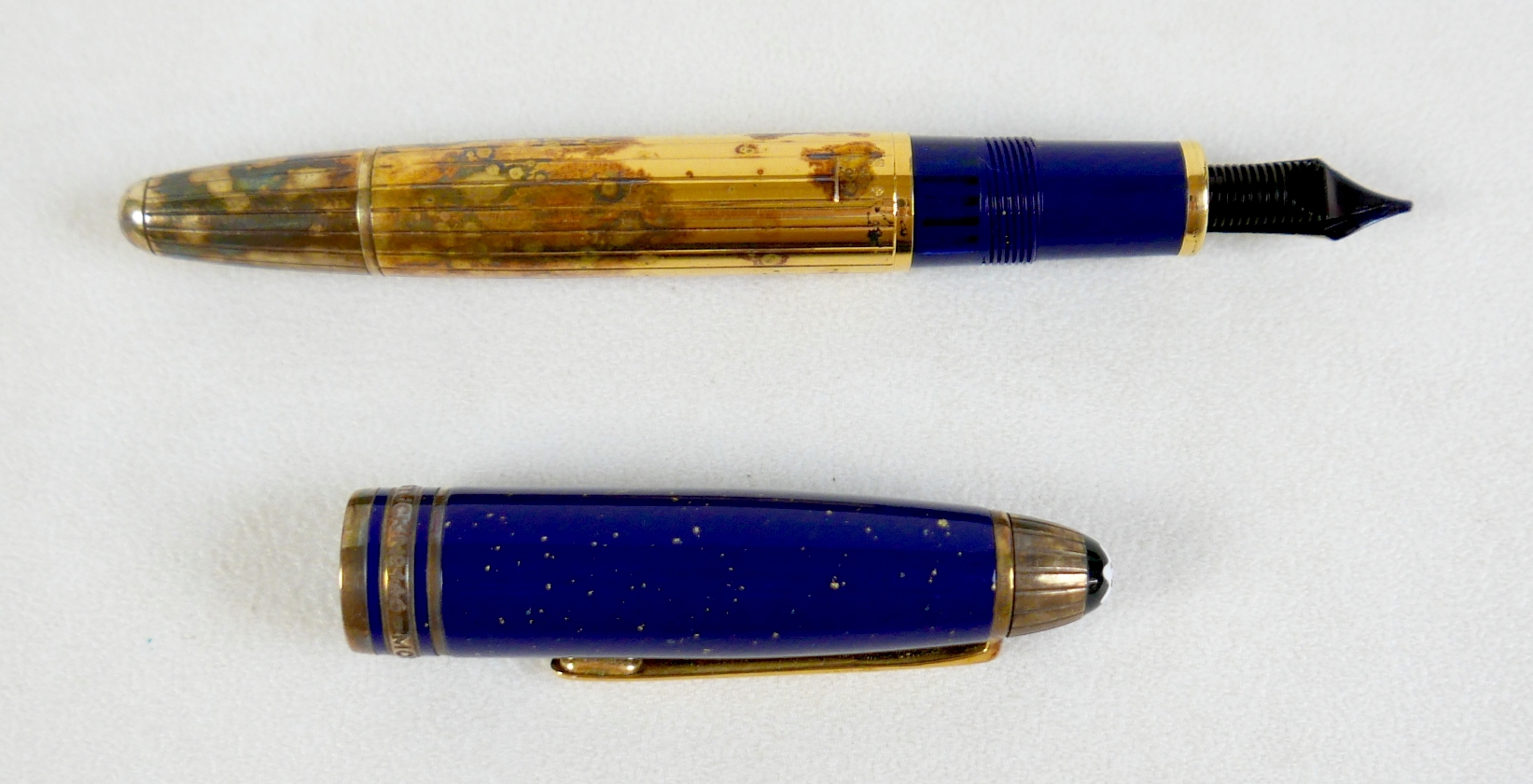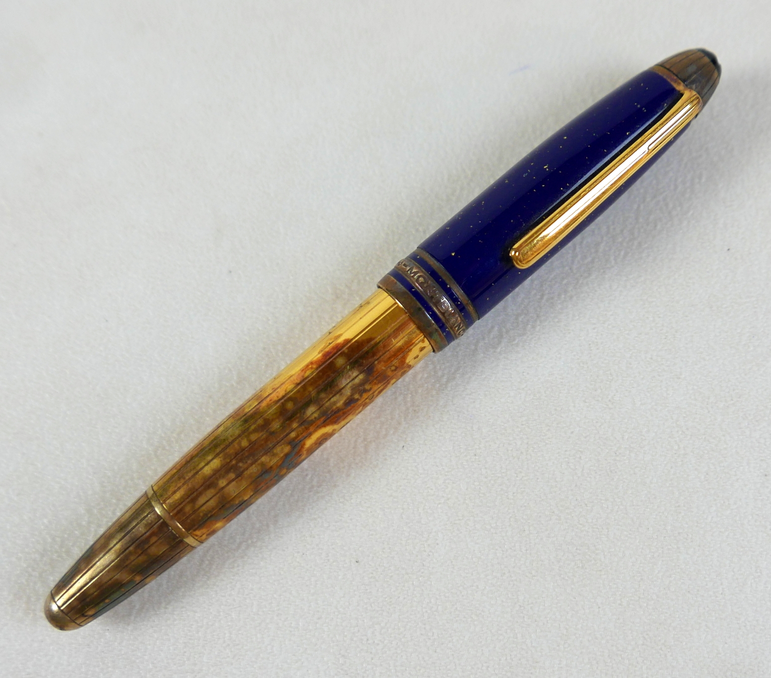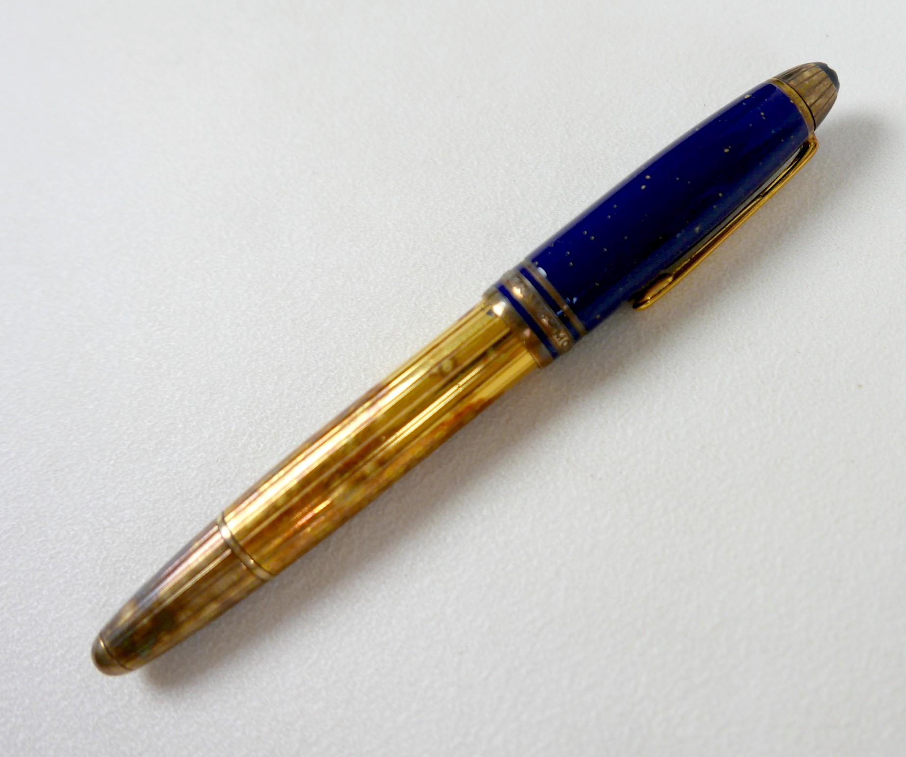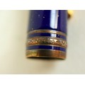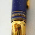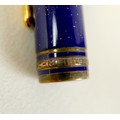 A Montblanc Meisterstuck Montblanc No 146 Solitaire Ramses II Lapis Lazuli Le Grand fountain pen, circa 1990s, 18k two tone 4810 M (medium) nib, cartridge fill, silver gilt 'vermeil' barrel with gilt fittings, lapis lazuli style blue lacquer and gilt flecked cap and grip, 14.0cm.