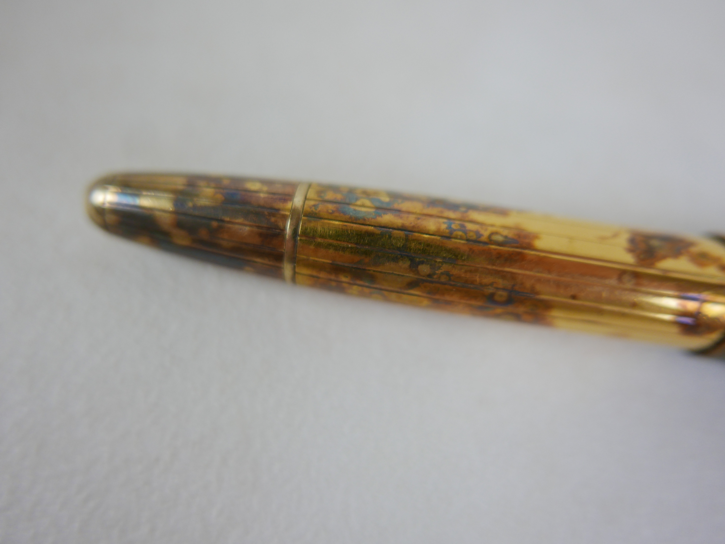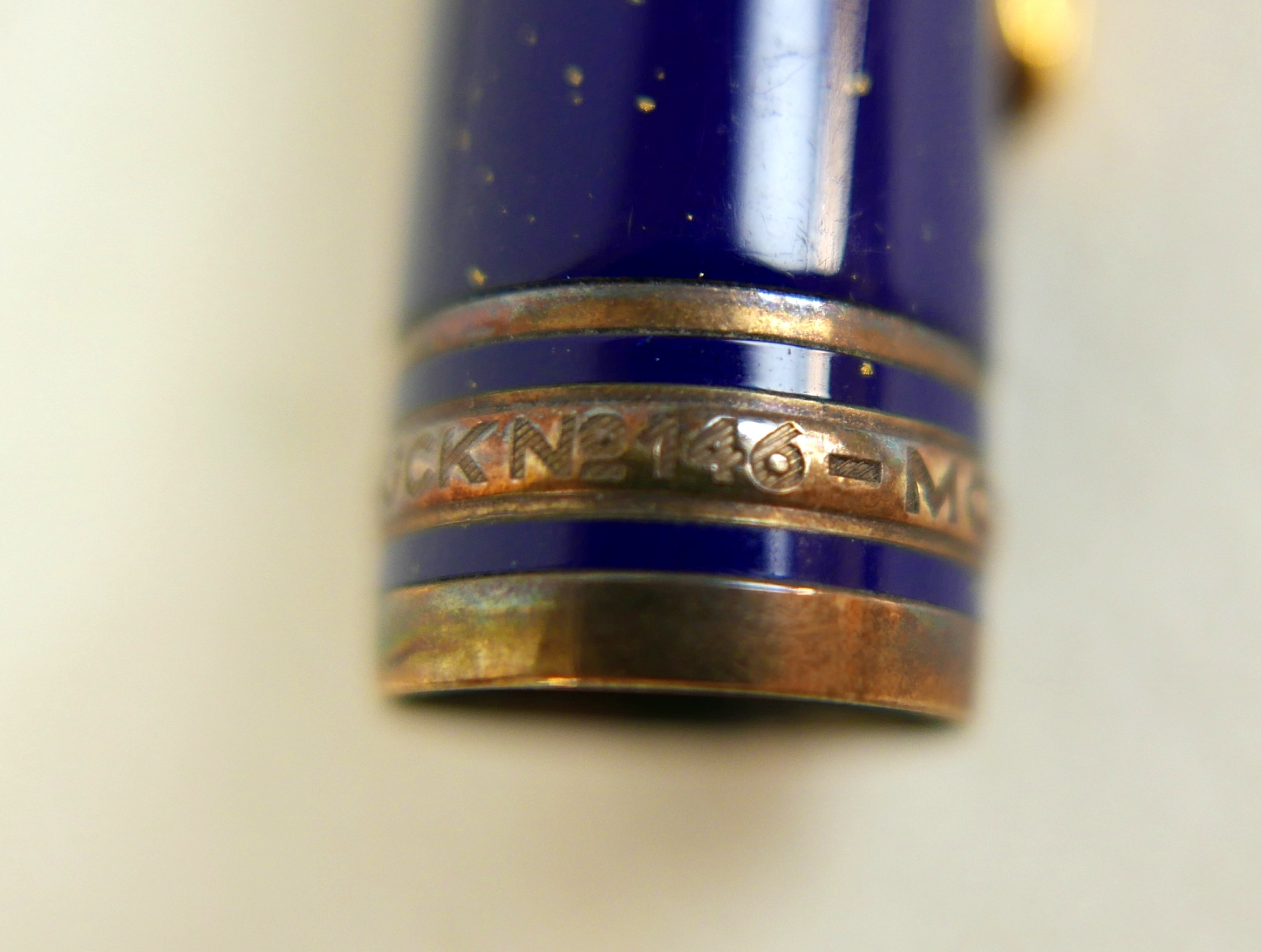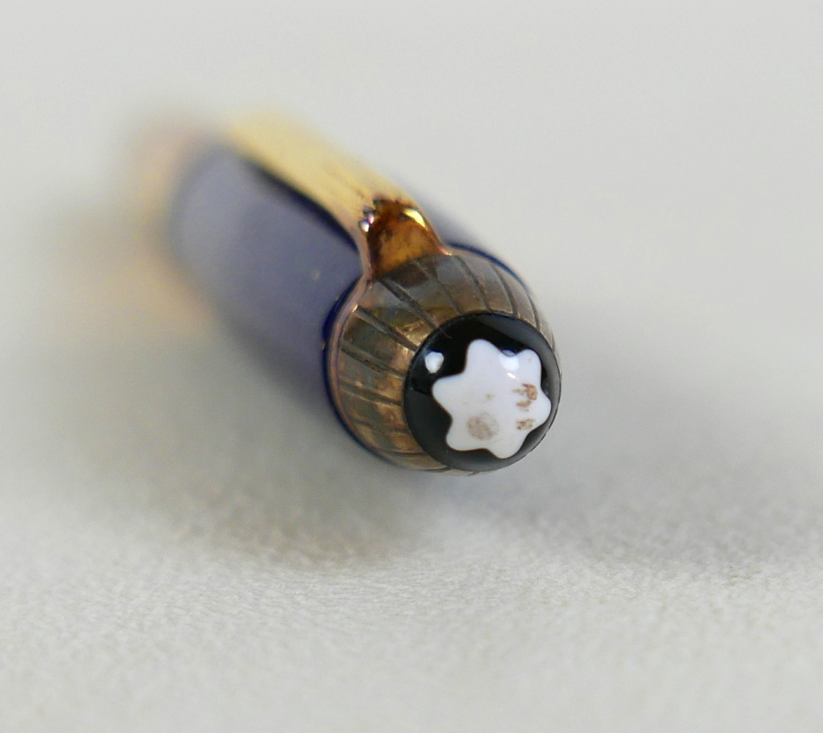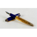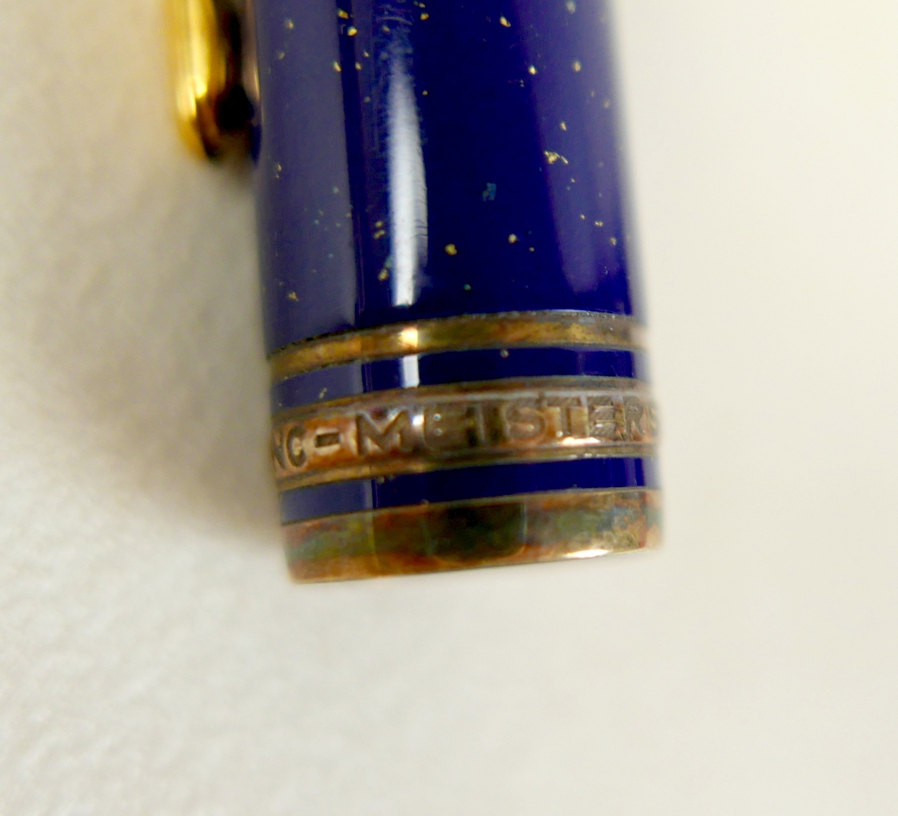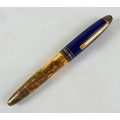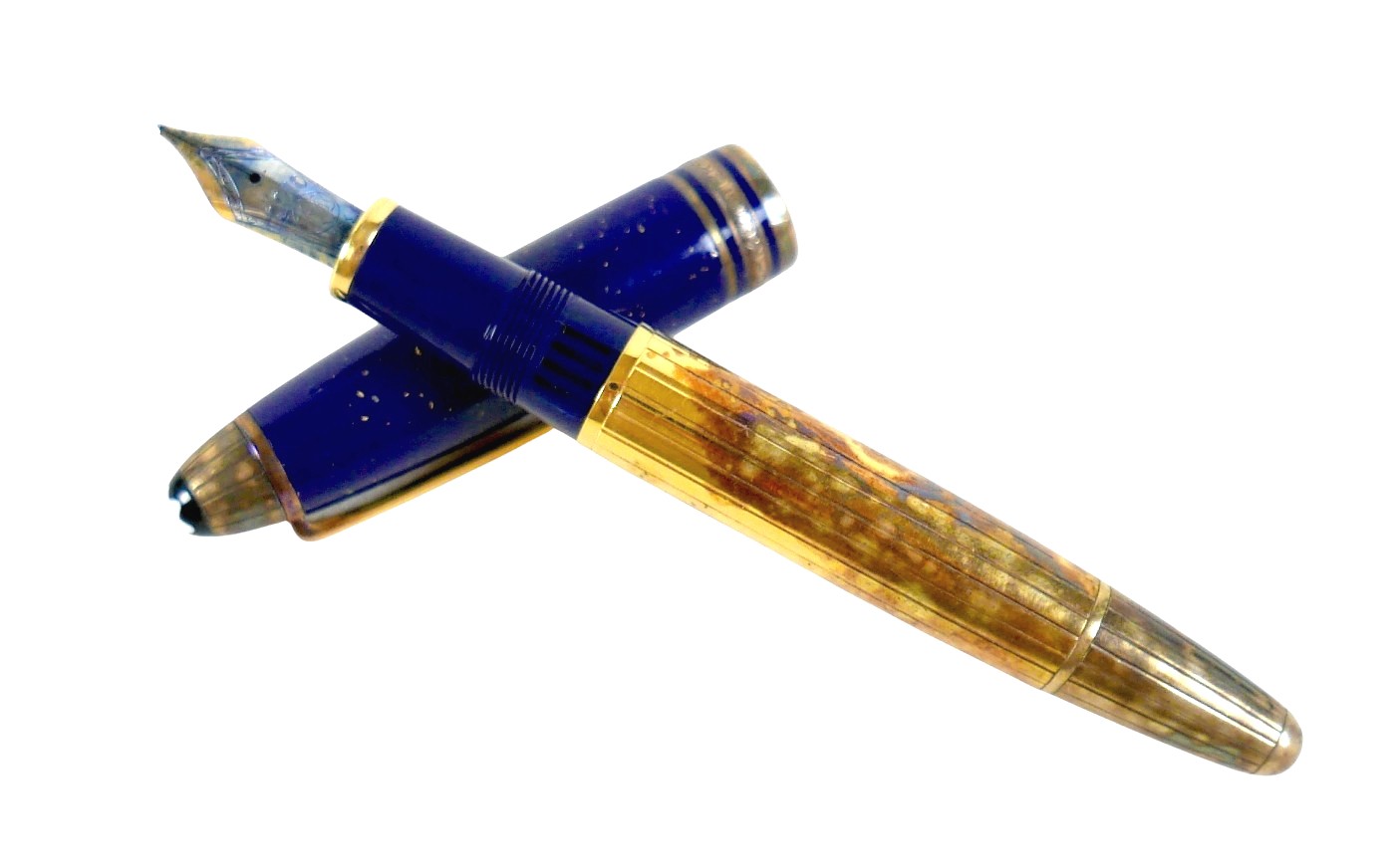 A Montblanc Meisterstuck Montblanc No 146 Solitaire Ramses II Lapis Lazuli Le Grand fountain pen, circa 1990s, 18k two tone 4810 M (medium) nib, cartridge fill, silver gilt 'vermeil' barrel with gilt fittings, lapis lazuli style blue lacquer and gilt flecked cap and grip, 14.0cm.
