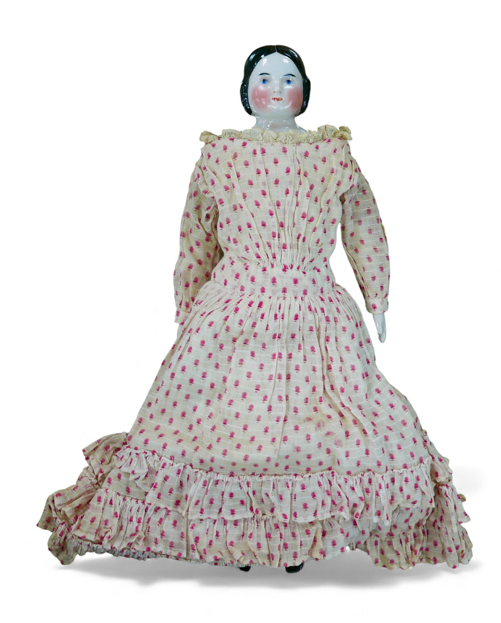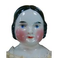 A 19th century German porcelain shoulder-head pink tinted doll, with Covered wagon style painted hair, 14 1/2" (37cm) high.
