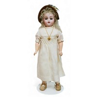 An early 20th century J. D. Kestner style bisque headed doll, glass eyes, closed mouth, impressed marks to the back of head 'JDK 221..', 14 1/2" (36cm) high.
