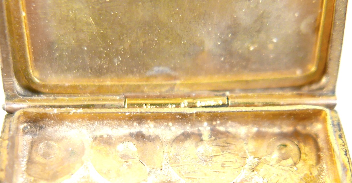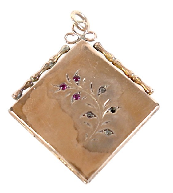 A ruby-set gilt metal locket, 3cm square, marked '9ct gold back & front' and stamped 'silver setting', 10.4g.