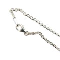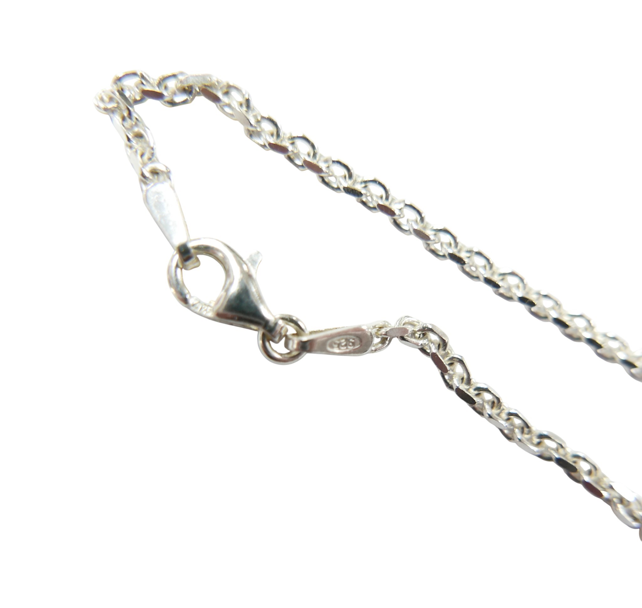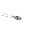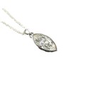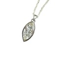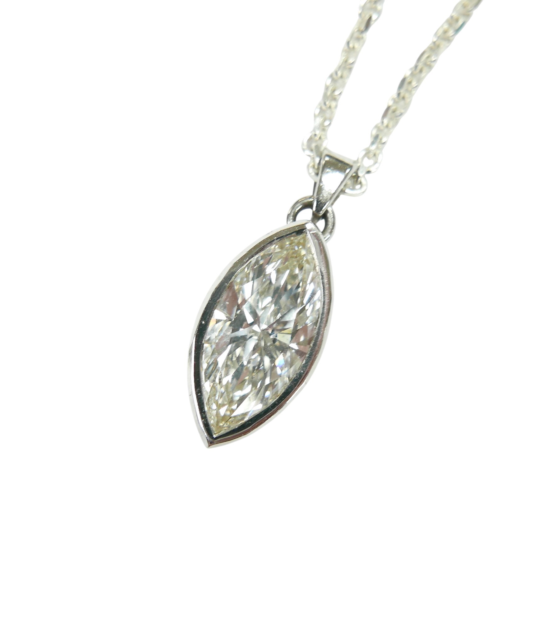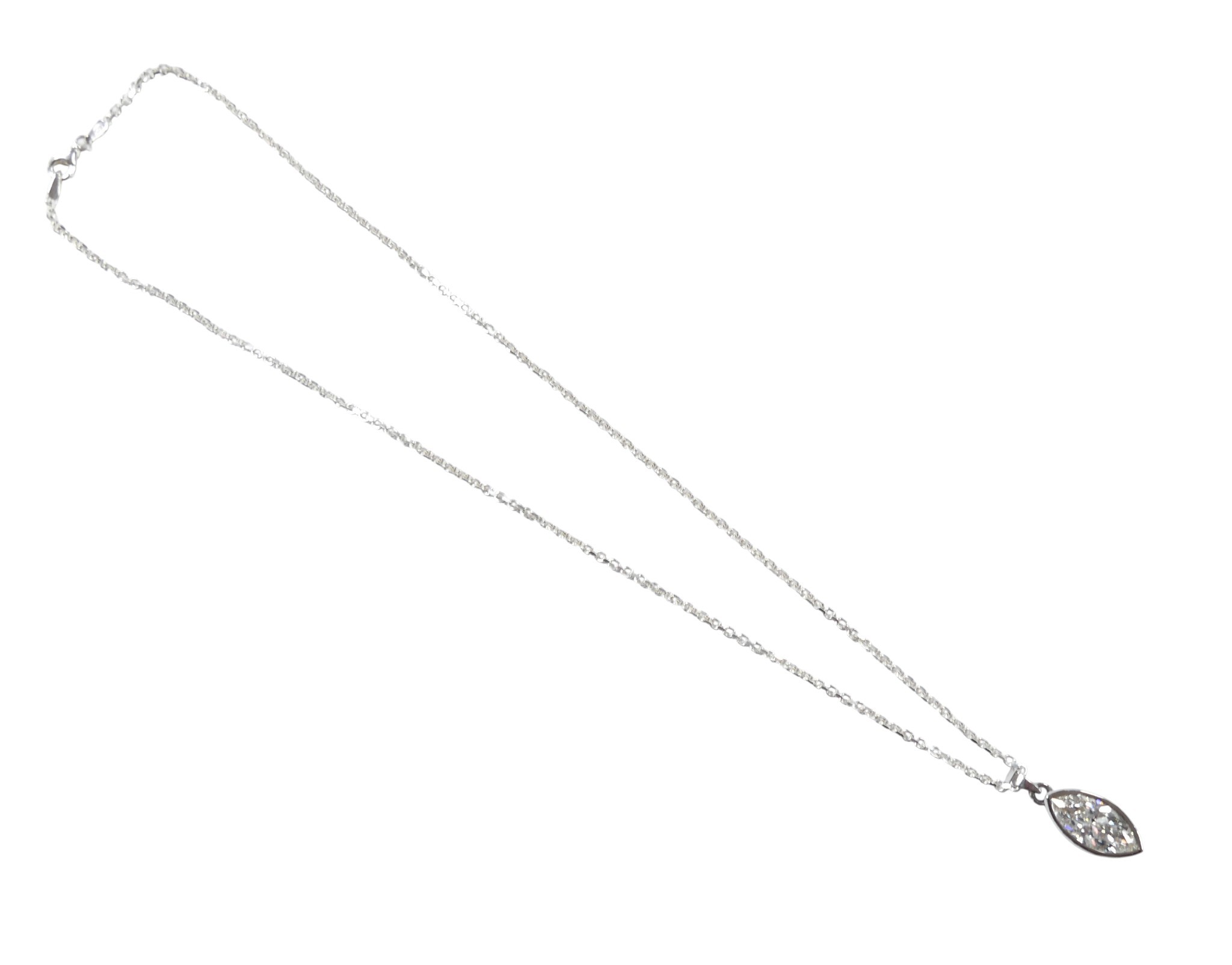 A large navette cut diamond pendant, stone 8.5 by 5 by 16mm approximately 4.3ct, overall pendant weight 3.2g, with white metal mount and silver chain necklace.