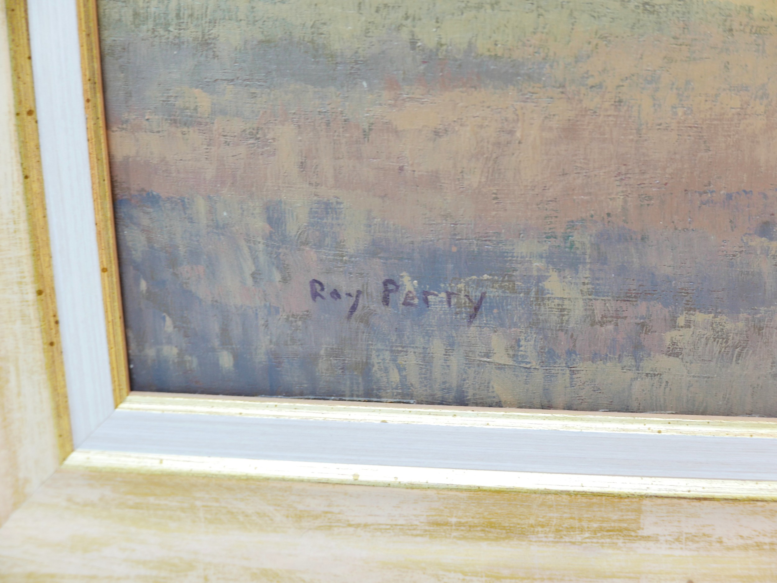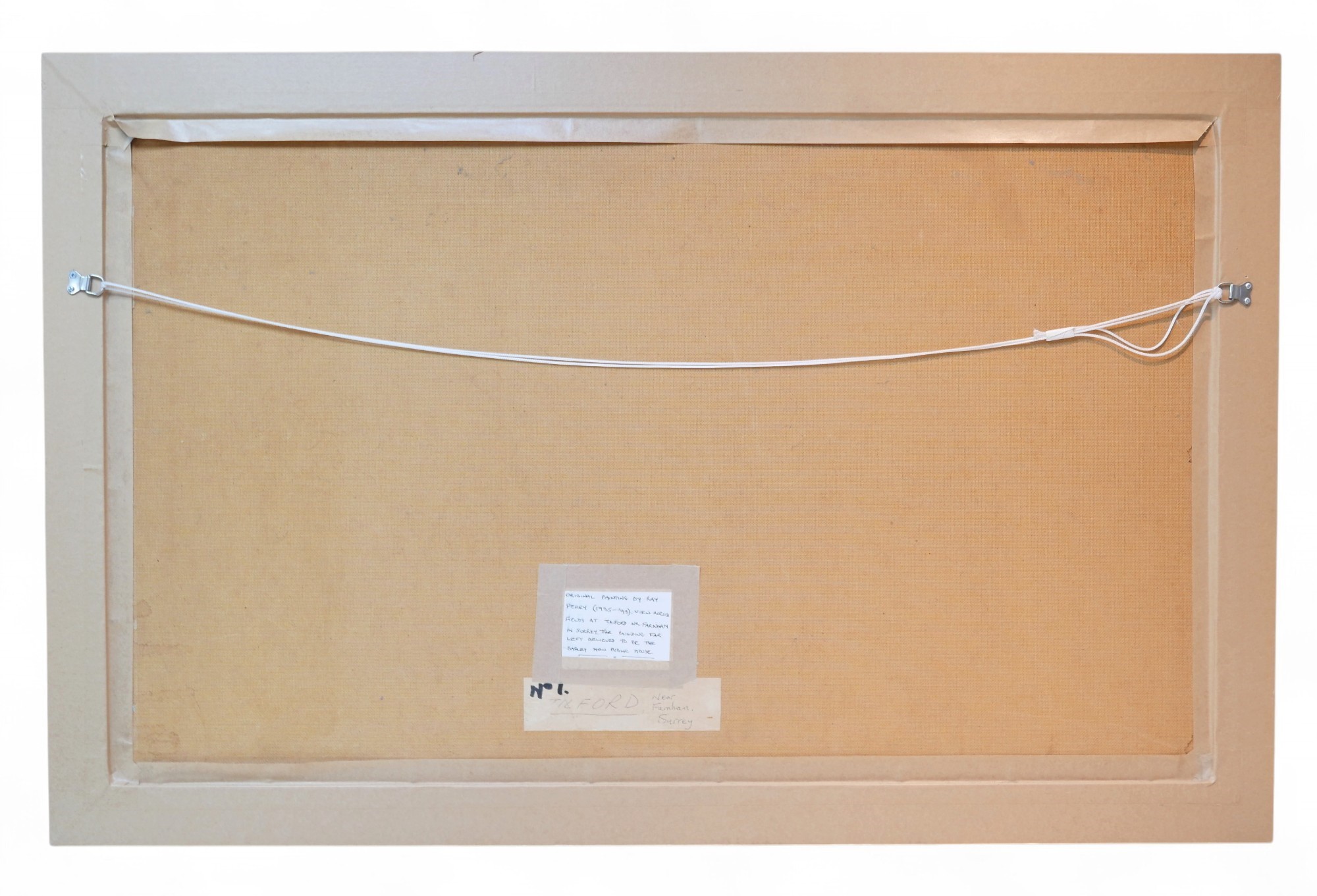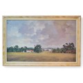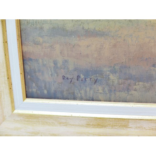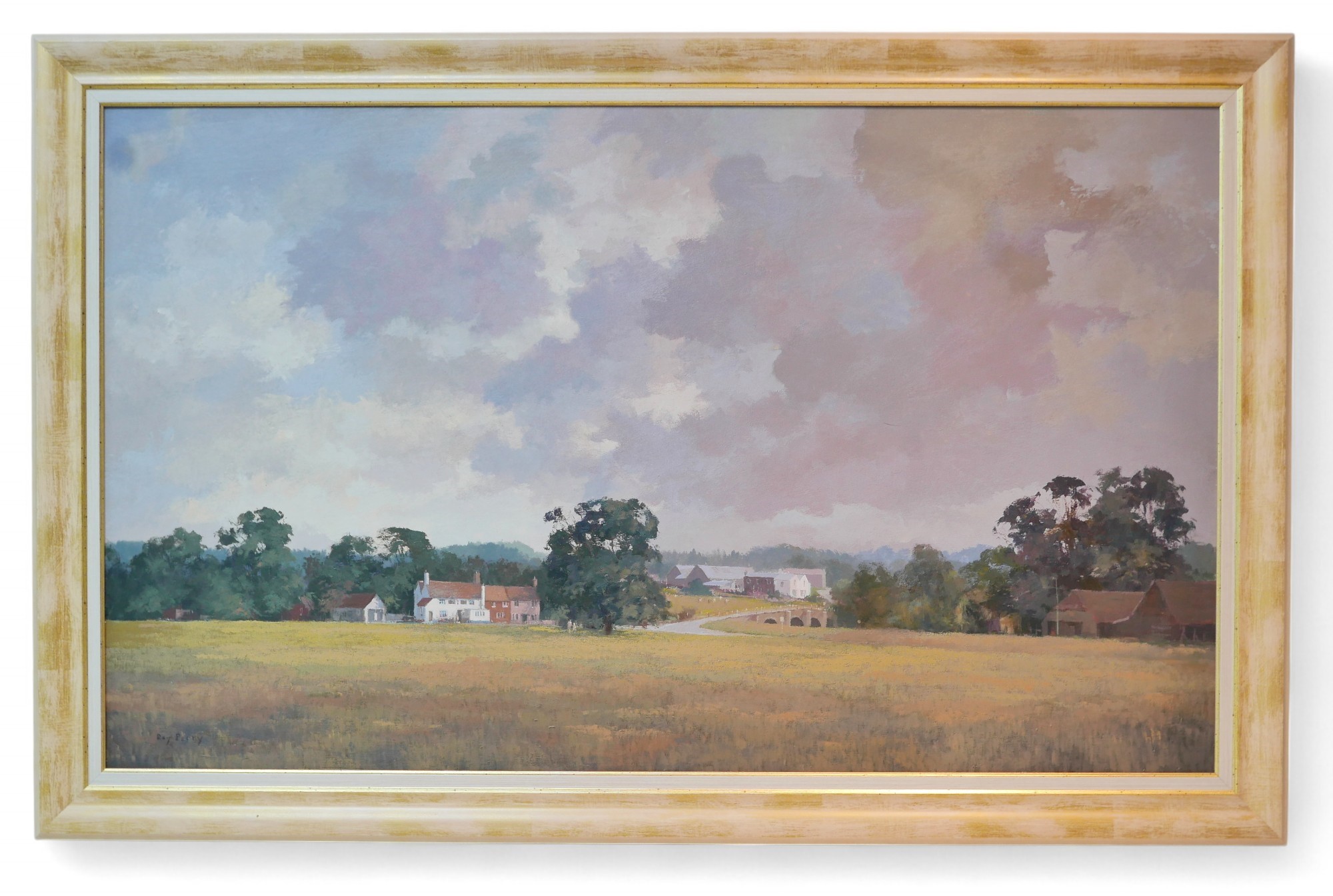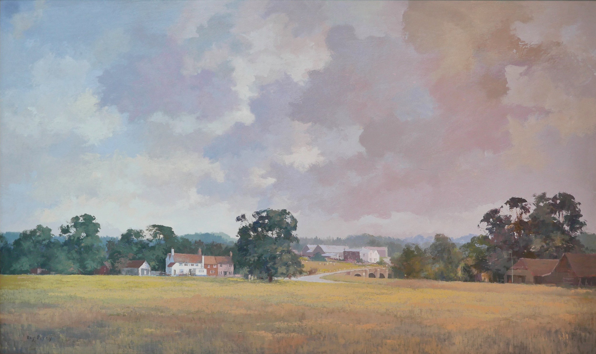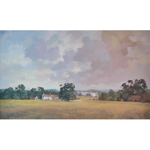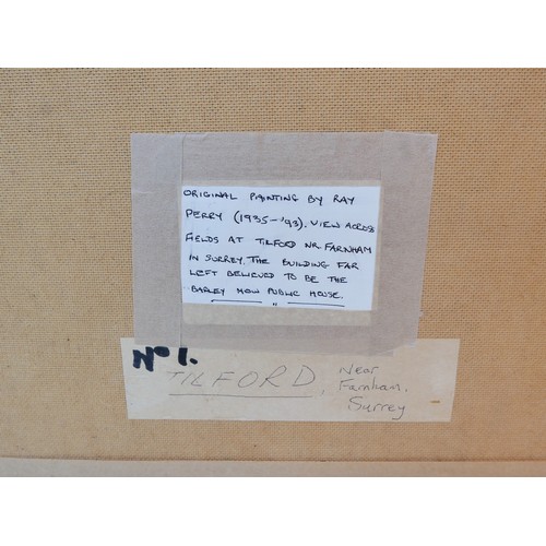 Ray Perry (British, 1935-1993): Tilford fields, oil on board, 59.5 by 100.5cm, framed, 72.5 by 112.5cm.