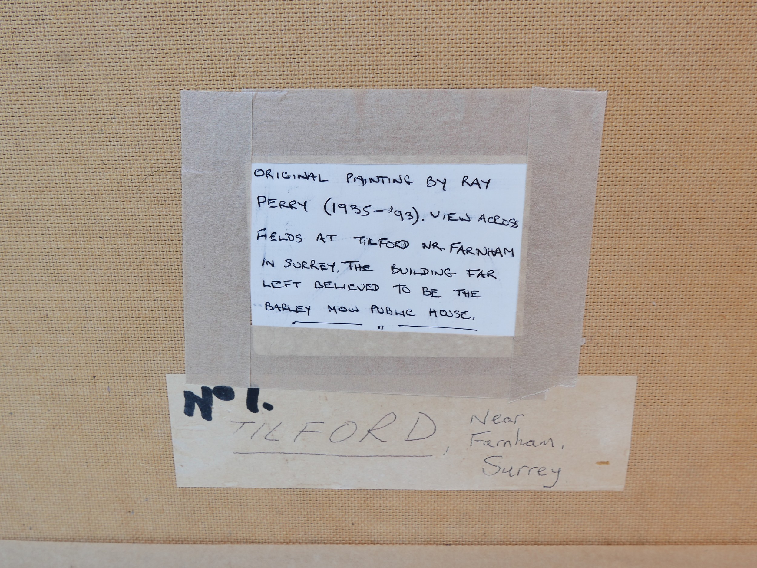Ray Perry (British, 1935-1993): Tilford fields, oil on board...