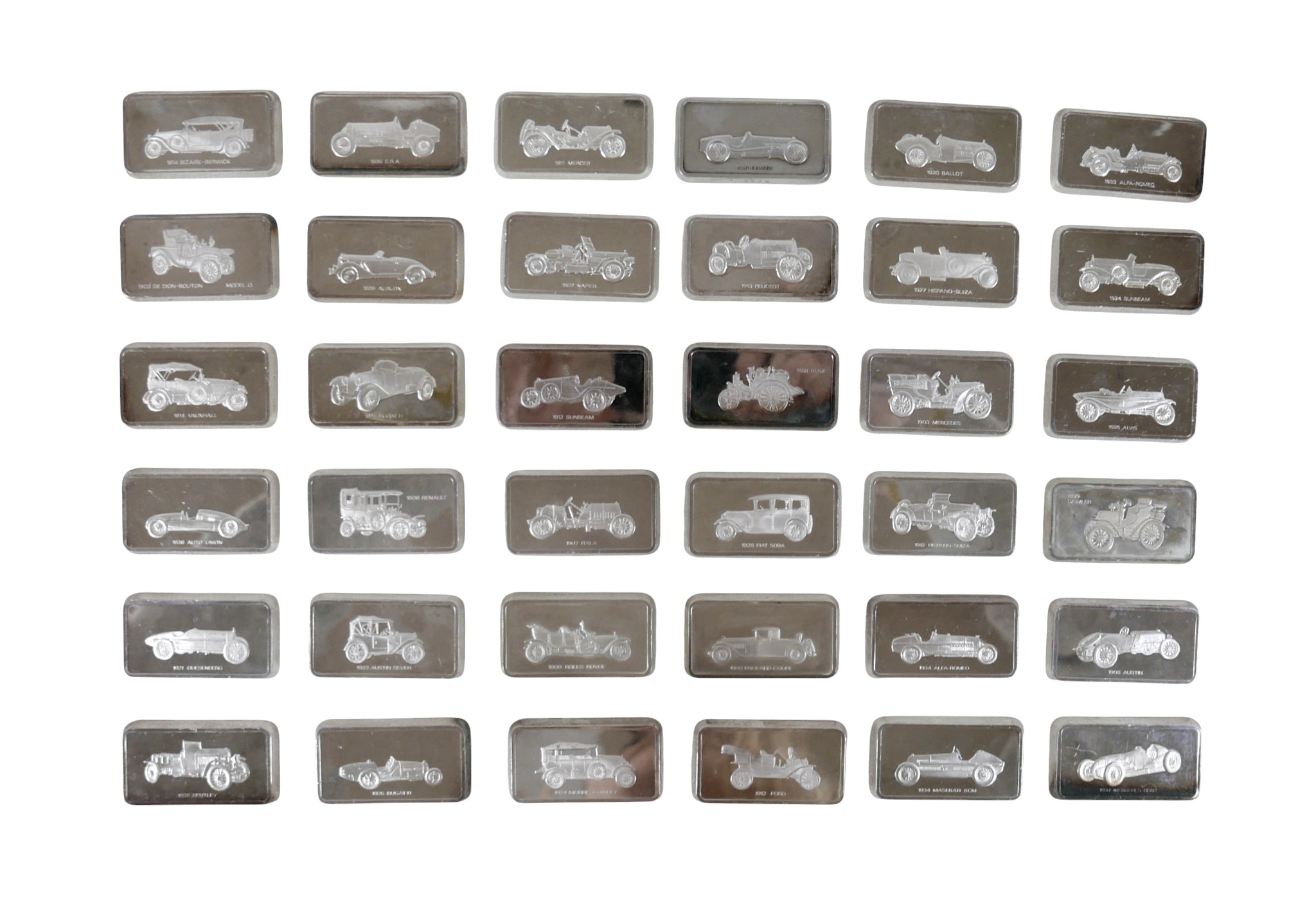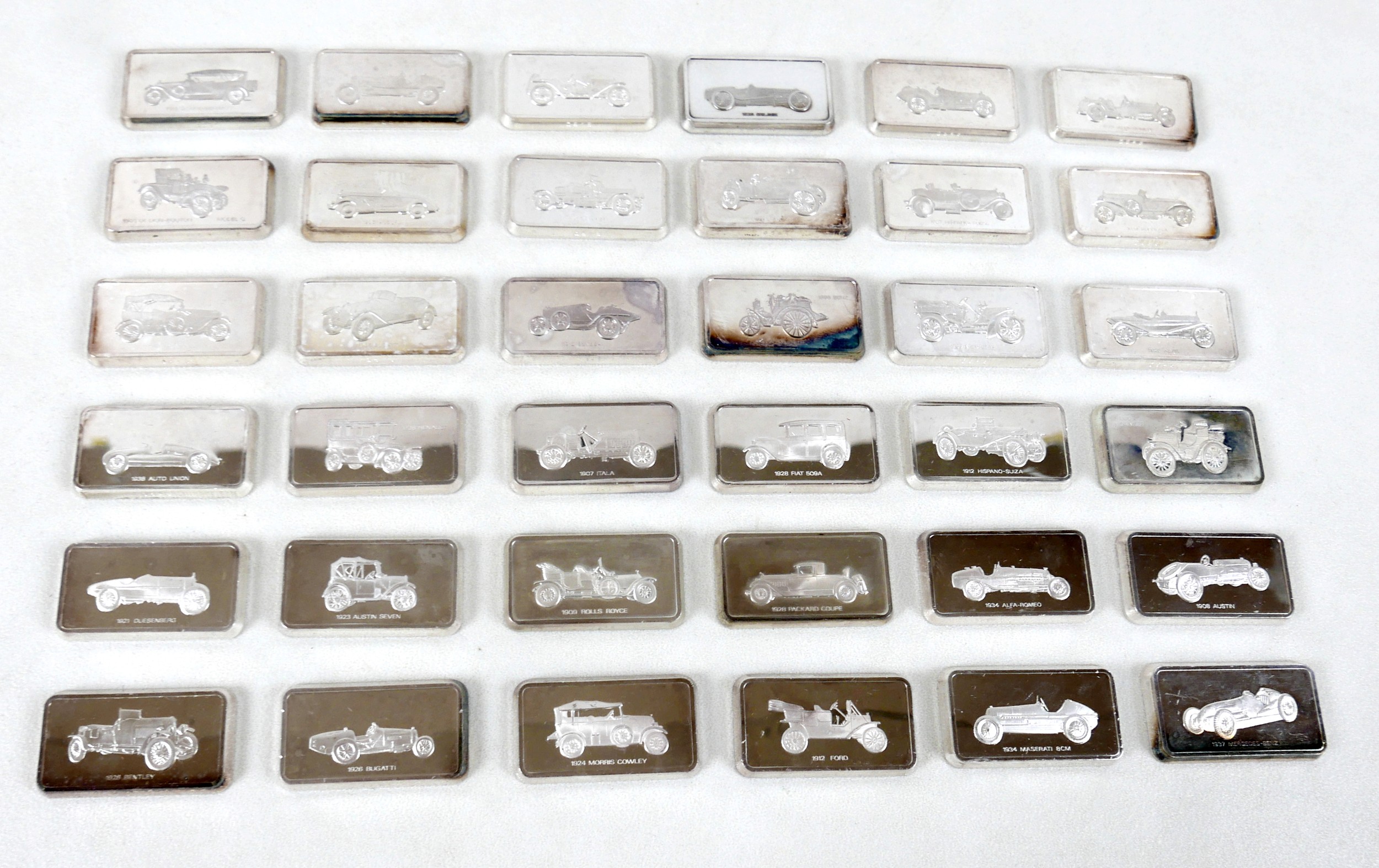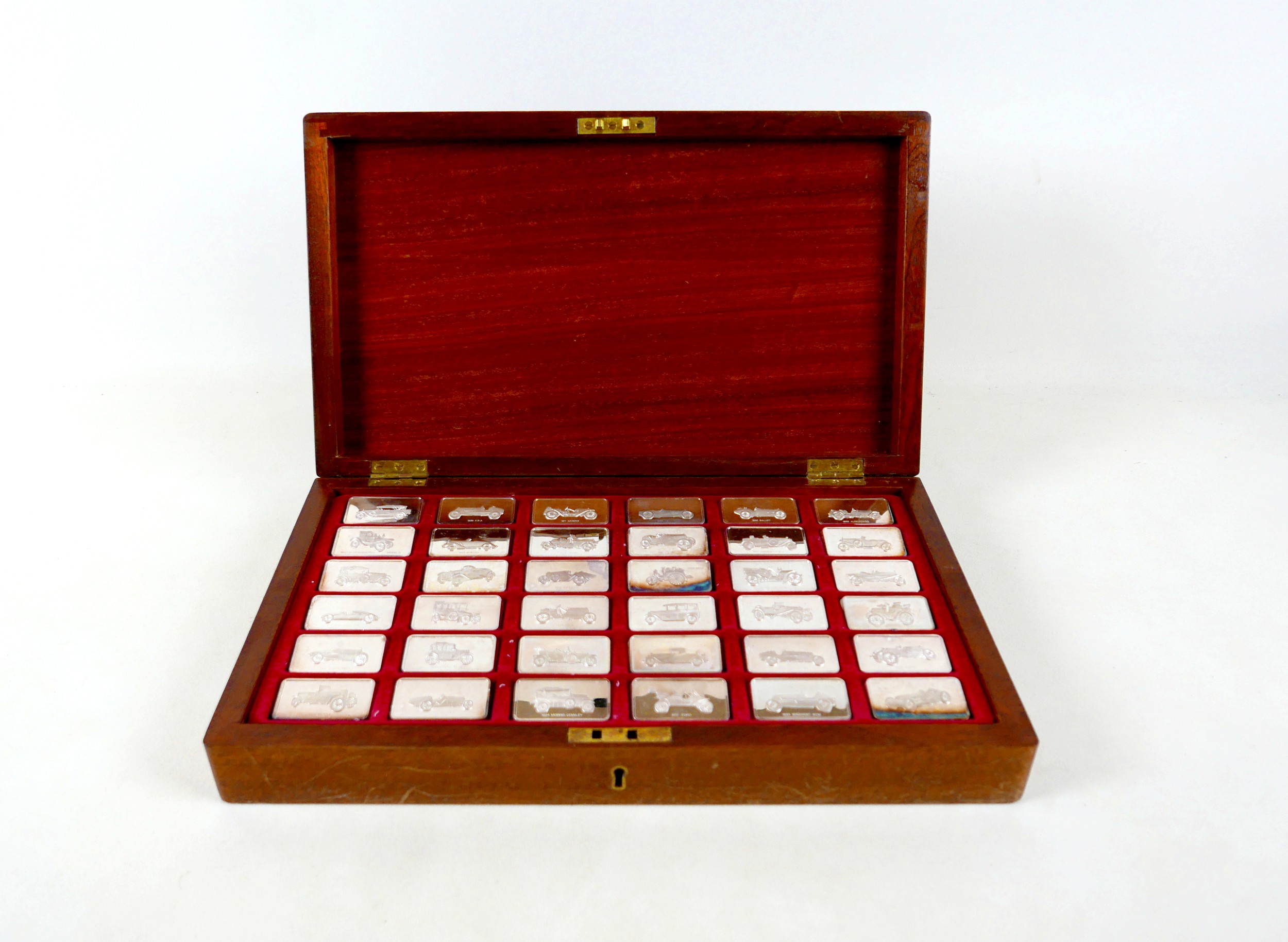A collection of thirty-six silver ingots, commemorating the collection at 'The National Motor Museum at Beaulieu', issued by John Pinches Medallists Ltd, London various dates (early 1990s), 77.4toz, each ingot approximately 2.15toz, 29 by 52 by 4.5mm, in wooden, red lined and fitted presentation case, 41.5 by 21.5 by 7.2cm high.