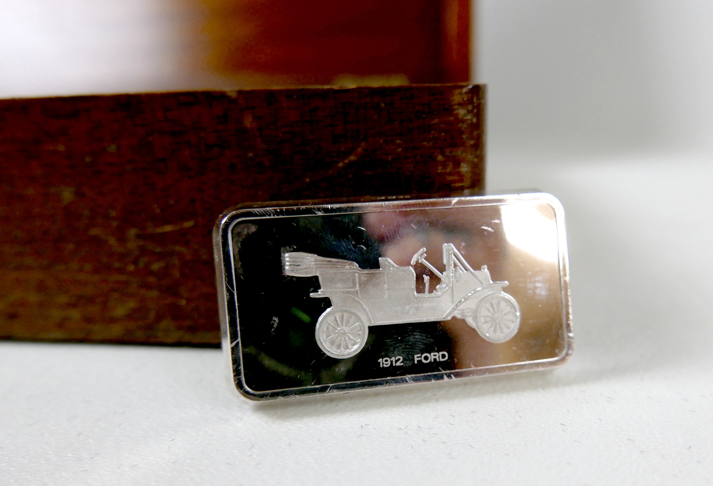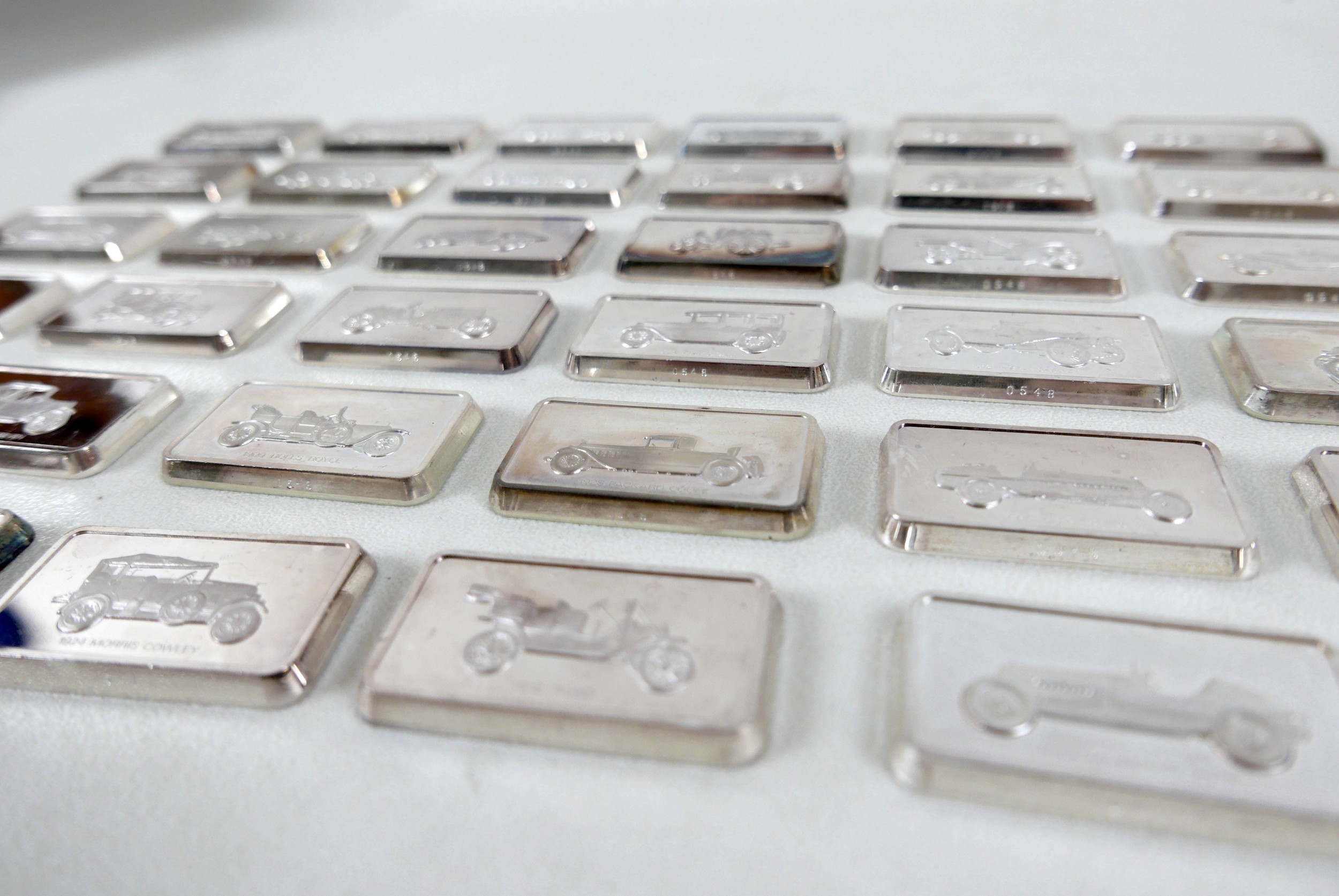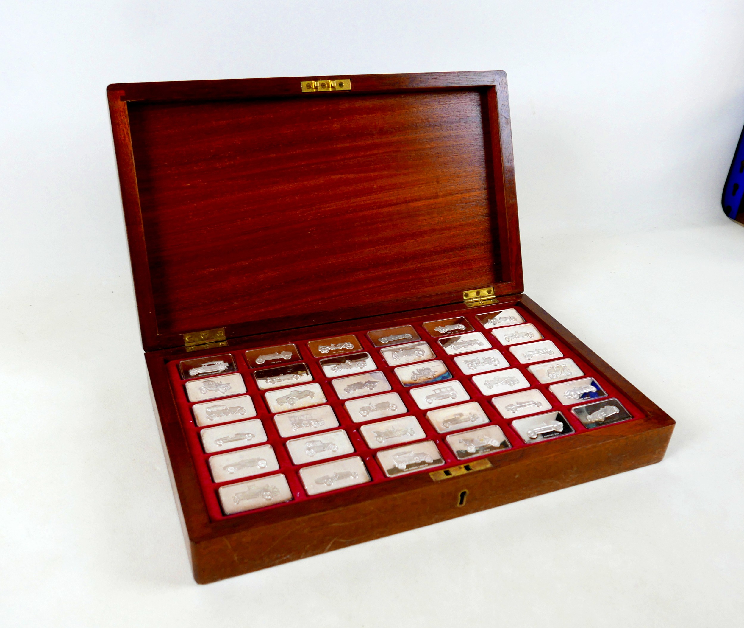 A collection of thirty-six silver ingots, commemorating the collection at 'The National Motor Museum at Beaulieu', issued by John Pinches Medallists Ltd, London various dates (early 1990s), 77.4toz, each ingot approximately 2.15toz, 29 by 52 by 4.5mm, in wooden, red lined and fitted presentation case, 41.5 by 21.5 by 7.2cm high.