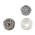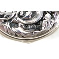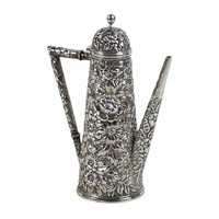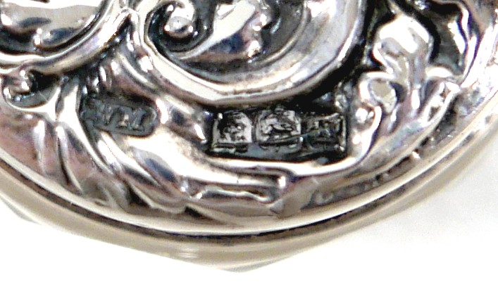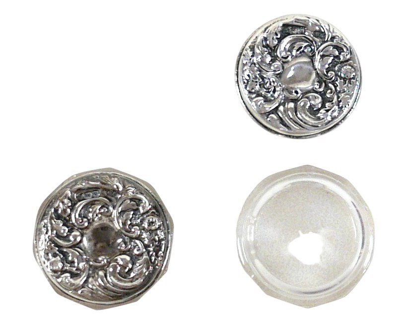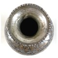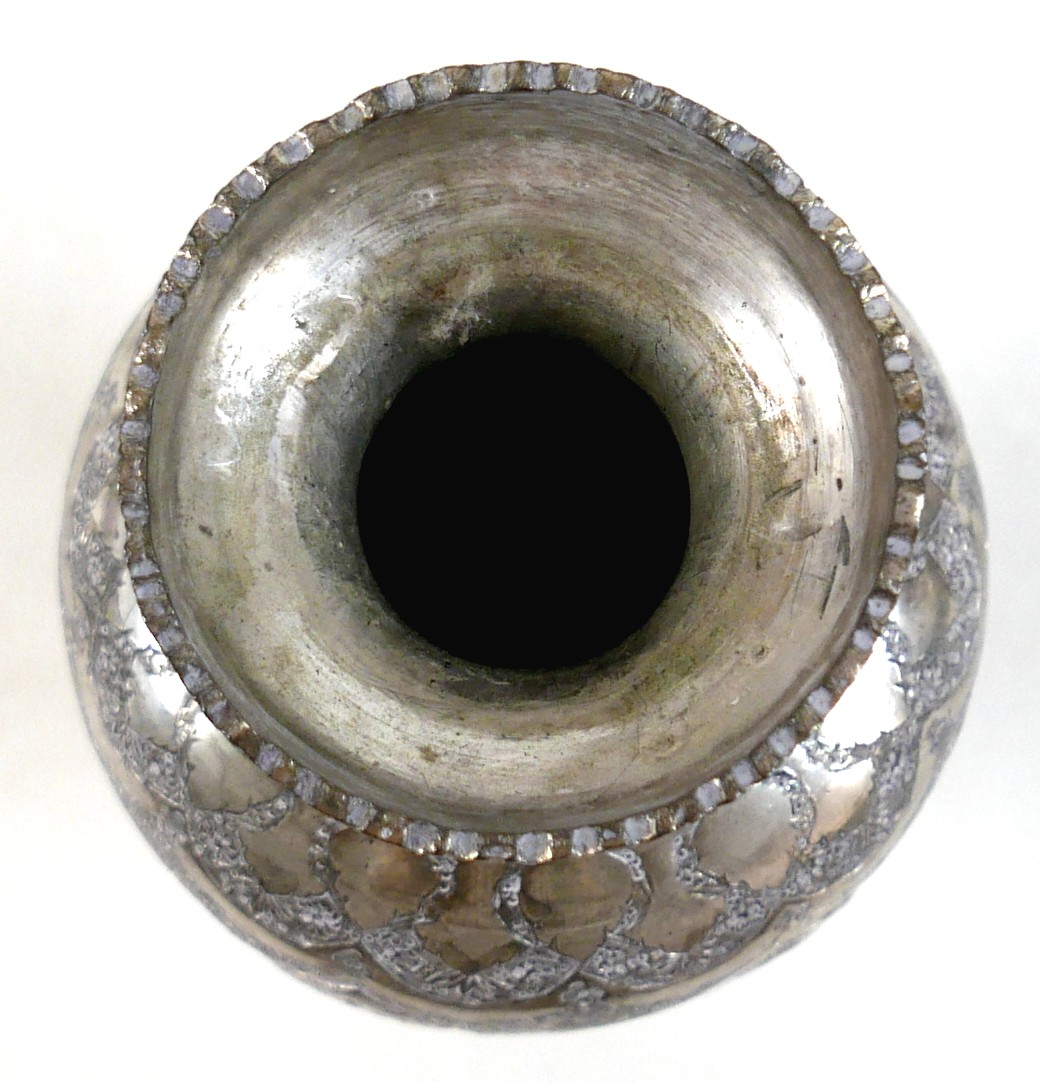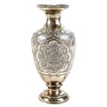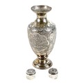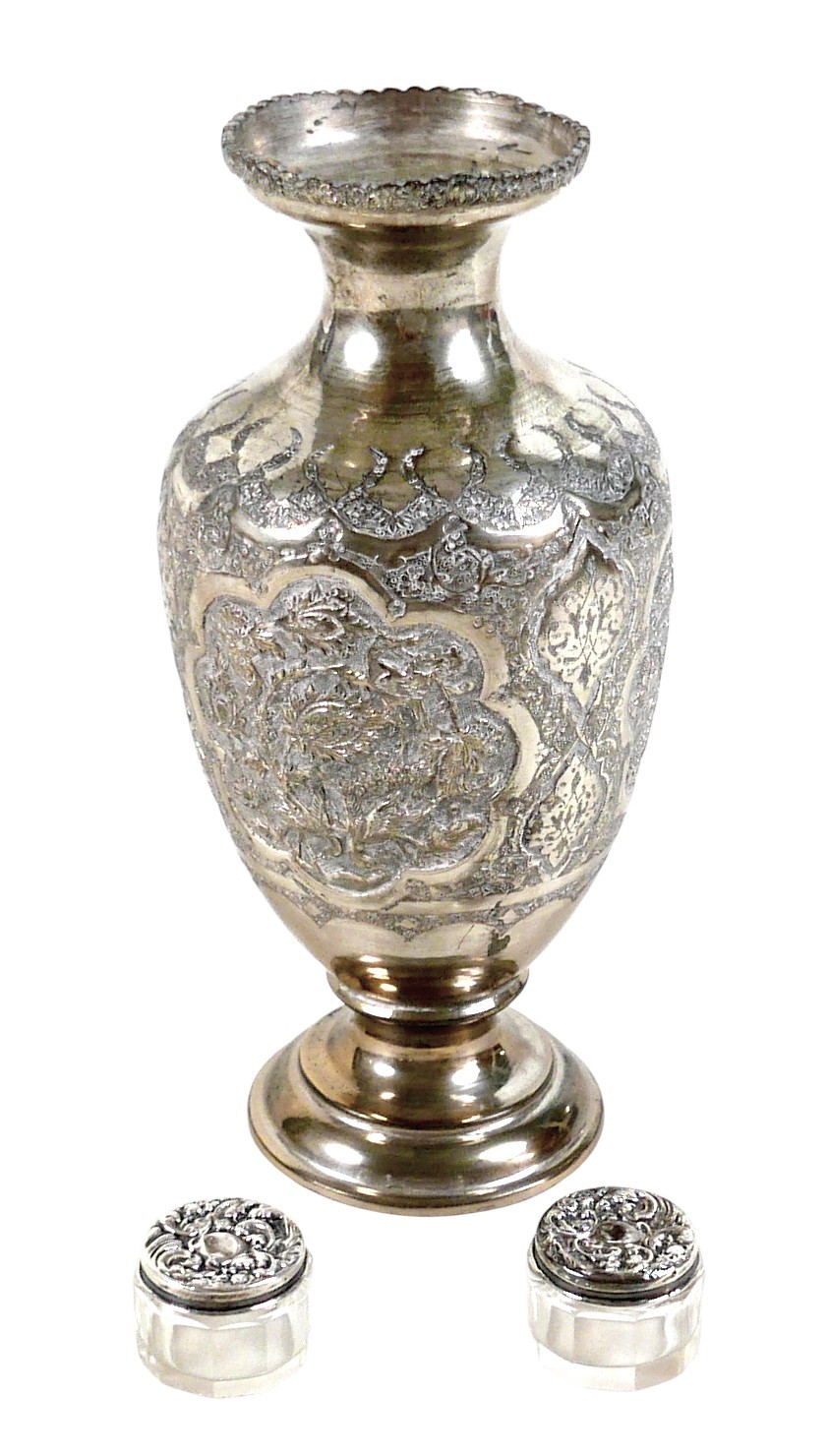 A white metal eastern vase and two small silver top glass pots, the vase of baluster form decorated with birds and flowers in shaped panels and eastern cartouches, 20cm high, 10.8 troy oz, marked JV to base, silver tops 0.09 troy oz.(3)