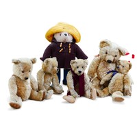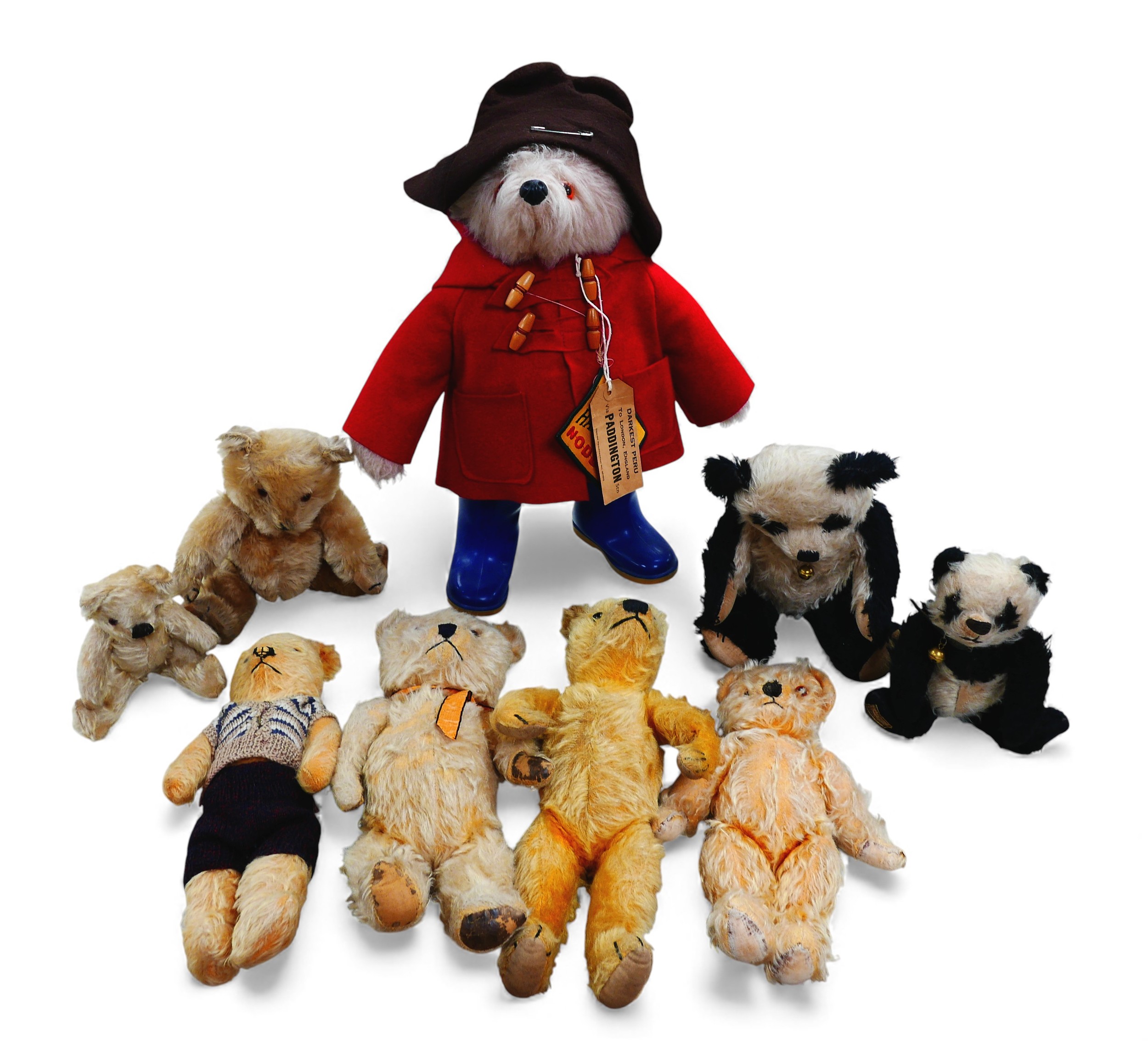 A Gabrielle Designs Paddington bear, with Dunlop boots, 47cm high overall, and eight smaller bears including two pandas, some heavily play worn. (1 box)