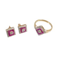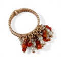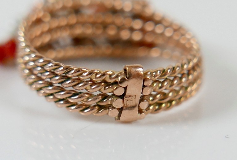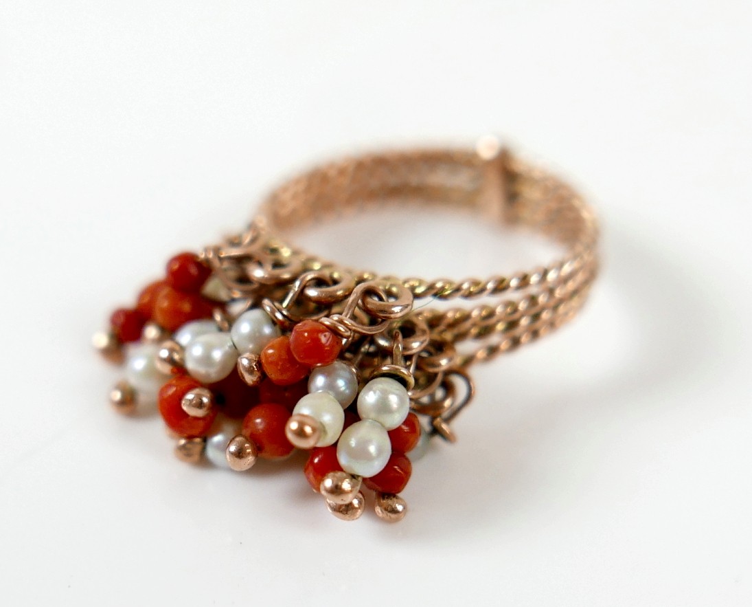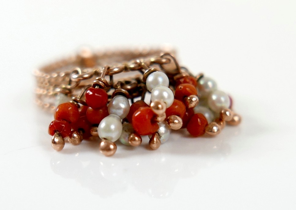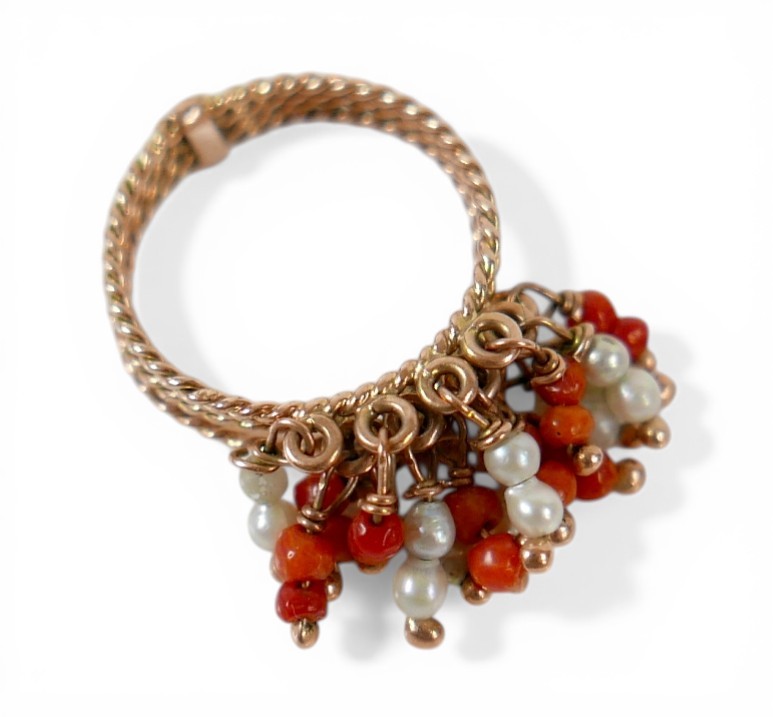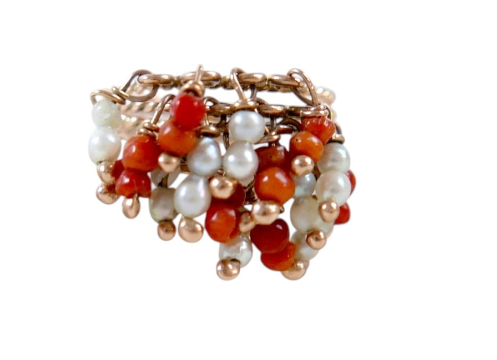 An Egyptian gold coral and pearl ring marks for 18ct, size M...