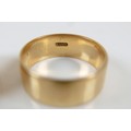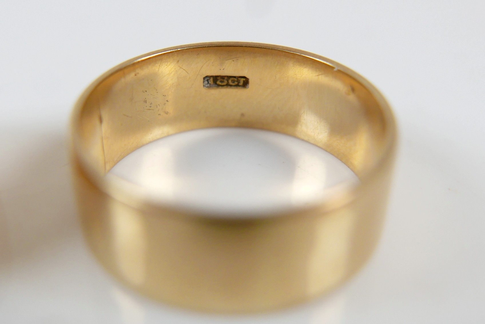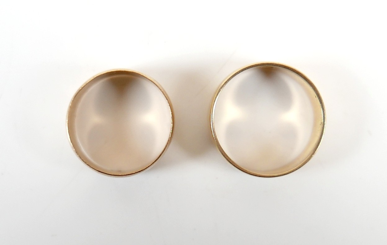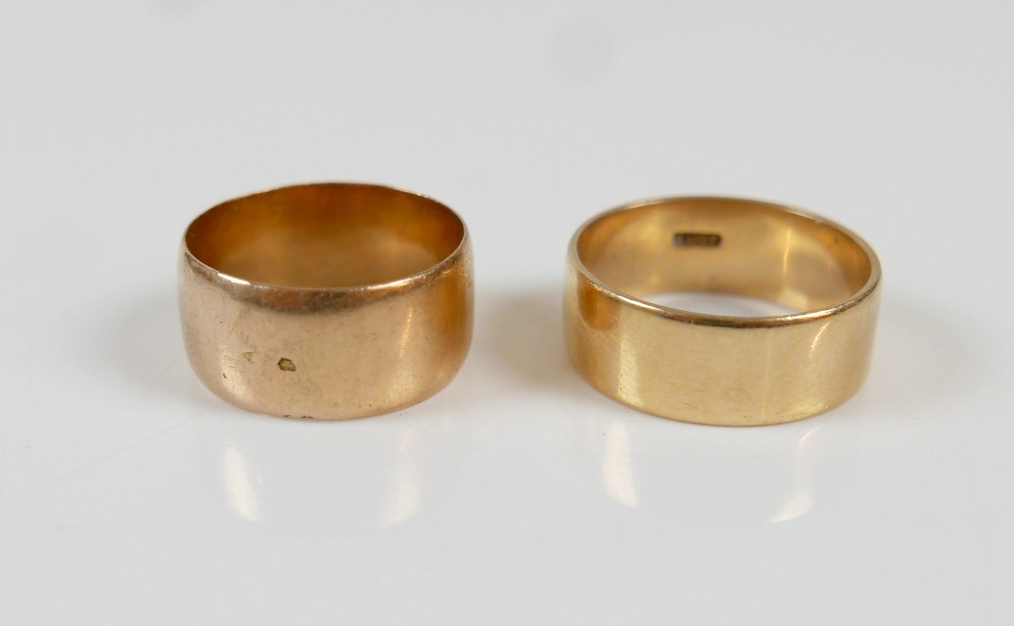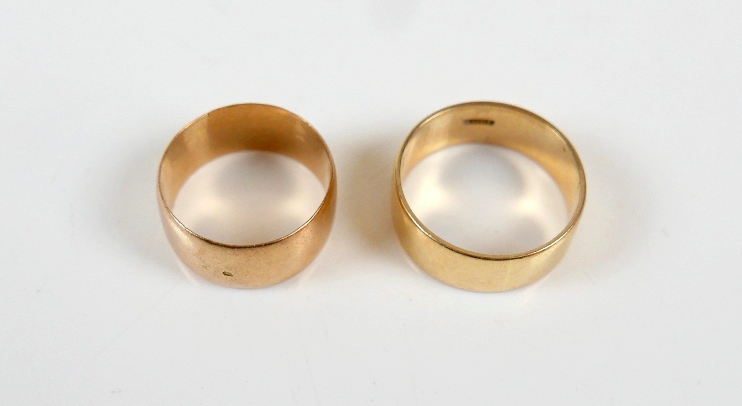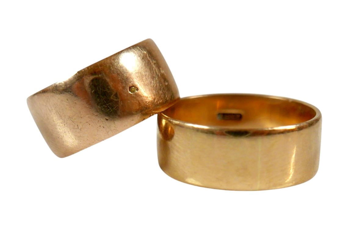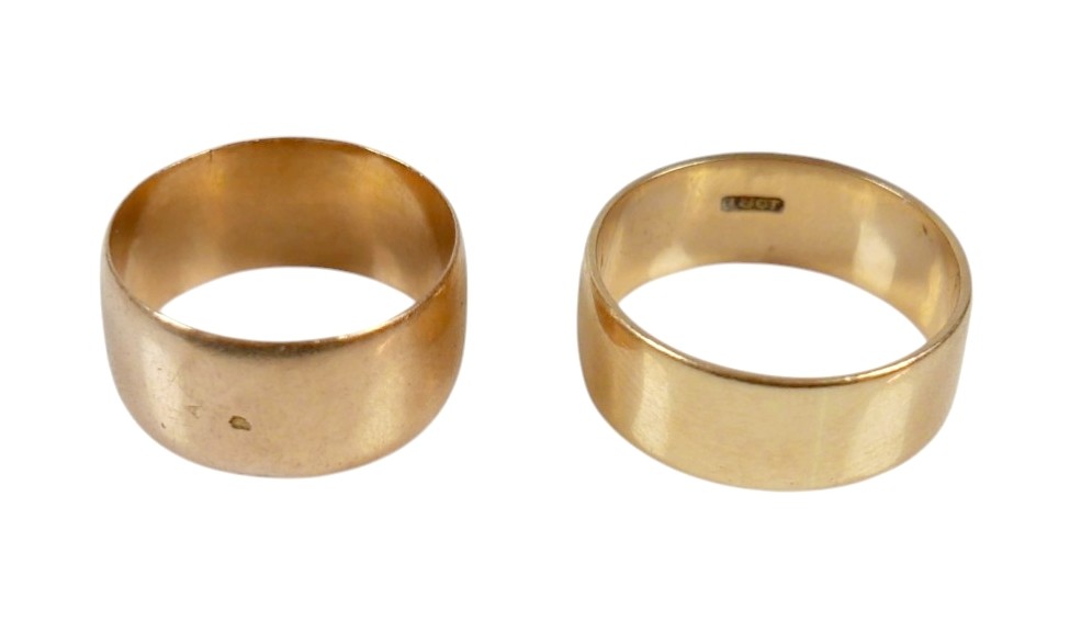 Two yellow gold band rings comprising an 18ct ring size S/T, 7.5mm band, 6.7g, and another size O, 9mm band, 6.2g surface tests to approximately 18ct.(2)