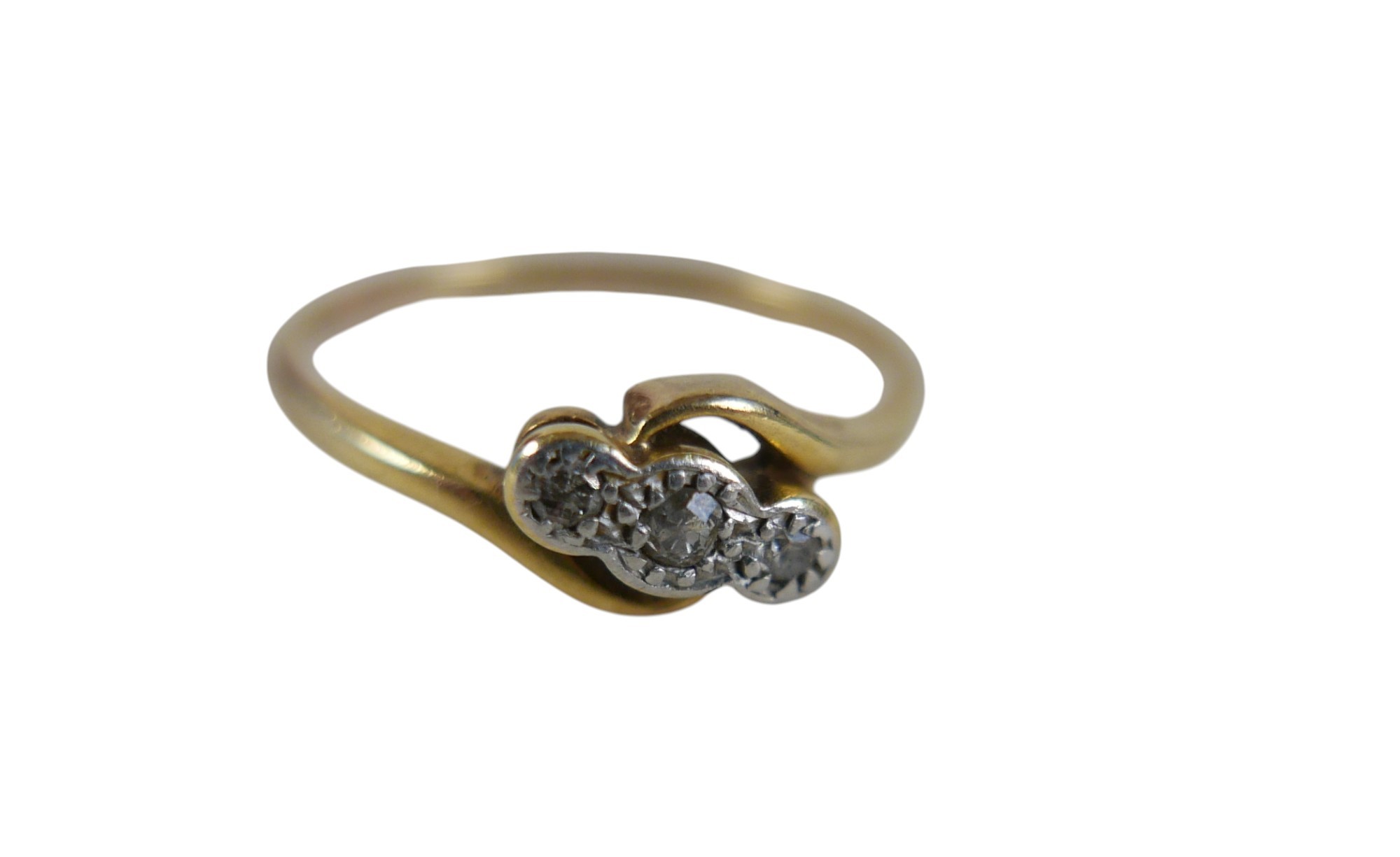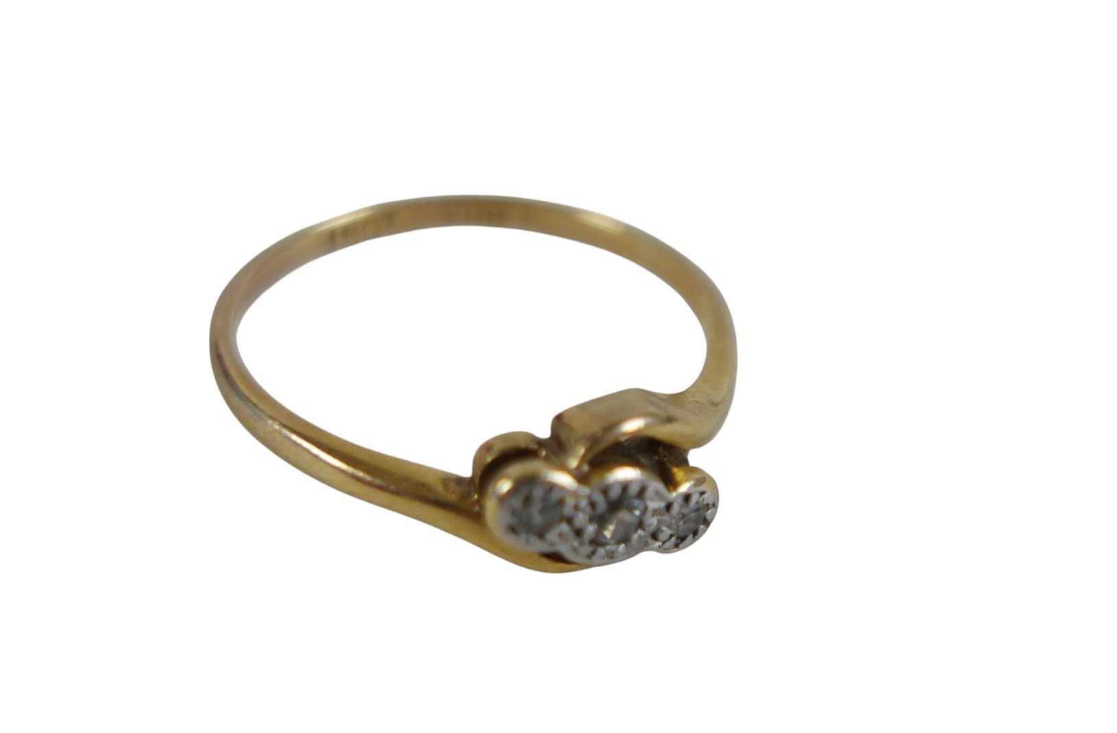 An 18ct gold three stone diamond ring, size L, 2.0g.