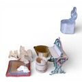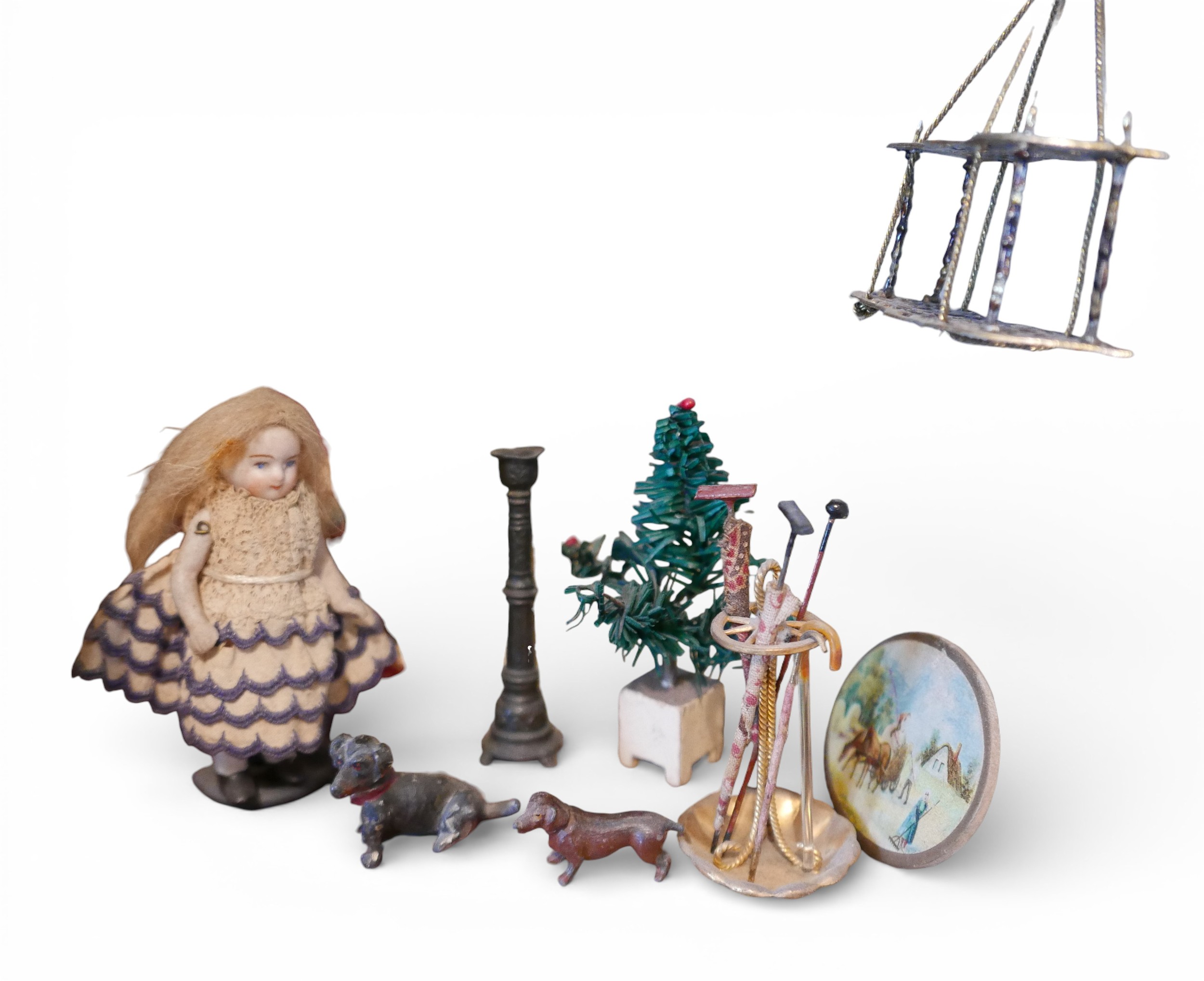 A group of doll's house accessories, including three figures, a mangle, umbrella stand, and dogs. (1 box)