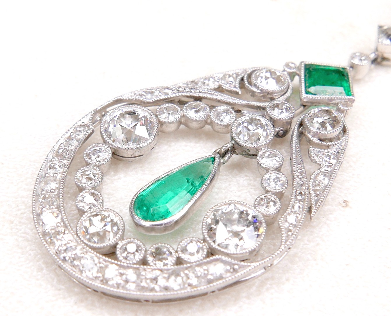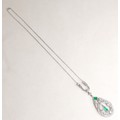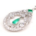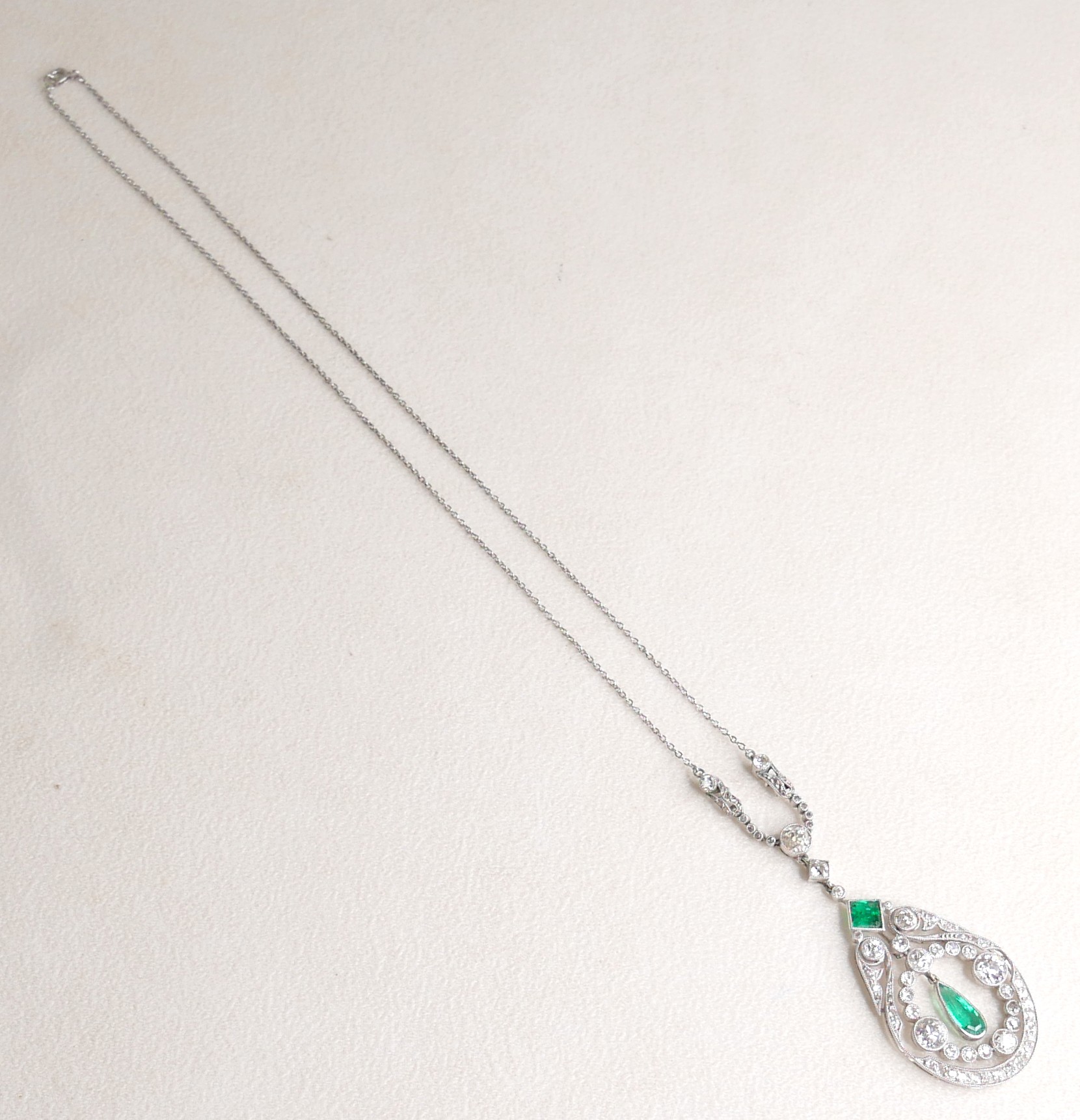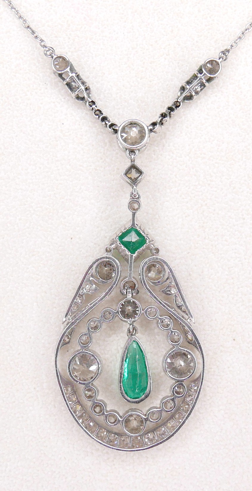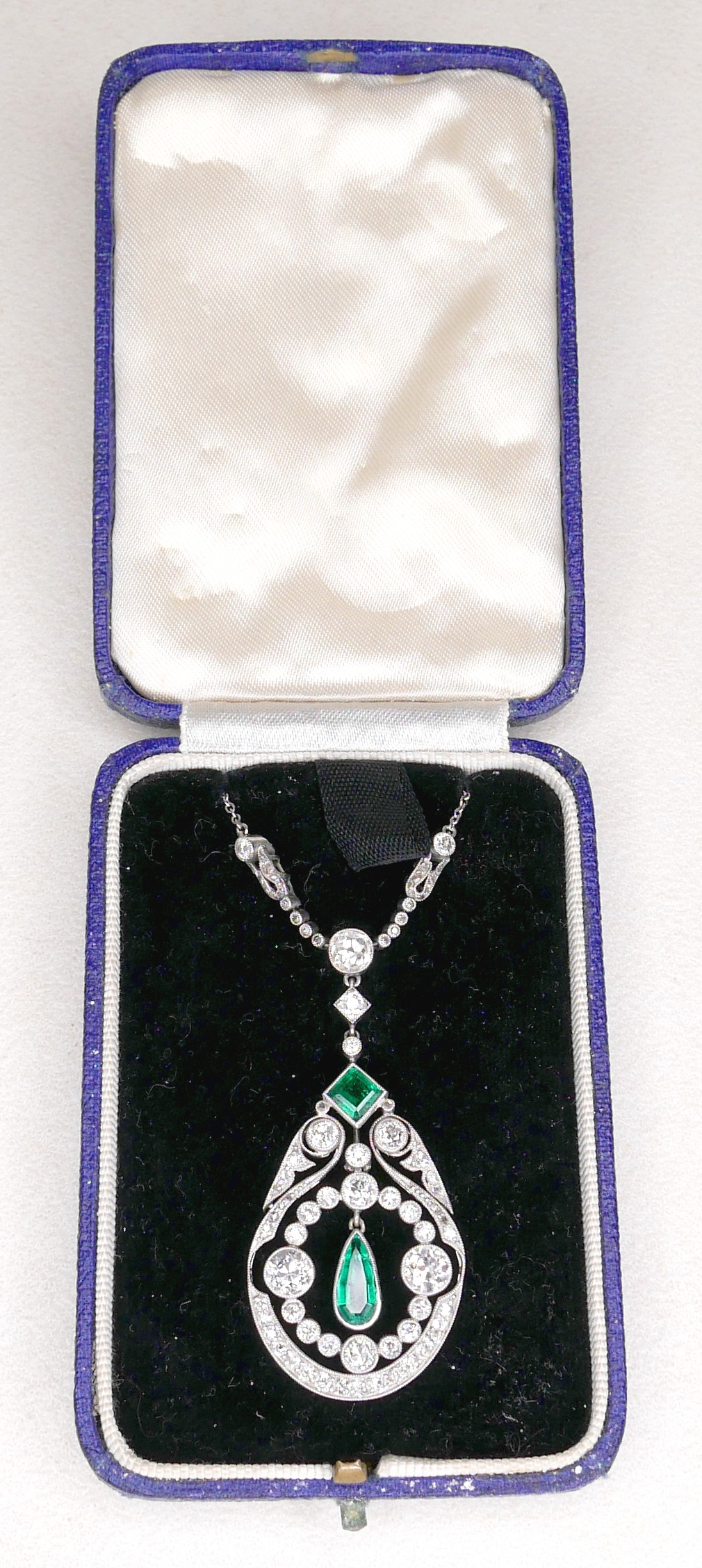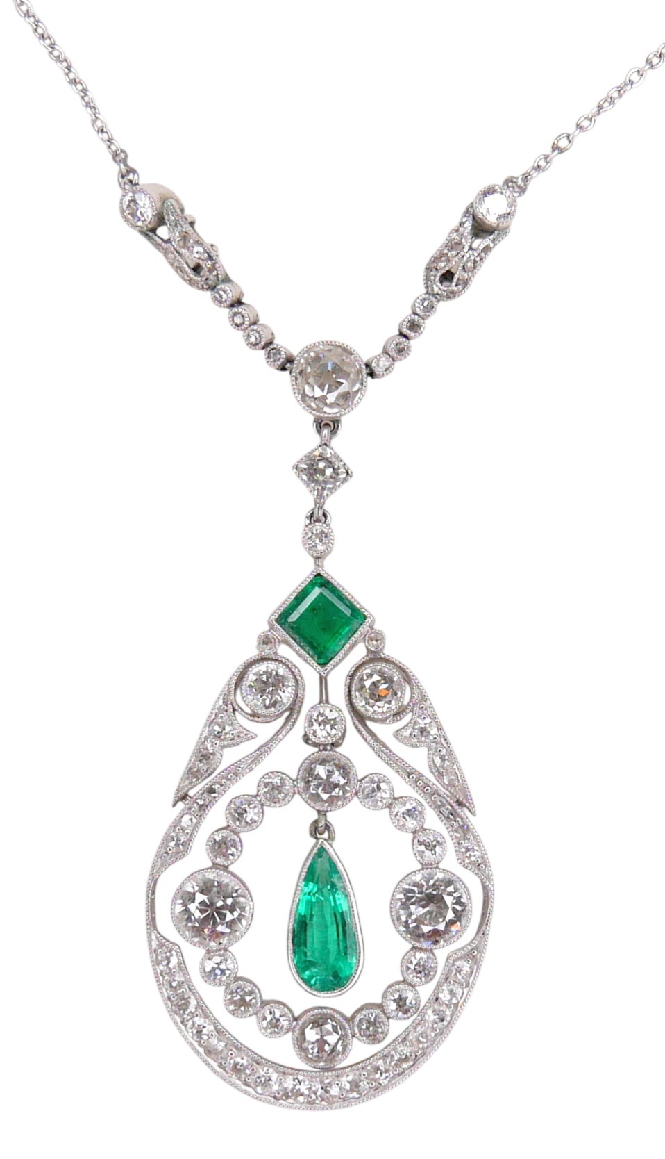 A French Belle Epoque white metal pendant, circa 1900, set with diamonds and emeralds, of teardrop form with open ring of conjoined diamonds in millegrain settings, the two principle round faceted cut stones each approximately 0.57ct, 5.0 by 3.5mm, centred by a pear cut emerald, in pendant rubover setting, approximately 0.5ct, 10.0 by 5.0 by 2.5mm, a further square step cut emerald above, 5 by 5 by 2.5mm, and round faceted diamonds set to the surround, on a three graduating stone set link with foliate clasped arms and further smaller diamonds, to a trace link chain with ring clasp, 43.5cm long, pendant 4.8 by 2.4 by 0.3cm, 5.2cm drop from top most diamond, 8.3g, in a later blue box.